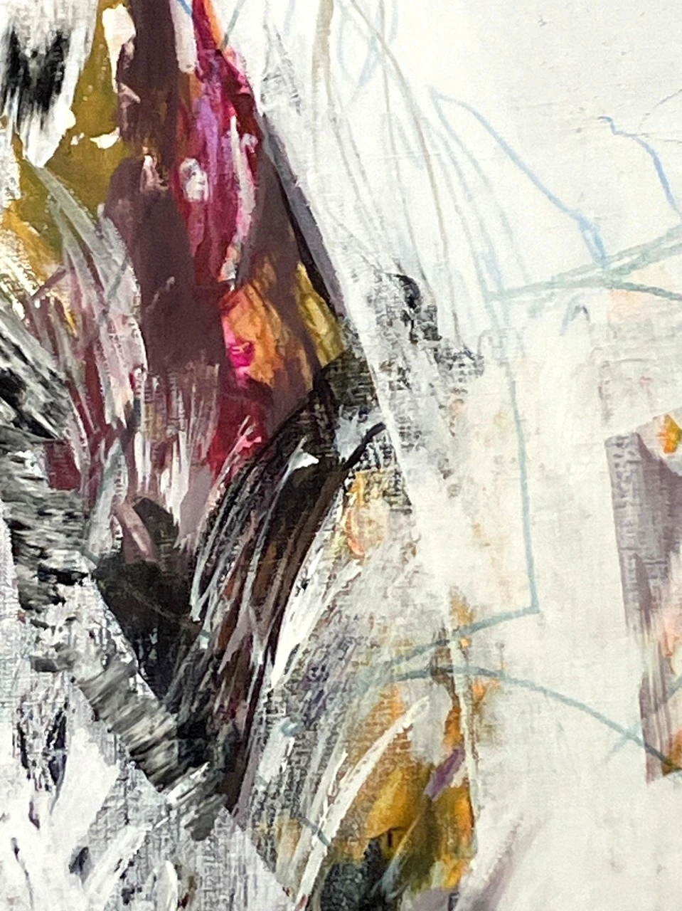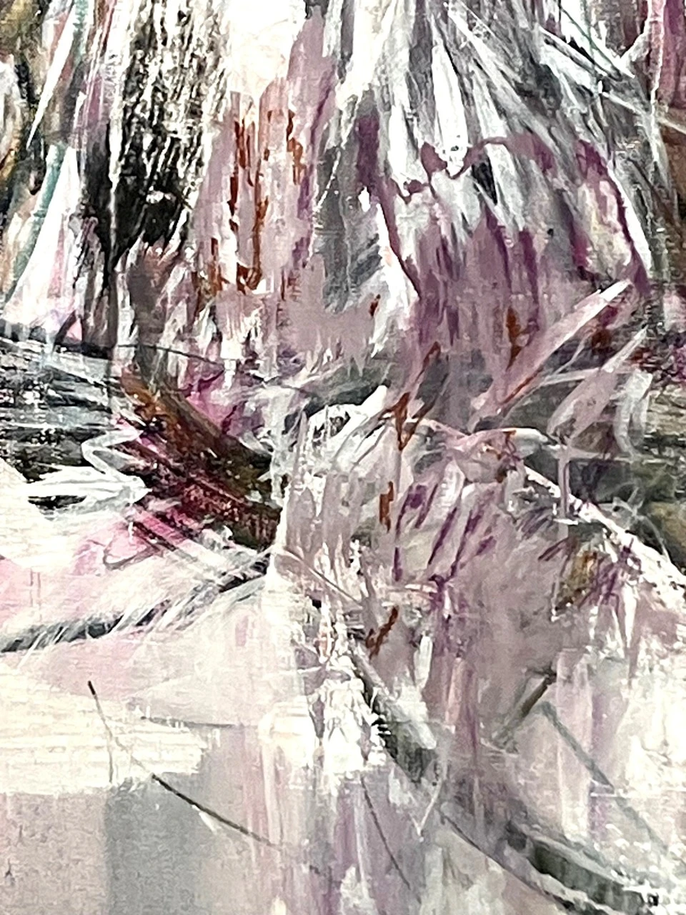Для получения эффекта многослойности и прозрачности, художница использует авторскую технику промывания монохромных слоев акрила и темперы.