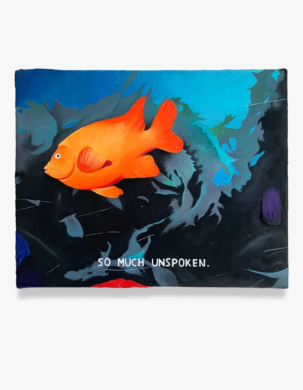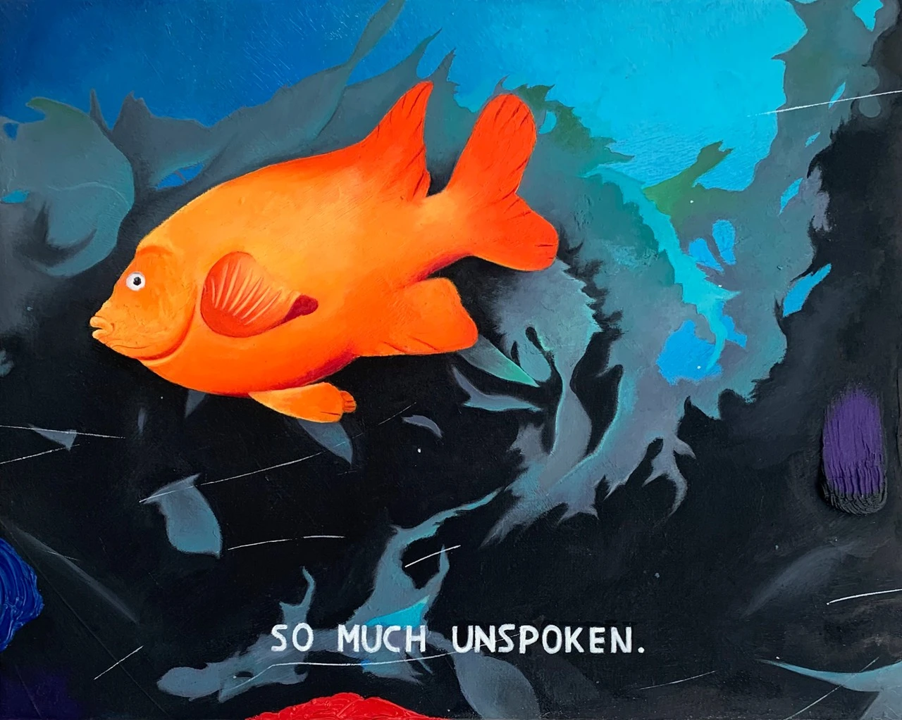 Картина с оранжевой рыбой, плывущей в тёмной воде, символизирует одиночество и борьбу. Она напоминает нам, что даже в тишине и бездействии есть сила, которую мы можем научиться использовать. Однако важно помнить, что эта сила должна быть направлена на созидание, а не на разрушение того, что мы ценим.