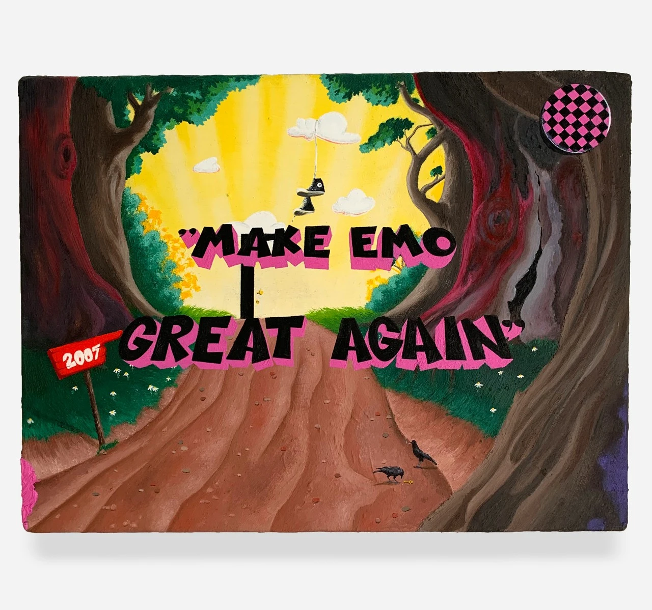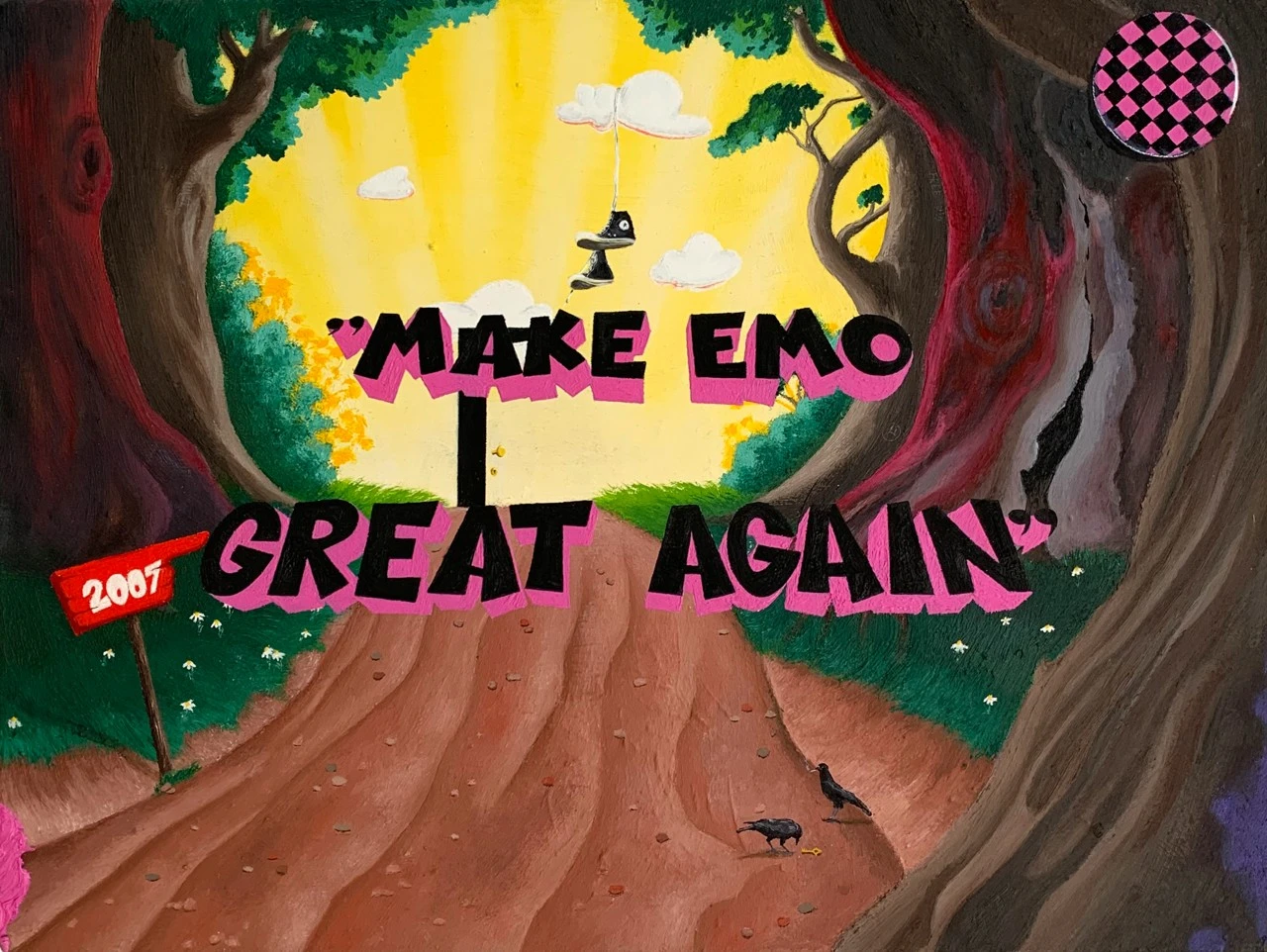 Эта работа в каком-то смысле является примером ностальгии по прошлому, особенно по 2007 году, который стал символом беззаботной юности для многих. Этот мем и его вариации часто используются для выражения тоски по временам, когда жизнь казалась проще, а мир — более понятным. На картине изображена тропинка, словно из мультфильма Диснея, ведущая к яркому свету, что символизирует путь в прошлое: к тем самым «золотым» временам. Надпись «MAKE EMO GREAT AGAIN» добавляет иронии, подчеркивая, что речь идет о возвращении к эмо-культуре, которая была популярна в 2007 году. Это не только дань моде и музыке того времени, но и отражение эмоционального состояния, когда люди были более открыты и искренни в своих чувствах.