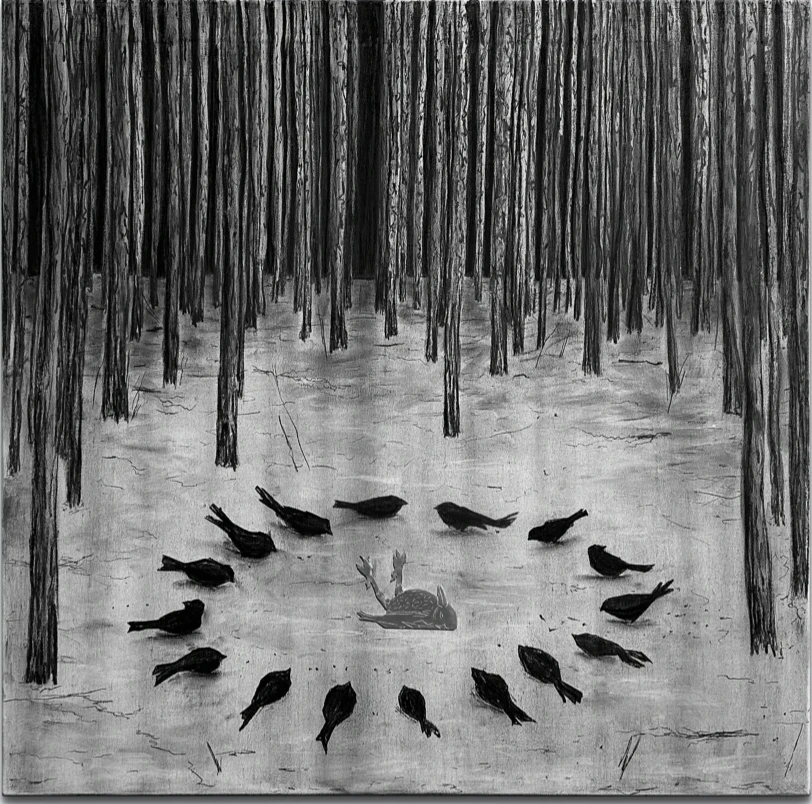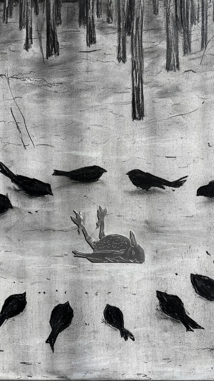 Блуждая по лесу, я вышел на выжженное поле и увидел птицу, лежащую неподвижно. Это был момент конечной точки, в которой обрывается путь.