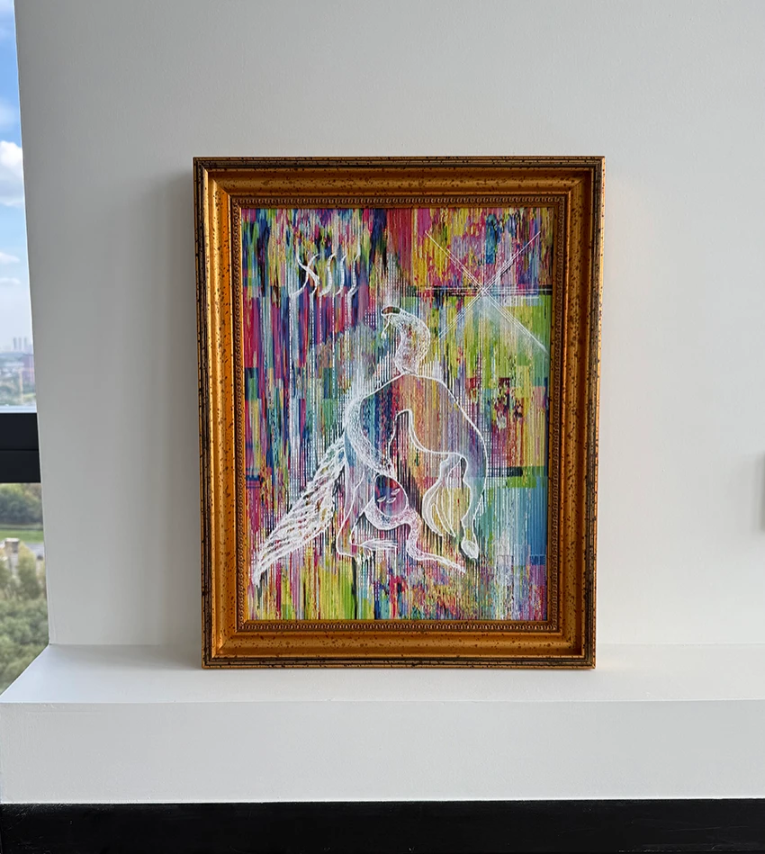 Произведение экспонировалось на выставке «Новая-новая эра». Представлено в продаже в оформленной раме, которая является неотъемлемой частью концепции работы. Размеры указаны без деревянной рамы.