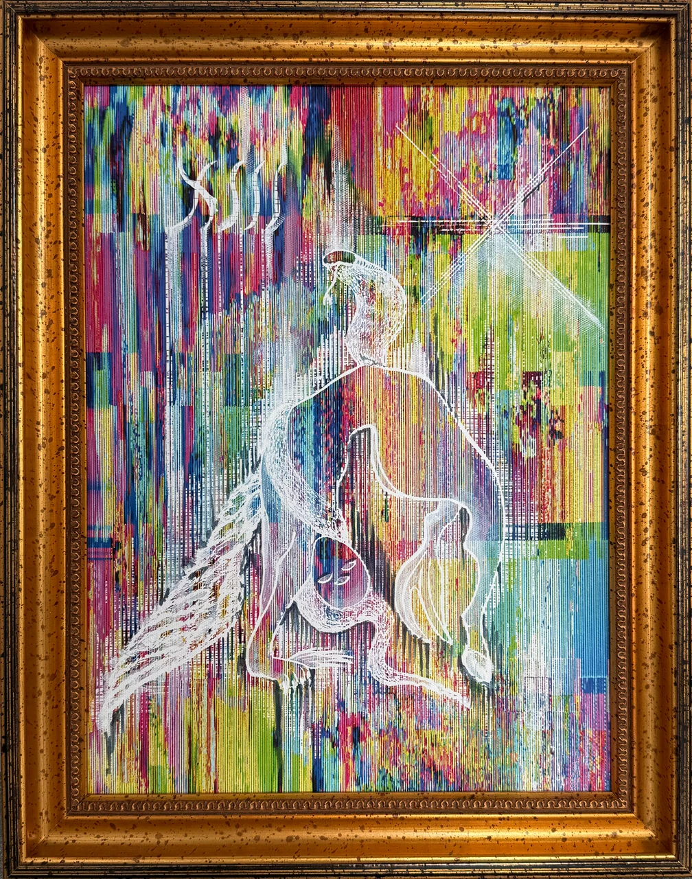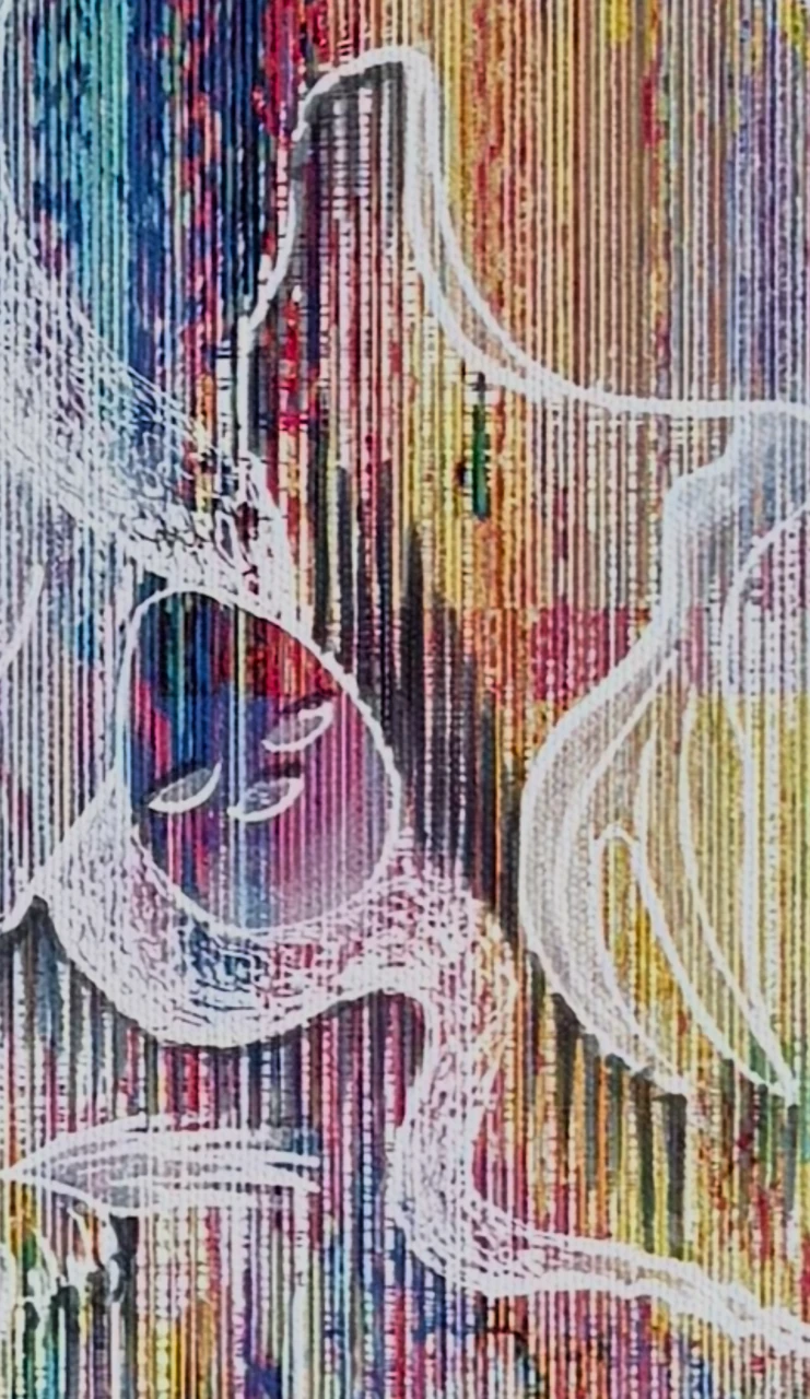 Работа выполнена в авторской технике: глитч создан с помощью цифровых видеомикшеров и обработки в Photoshop. Поверх глитч-изображения нанесён 13-й знак зодиака в позе «мостик» и доработан канцелярским белым штрихом. Финальная доработка глитча превращает изображение в цельный визуальный символ.