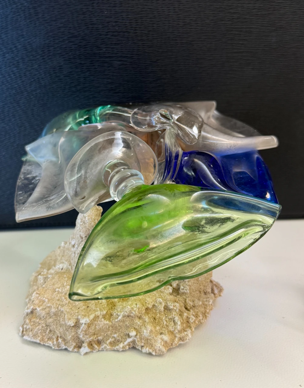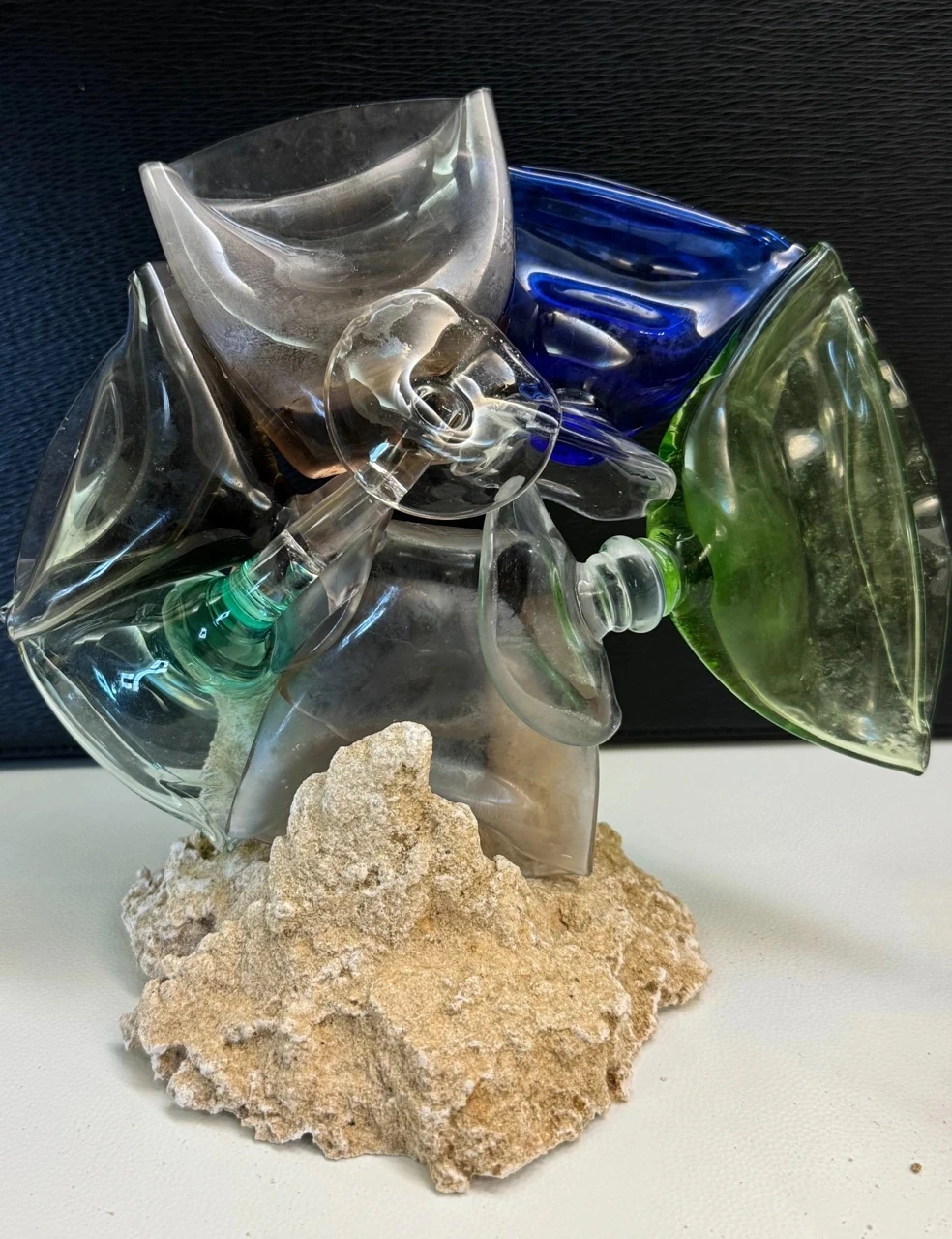 В проекте они проходят процесс переплавки методом фьюзинга. Под воздействием высокой температуры стекло теряет привычную форму: края расплываются, орнаменты растворяются, и утилитарный предмет перестаёт быть посудой.
