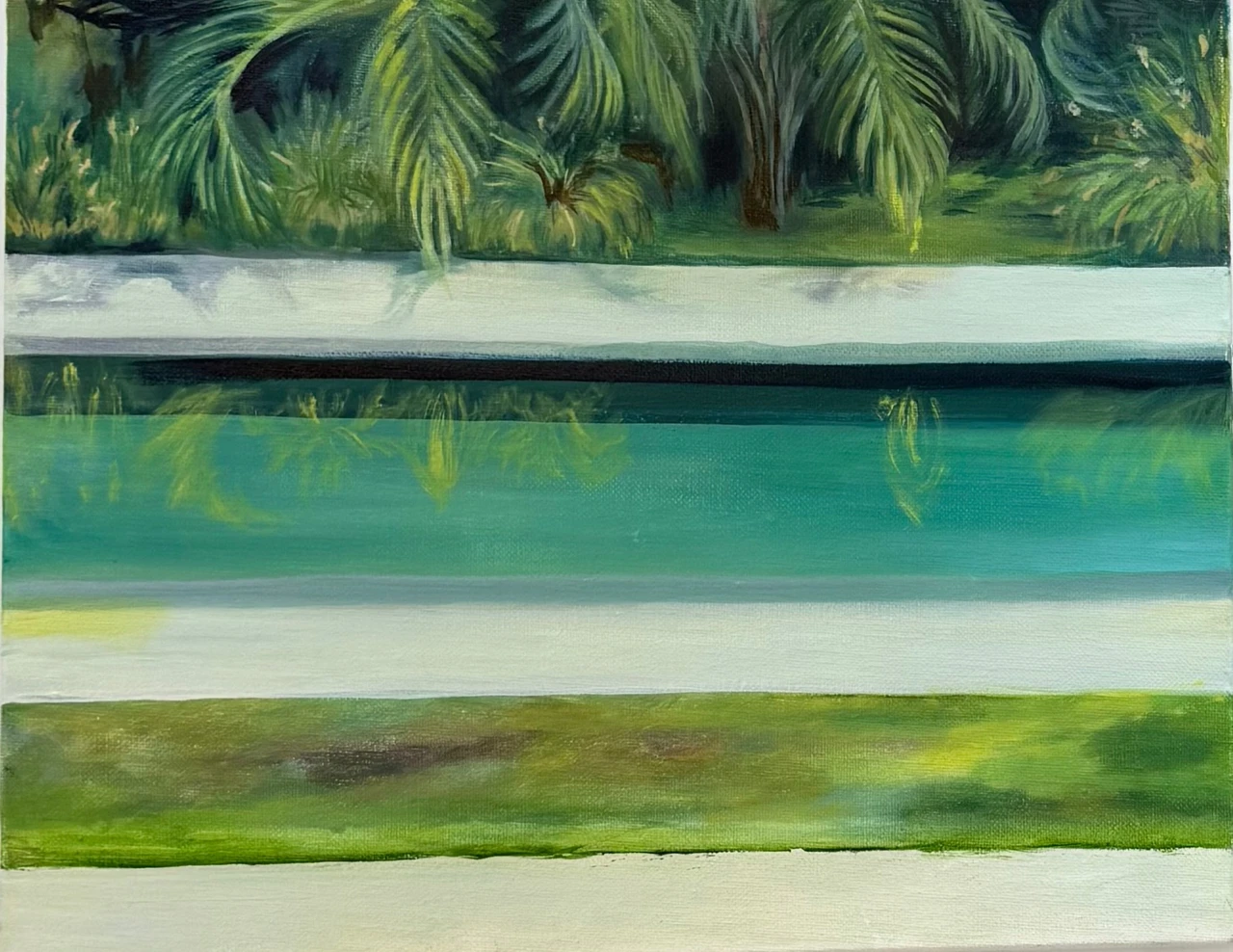 Отражение воды, линия берега и полосы растительности образуют визуальный ритм, в котором реальный пейзаж постепенно превращается в живописную конструкцию. Реальный ландшафт здесь постепенно растворяется в ритме живописных полос.