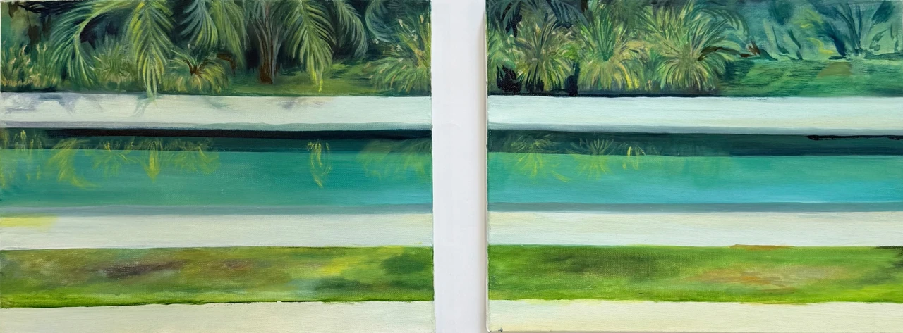 Работа выстроена как система горизонтальных слоёв, где природный ландшафт превращается в почти абстрактную структуру. Повторение композиции в диптихе создаёт эффект смещённого взгляда: два изображения кажутся почти идентичными, но различия в цвете и ритме поверхности раскрывают изменчивость пространства и времени.