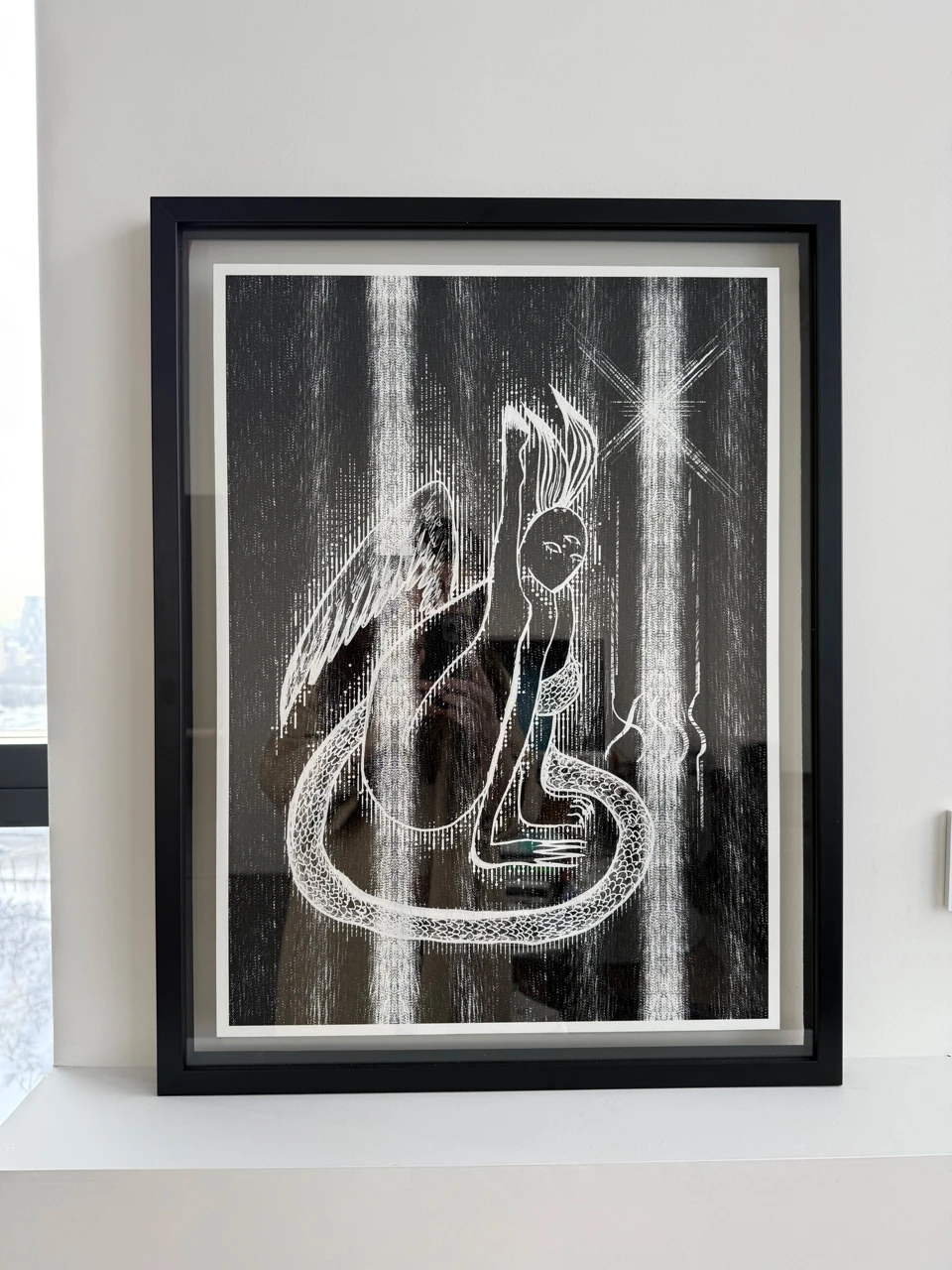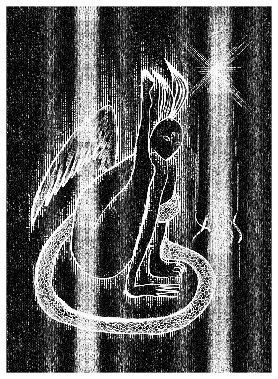 Линейный образ Змееносца наложен поверх глитч-структуры и доработан вручную, что создаёт напряжение между цифровым и телесным жестом. В результате изображение функционирует как гибридный символ, в котором мифологическое тело собирается из фрагментированной цифровой материи.