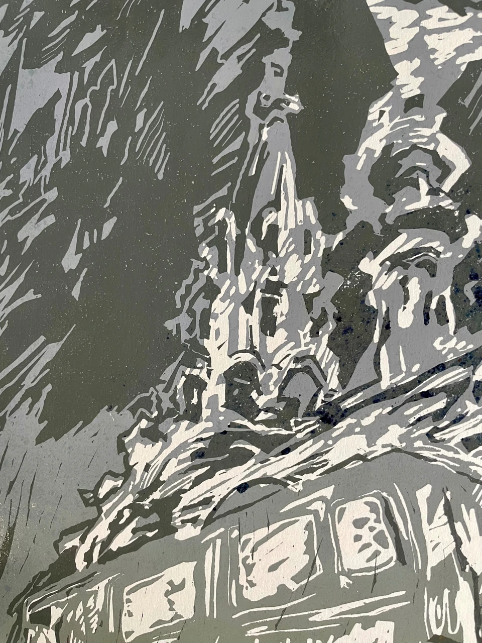 Линогравюрный оттиск 40х55 см на листе бумаги молочного цвета размером 50х65 см.