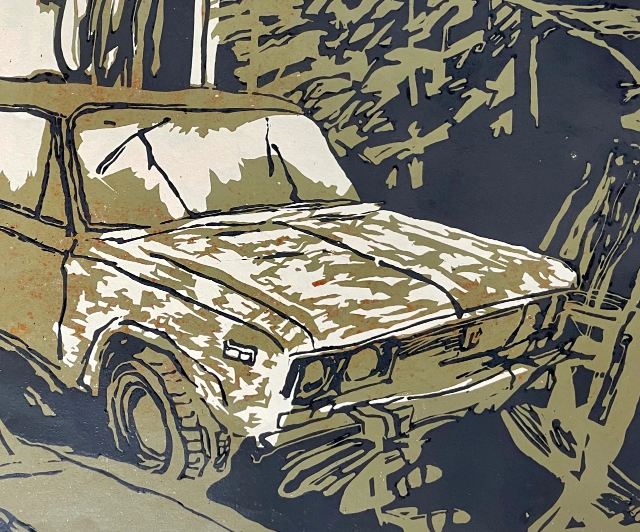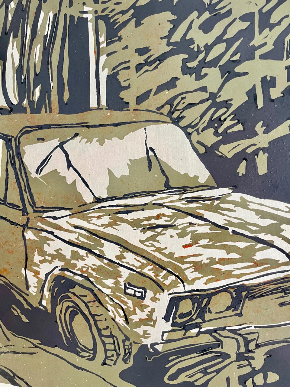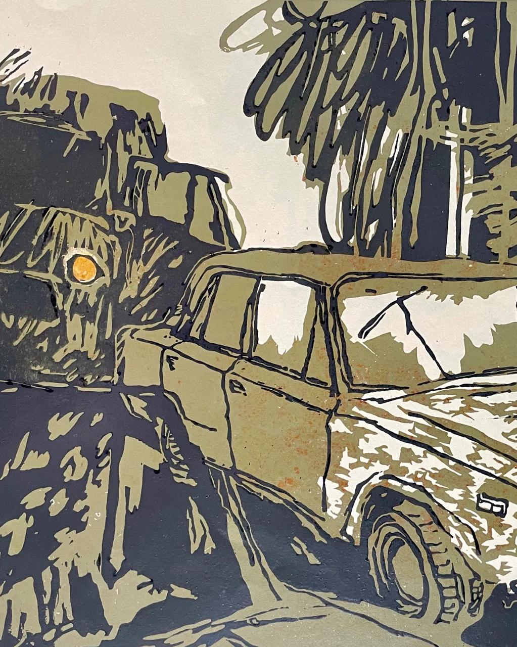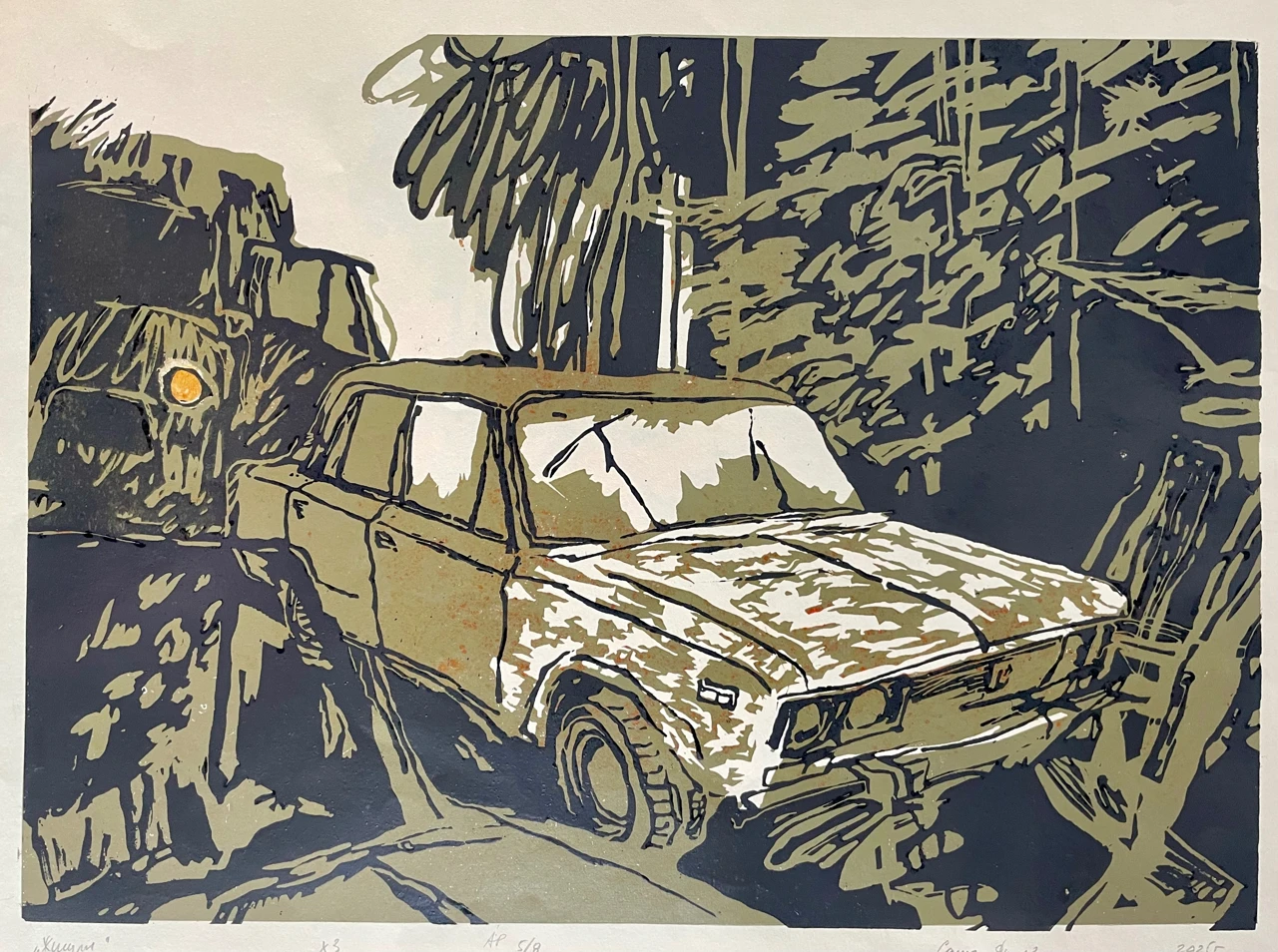 Линогравюрный оттиск 40х55 см на листе бумаги молочного цвета размером 50х65 см.