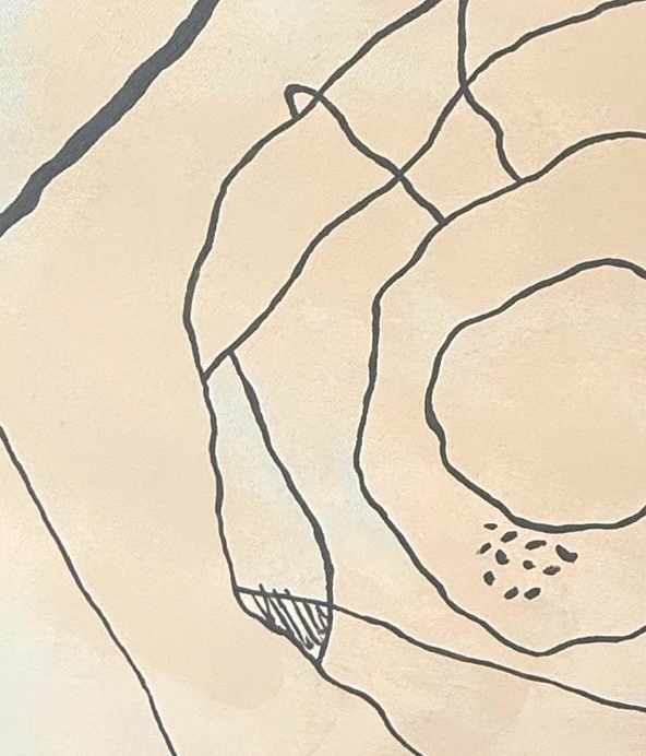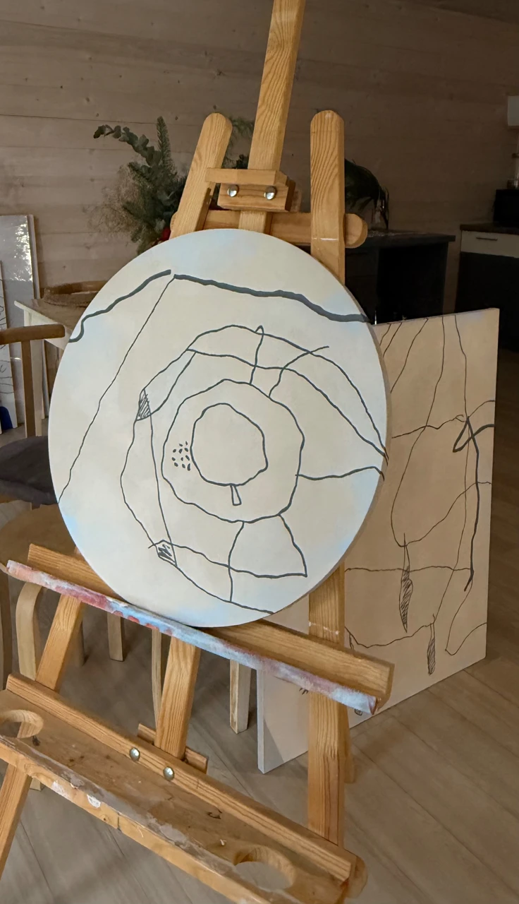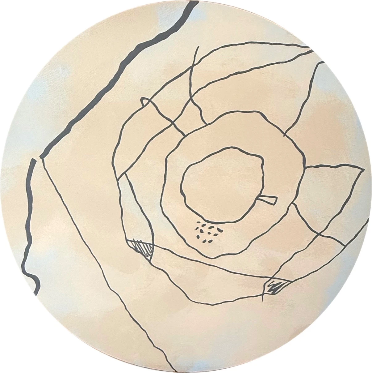 Работа выполнена акрилом на холсте с использованием графических линий. Круглая форма холста подчёркивает мотив замкнутости и повторяемости образа. Акцент сделан на линии и ритме, без фактурного объёма.