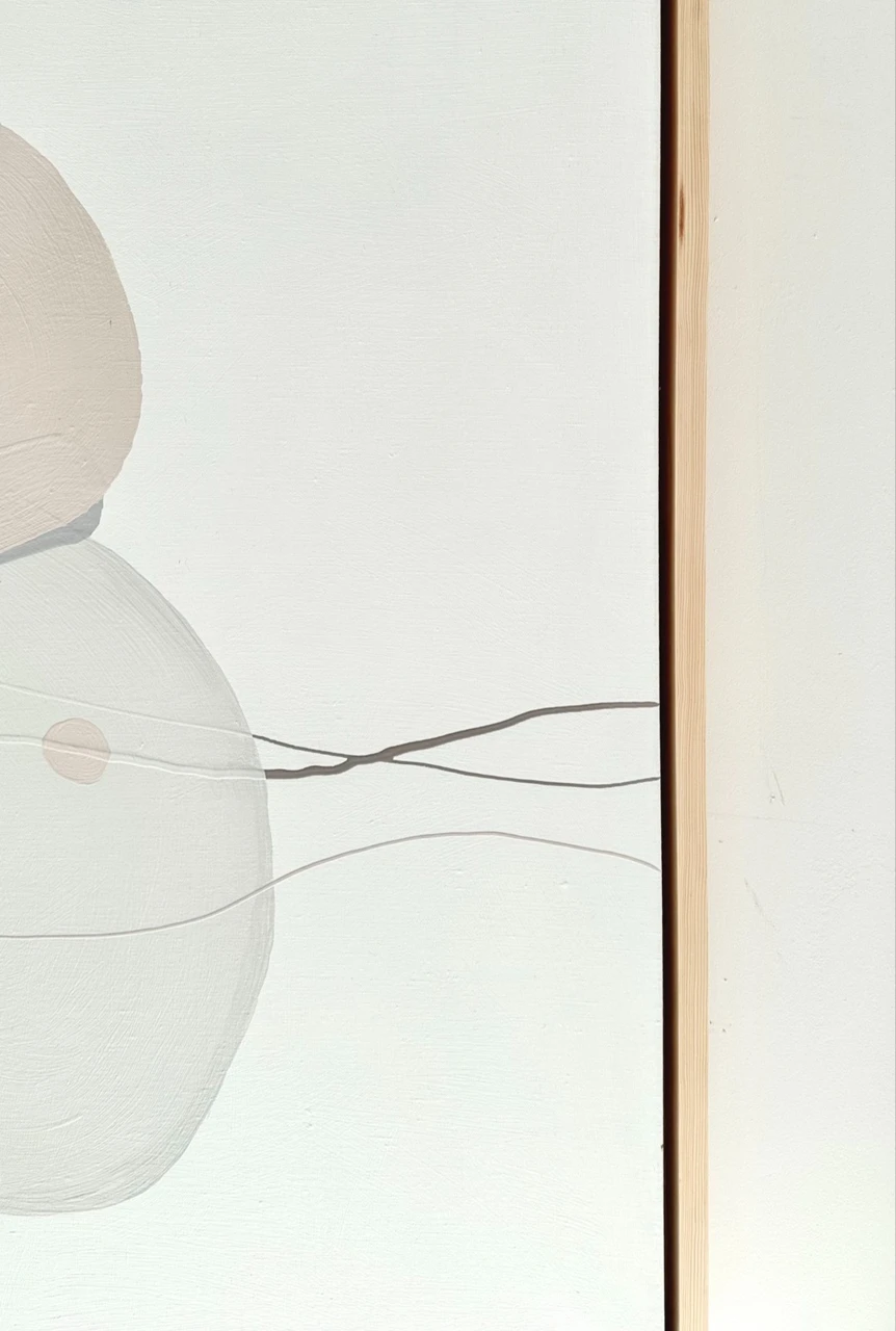 Мягкие, пересекающиеся объёмы формируют внутреннее поле работы. Их границы остаются подвижными, позволяя форме сохранять незавершённость и текучесть. Линейные элементы проходят сквозь композицию, связывая её части и задавая непрерывность движения.