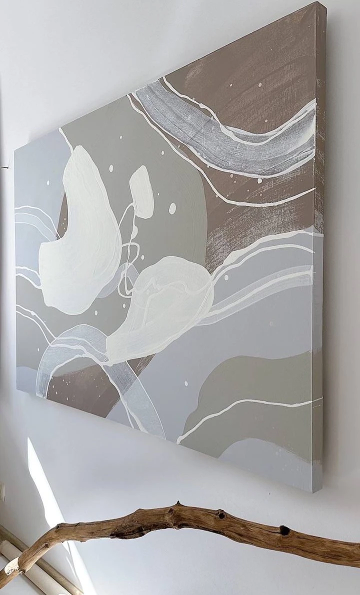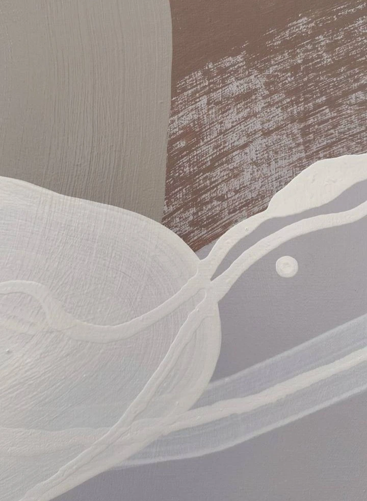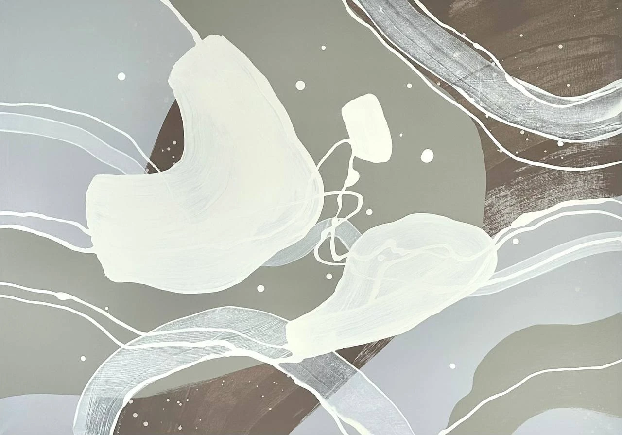 Жест развивается в моменте, без заданной структуры, фиксируя состояние концентрации. Формы возникают из движения и сохраняют подвижность. Линии проходят через поверхность, соединяя элементы и удерживая непрерывность процесса. Цветовые поля распределяются интуитивно, с варьирующейся плотностью и прозрачностью. Пустое пространство включено в структуру работы и поддерживает баланс.