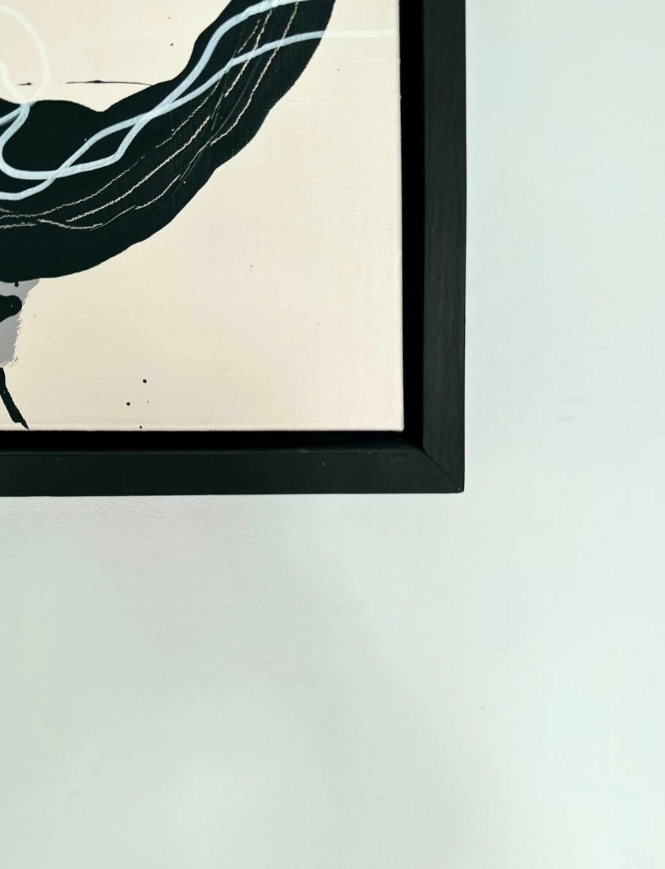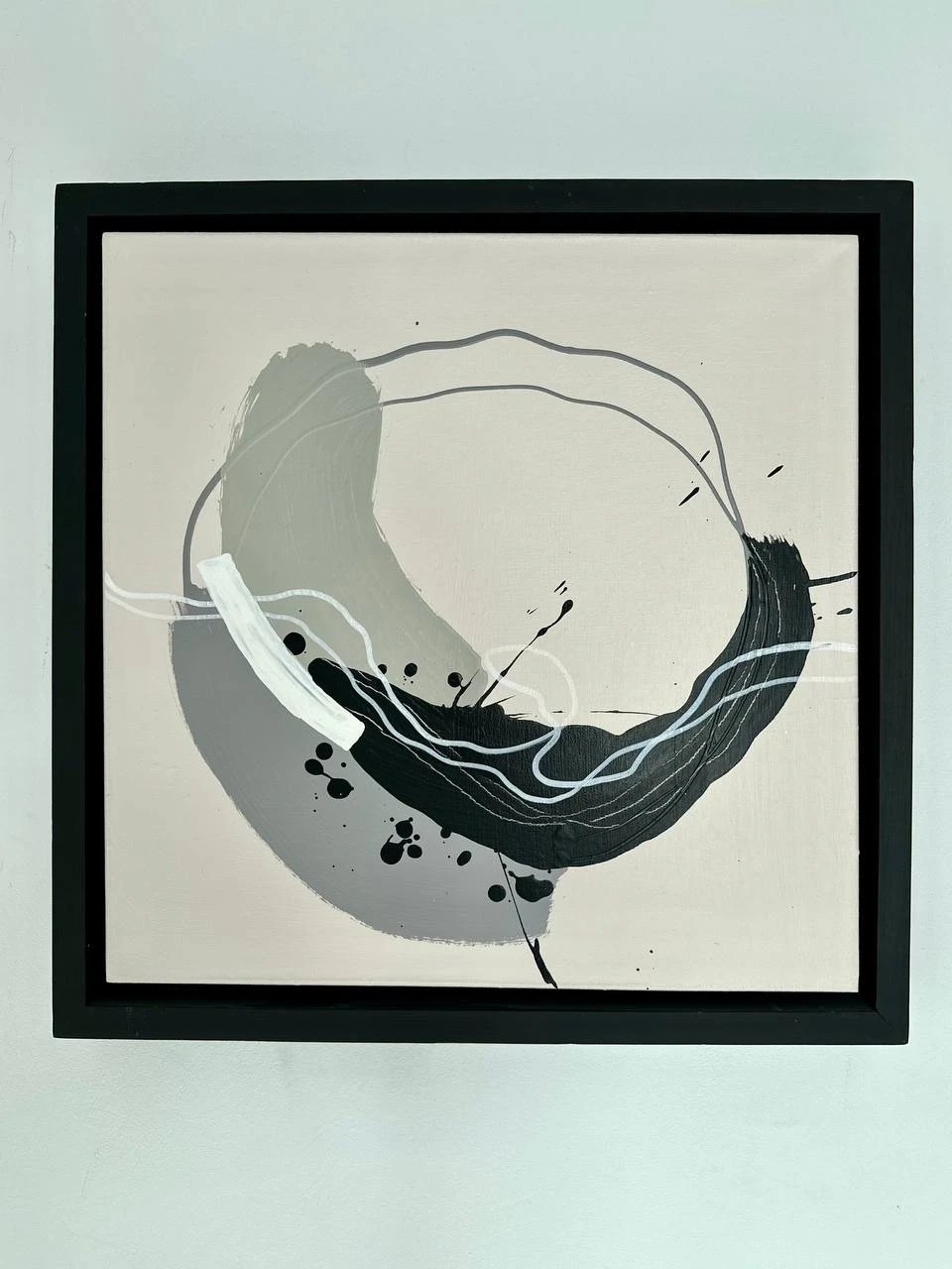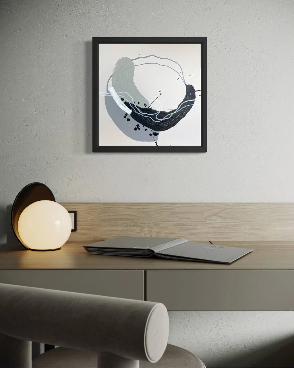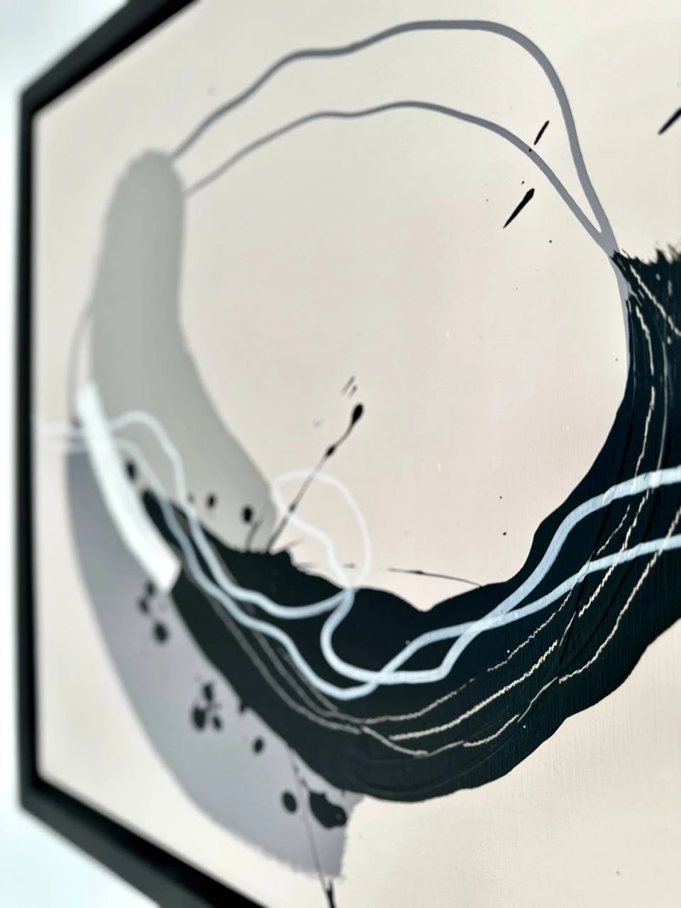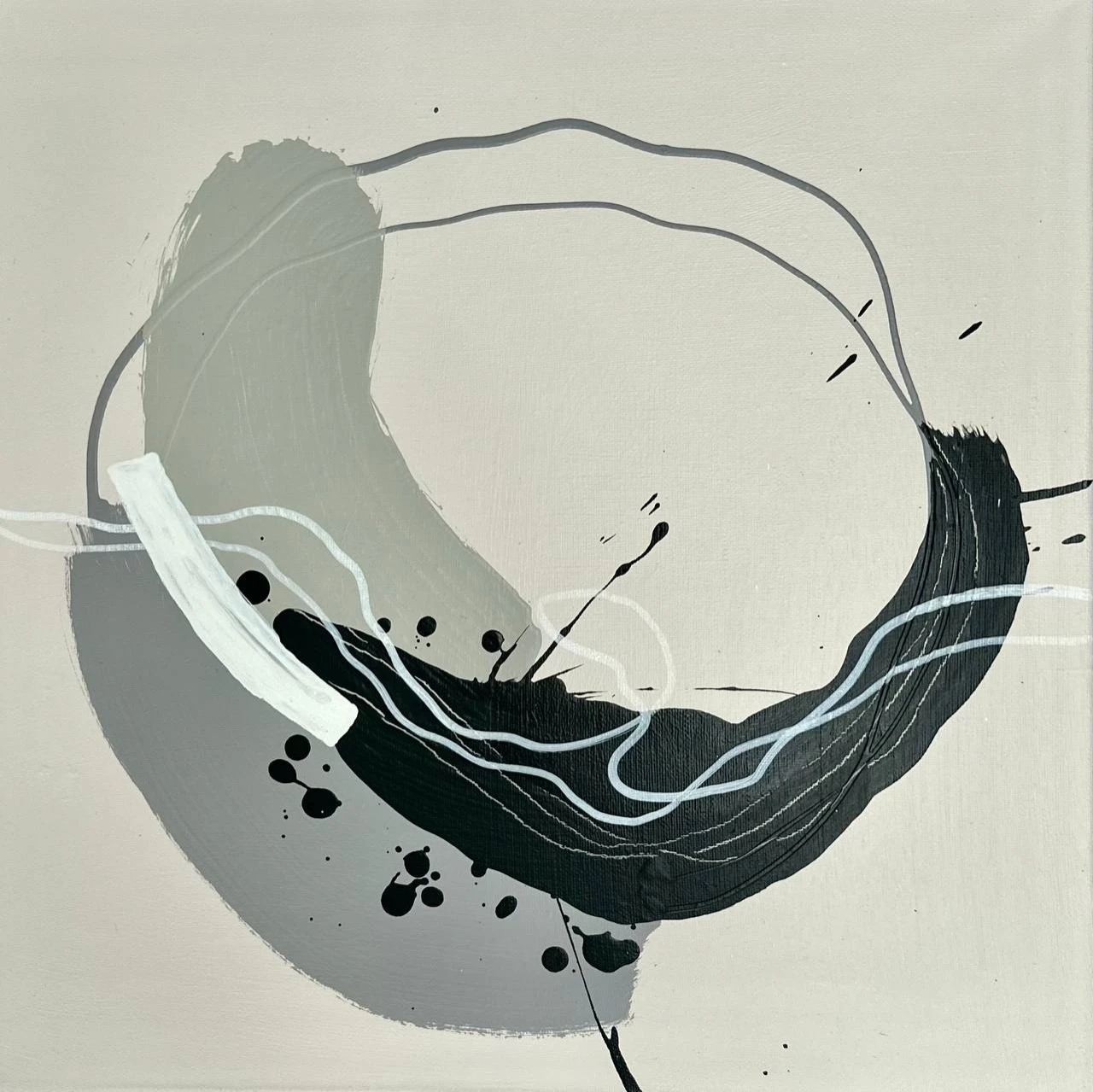 Круговое движение собирает композицию, не фиксируя её окончательно. Плотные и разреженные участки жеста выявляют изменение давления и ритма. Контраст тёмного и светлого концентрирует внимание в нижней части, где движение становится более насыщенным и материальным.