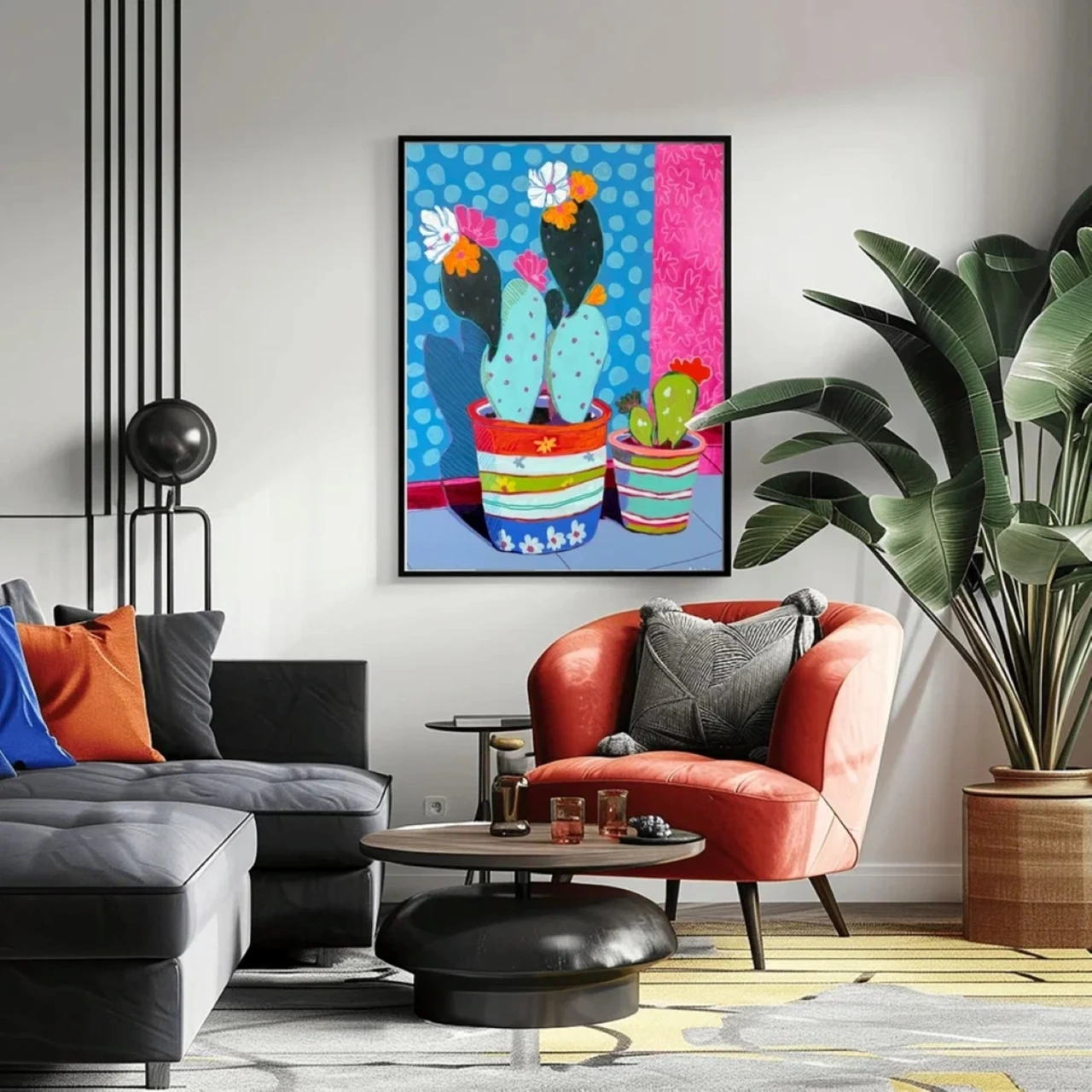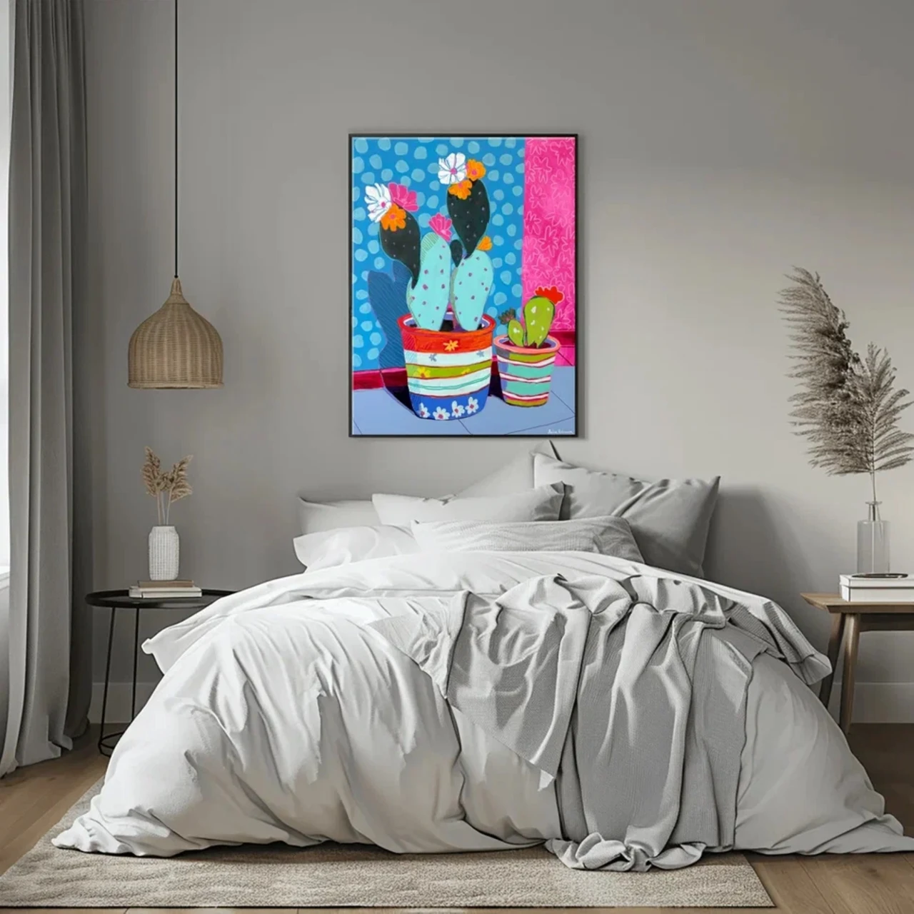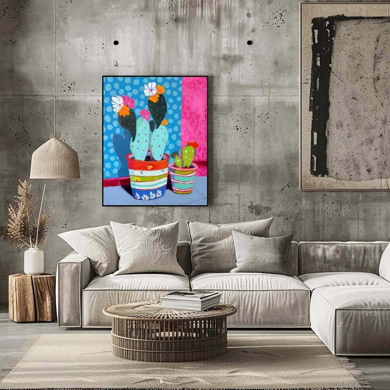 Эта оригинальная акриловая картина передаёт очаровательную сцену с двумя яркими кактусами, уютно устроившимися в элегантных полосатых горшках. Каждый украшен цветами и стоит на фоне мягкой голубой стены с тонкими розовыми акцентами. Фон усыпан игривыми горошинами, придающими работе ностальгическое, но свежее ретро-настроение. Нежные тени на дубовом полу усиливают ощущение спокойствия и присутствия — мягкий свет словно приглашает зрителя задержаться и всмотреться. Выполненная в причудливом дизайнерском стиле картина сочетает яркие оттенки и деликатные детали, создавая радостную, но утончённую композицию. Контраст смелых полос и живых форм кактусов с умиротворённым голубым фоном делает это произведение идеальным для гостиной, кабинета или любого пространства, которому не хватает солнечного настроения. Если вам близко современное ботаническое искусство, ретро-интерьеры или энергичные цветовые решения, эта картина станет ярким акцентом, который вдохновит и наполнит пространство позитивом.