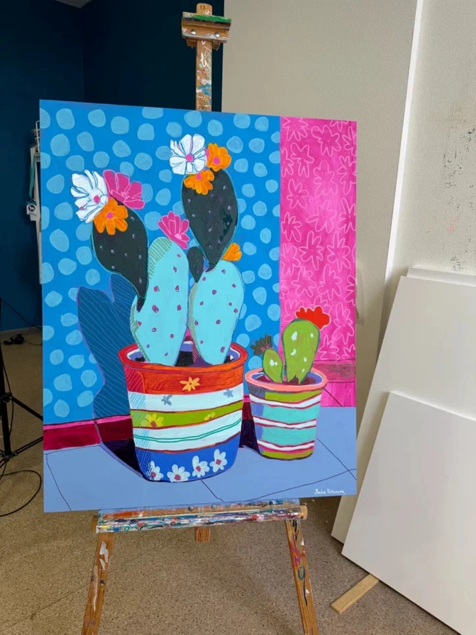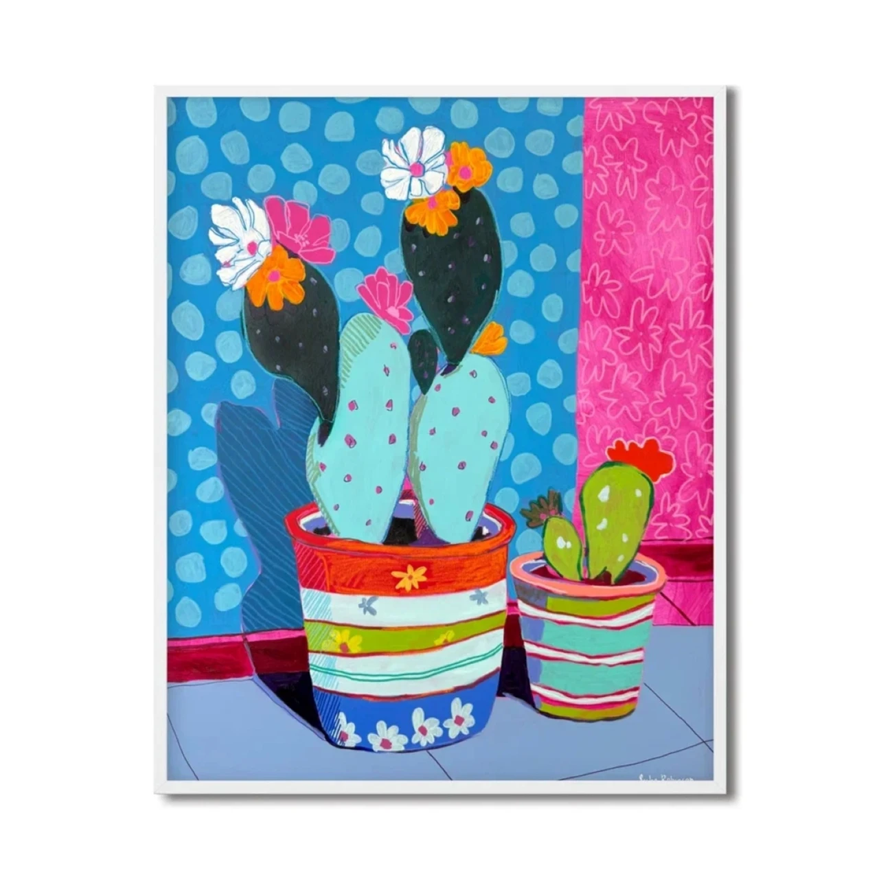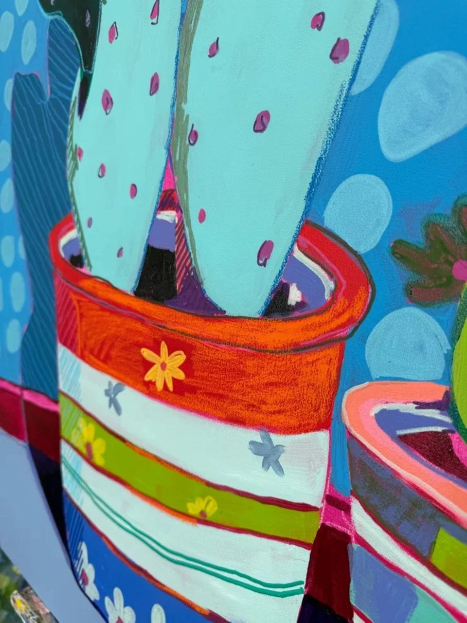 Эта оригинальная акриловая картина передаёт очаровательную сцену с двумя яркими кактусами, уютно устроившимися в элегантных полосатых горшках. Каждый украшен цветами и стоит на фоне мягкой голубой стены с тонкими розовыми акцентами. Фон усыпан игривыми горошинами, придающими работе ностальгическое, но свежее ретро-настроение. Нежные тени на дубовом полу усиливают ощущение спокойствия и присутствия — мягкий свет словно приглашает зрителя задержаться и всмотреться. Выполненная в причудливом дизайнерском стиле картина сочетает яркие оттенки и деликатные детали, создавая радостную, но утончённую композицию. Контраст смелых полос и живых форм кактусов с умиротворённым голубым фоном делает это произведение идеальным для гостиной, кабинета или любого пространства, которому не хватает солнечного настроения. Если вам близко современное ботаническое искусство, ретро-интерьеры или энергичные цветовые решения, эта картина станет ярким акцентом, который вдохновит и наполнит пространство позитивом.