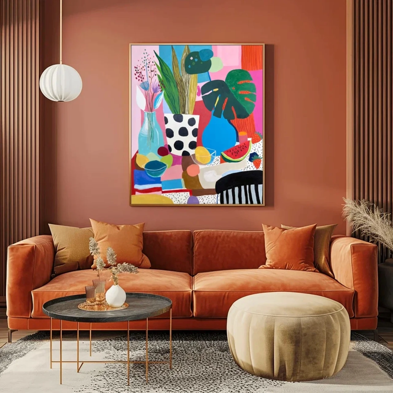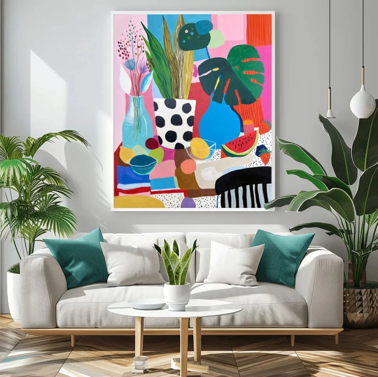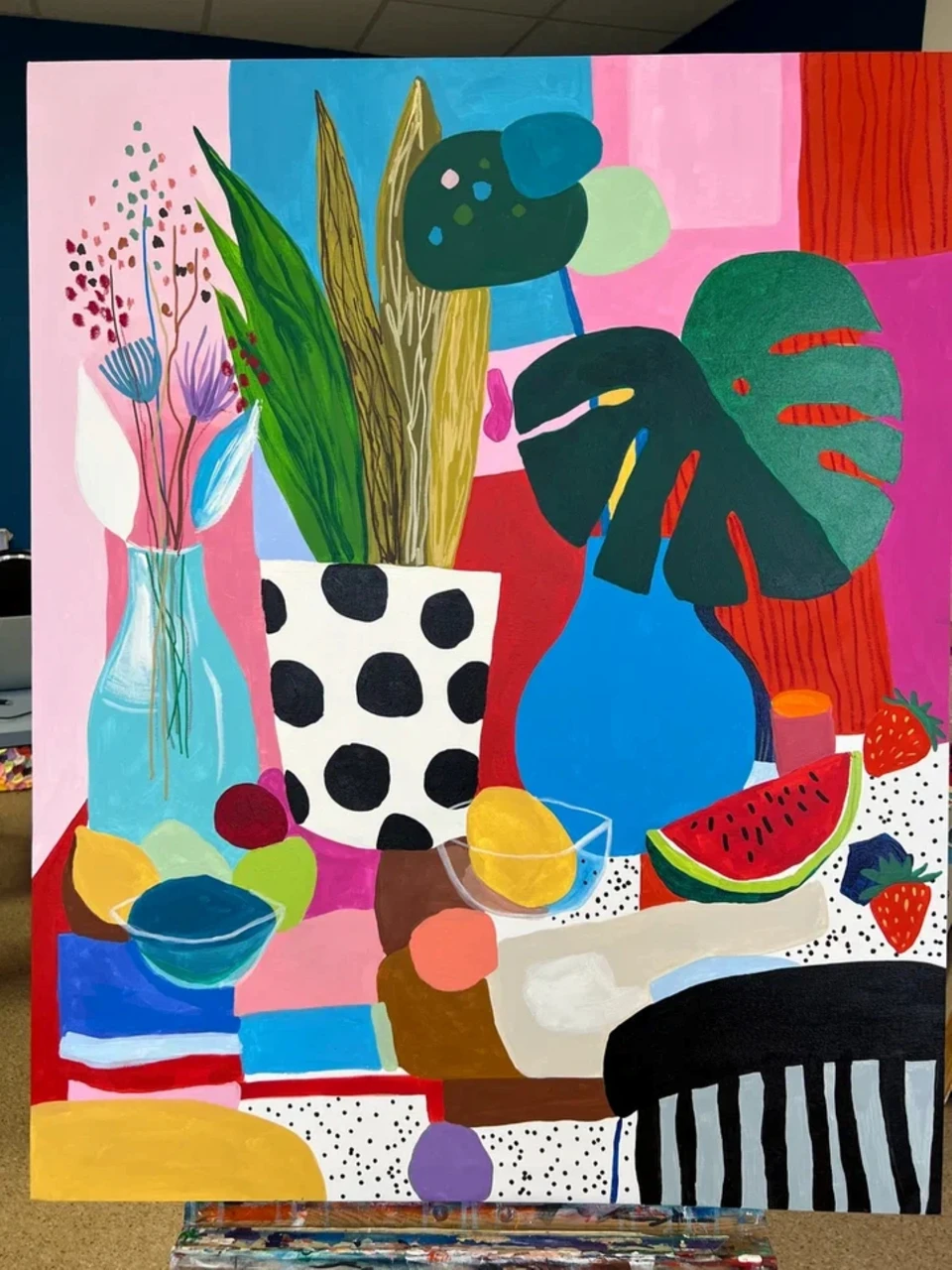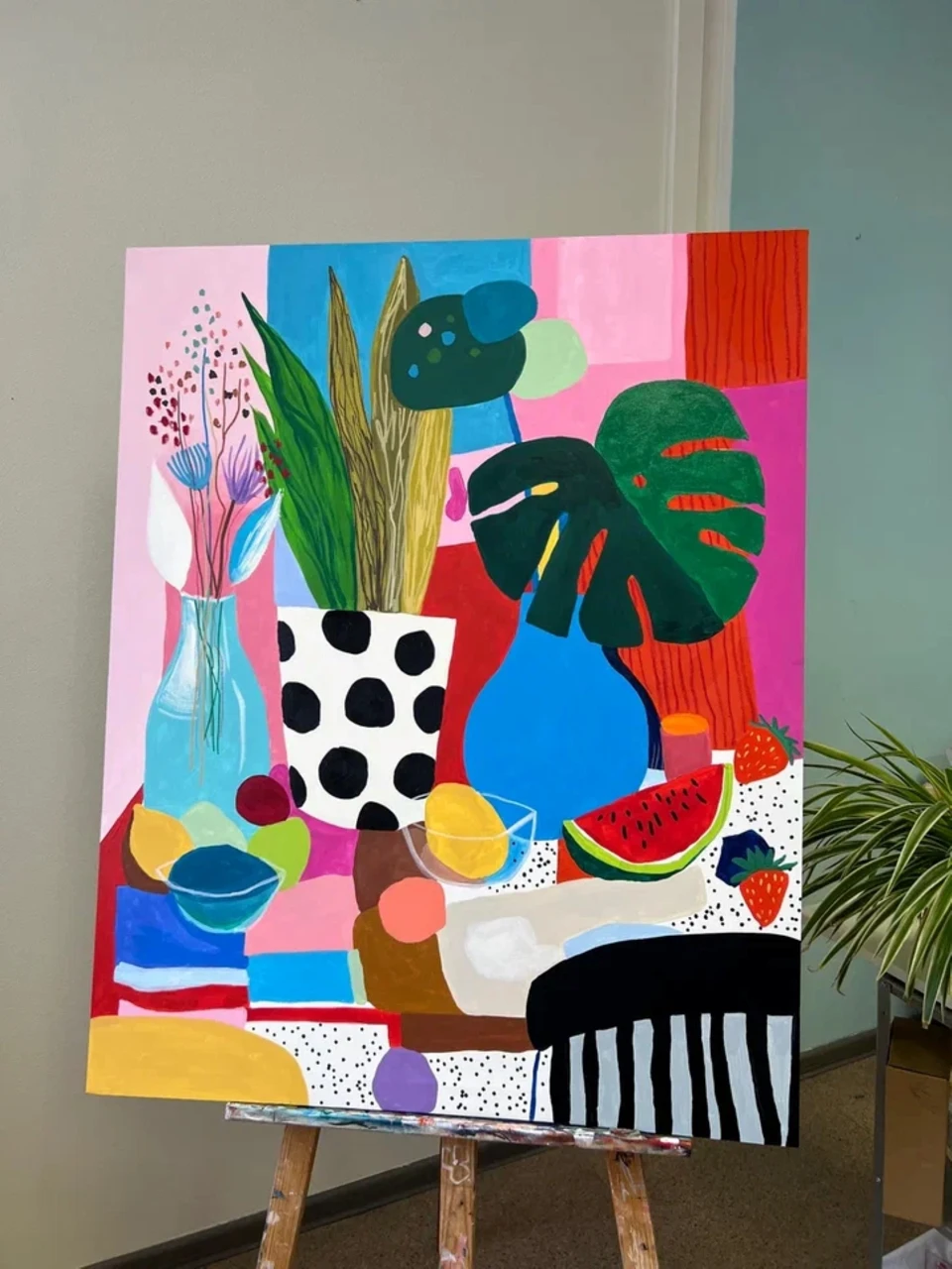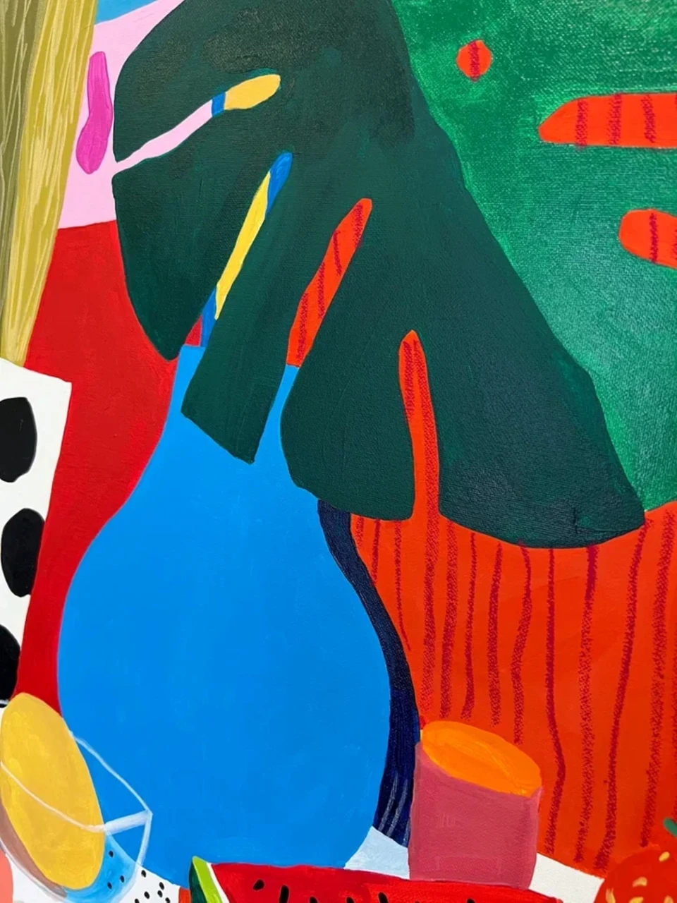 Гуашевый натюрморт на бумаге в стиле Матисса с изображением арбуза, листьев монстеры, лимонада и фруктов в вазе на фоне розовых и голубых горошков. Подарите своим стенам всплеск радости с этой гуашевой работой на бумаге, вдохновлённой стилем Матисса. Выполненная в плоской иллюстративной манере, минималистичная композиция изображает полосатый стол, накрытый покрывалом, простую вазу с цветами и листьями монстеры, дольки свежего арбуза и кувшин с лимонадом на игривом фоне с розовыми и голубыми горошками. Яркие цвета и чёткие линии создают сочный, тропический натюрморт, идеально подходящий для современного интерьера, кухни или любого пространства, где хочется добавить яркий акцент. Выполненное высококачественными акриловыми красками, это произведение сочетает эстетику середины XX века с современным взглядом. Идеально для любителей минималистичного искусства, ботанических мотивов и живописи в духе Матисса.