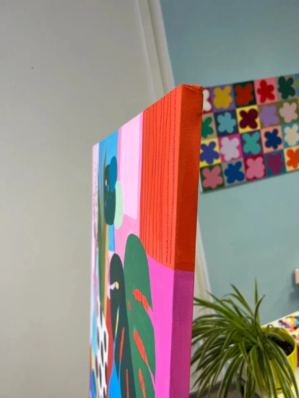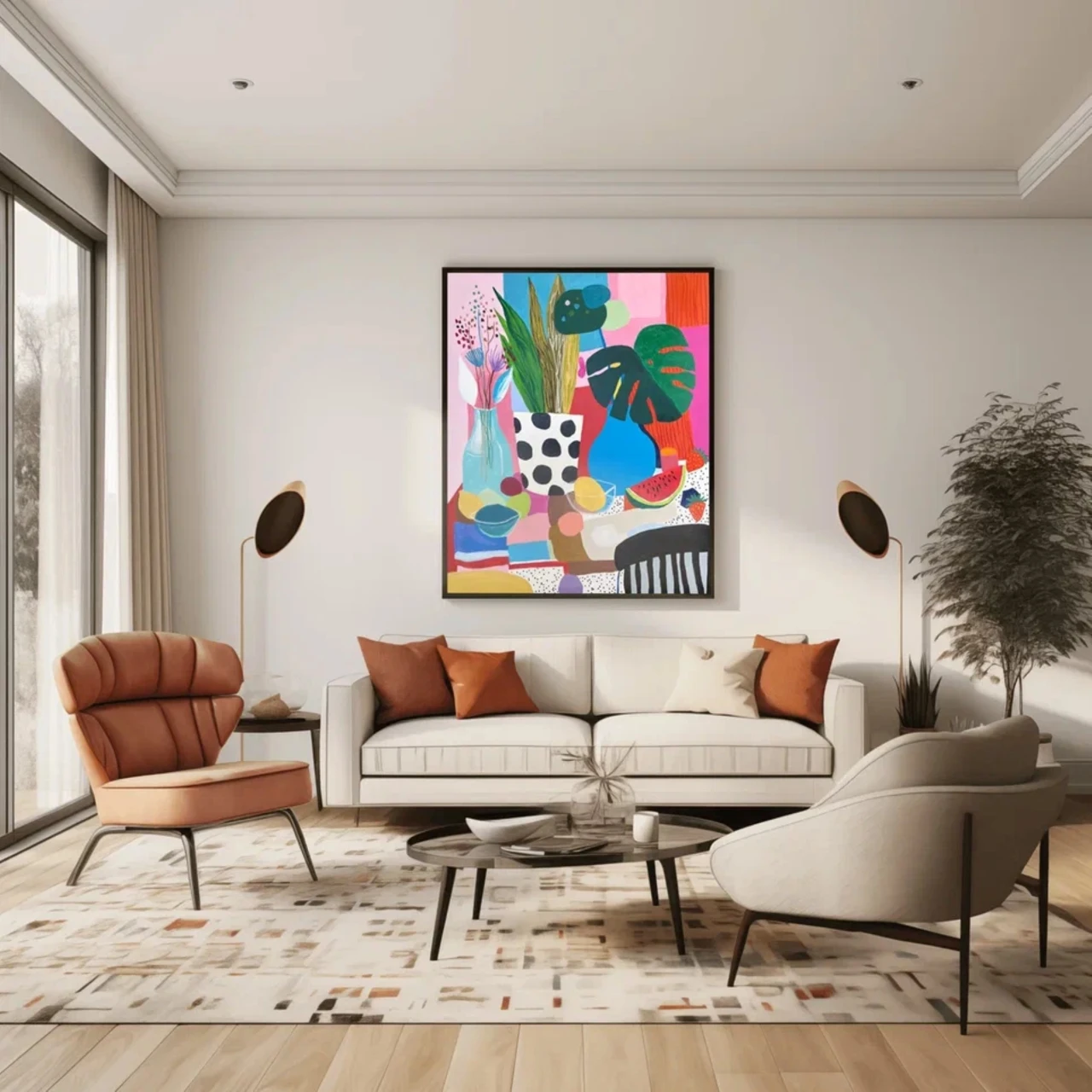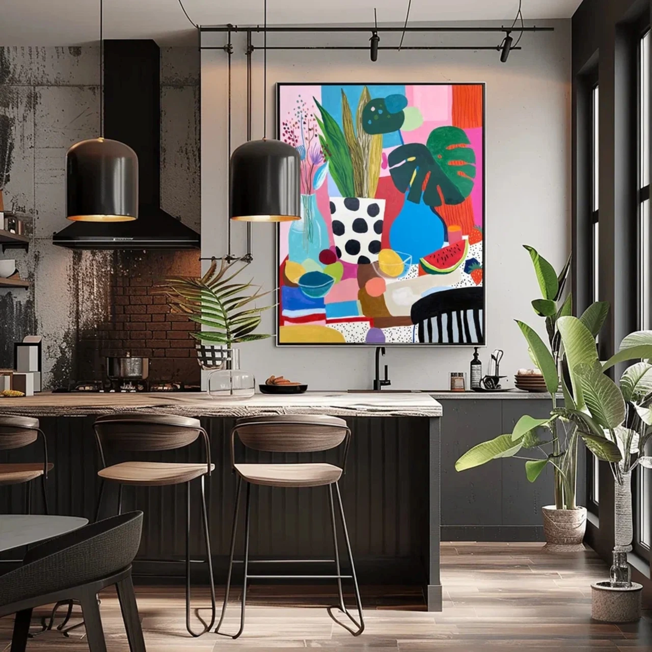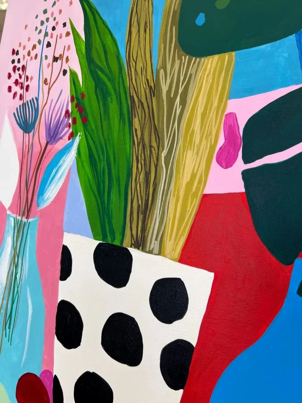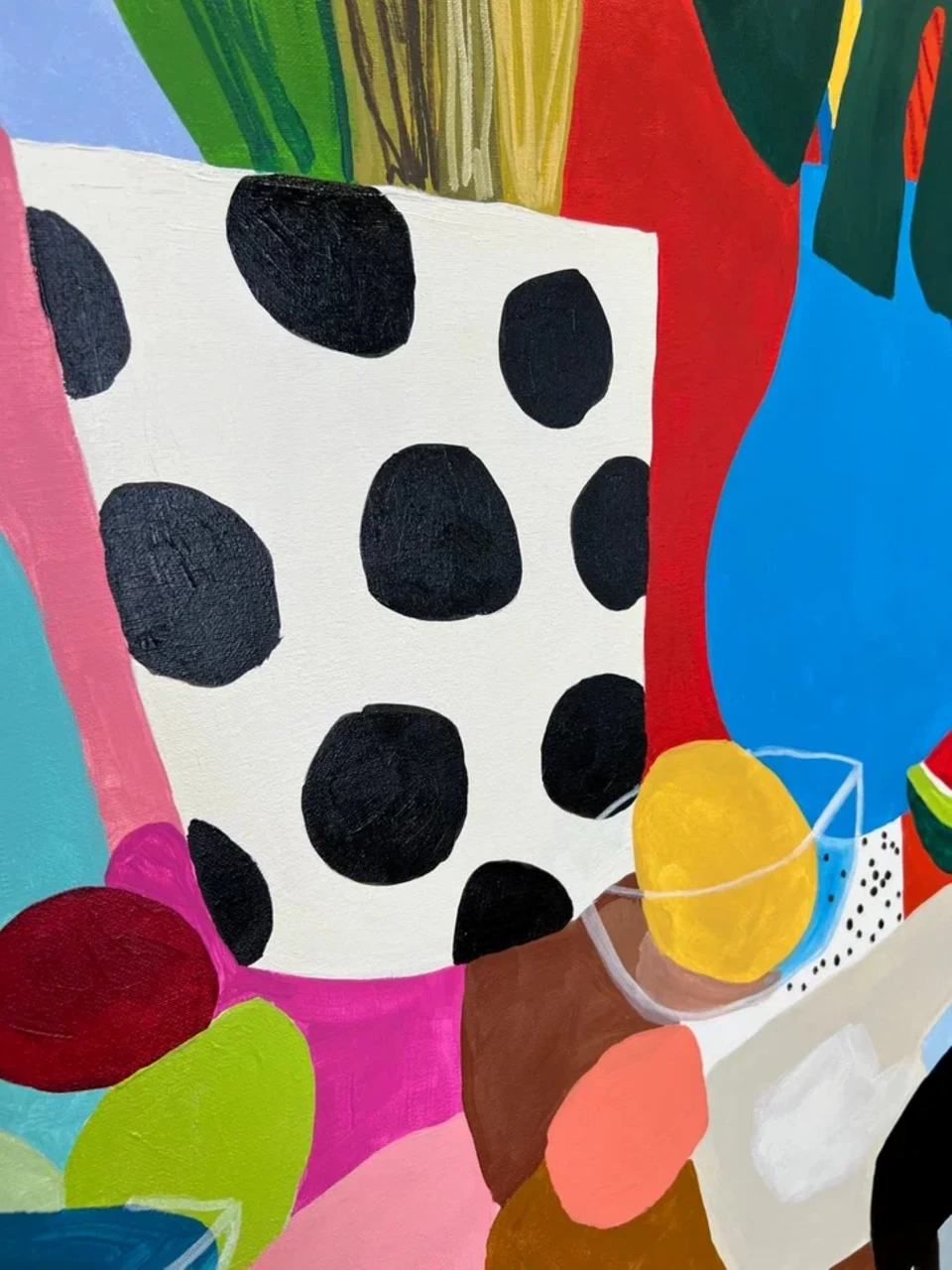 Гуашевый натюрморт на бумаге в стиле Матисса с изображением арбуза, листьев монстеры, лимонада и фруктов в вазе на фоне розовых и голубых горошков. Подарите своим стенам всплеск радости с этой гуашевой работой на бумаге, вдохновлённой стилем Матисса. Выполненная в плоской иллюстративной манере, минималистичная композиция изображает полосатый стол, накрытый покрывалом, простую вазу с цветами и листьями монстеры, дольки свежего арбуза и кувшин с лимонадом на игривом фоне с розовыми и голубыми горошками. Яркие цвета и чёткие линии создают сочный, тропический натюрморт, идеально подходящий для современного интерьера, кухни или любого пространства, где хочется добавить яркий акцент. Выполненное высококачественными акриловыми красками, это произведение сочетает эстетику середины XX века с современным взглядом. Идеально для любителей минималистичного искусства, ботанических мотивов и живописи в духе Матисса.