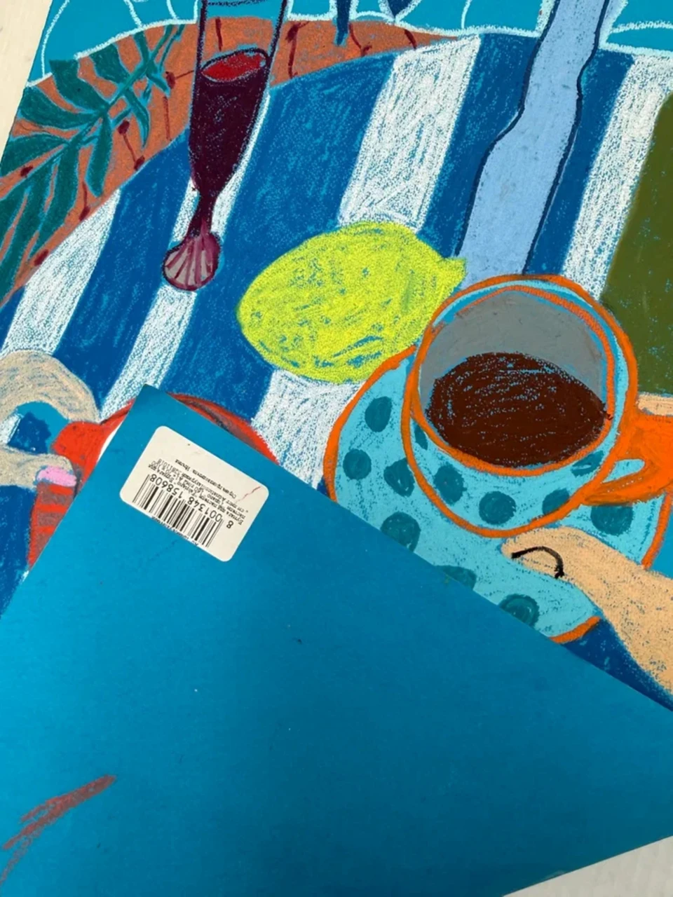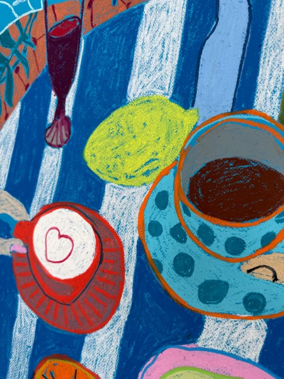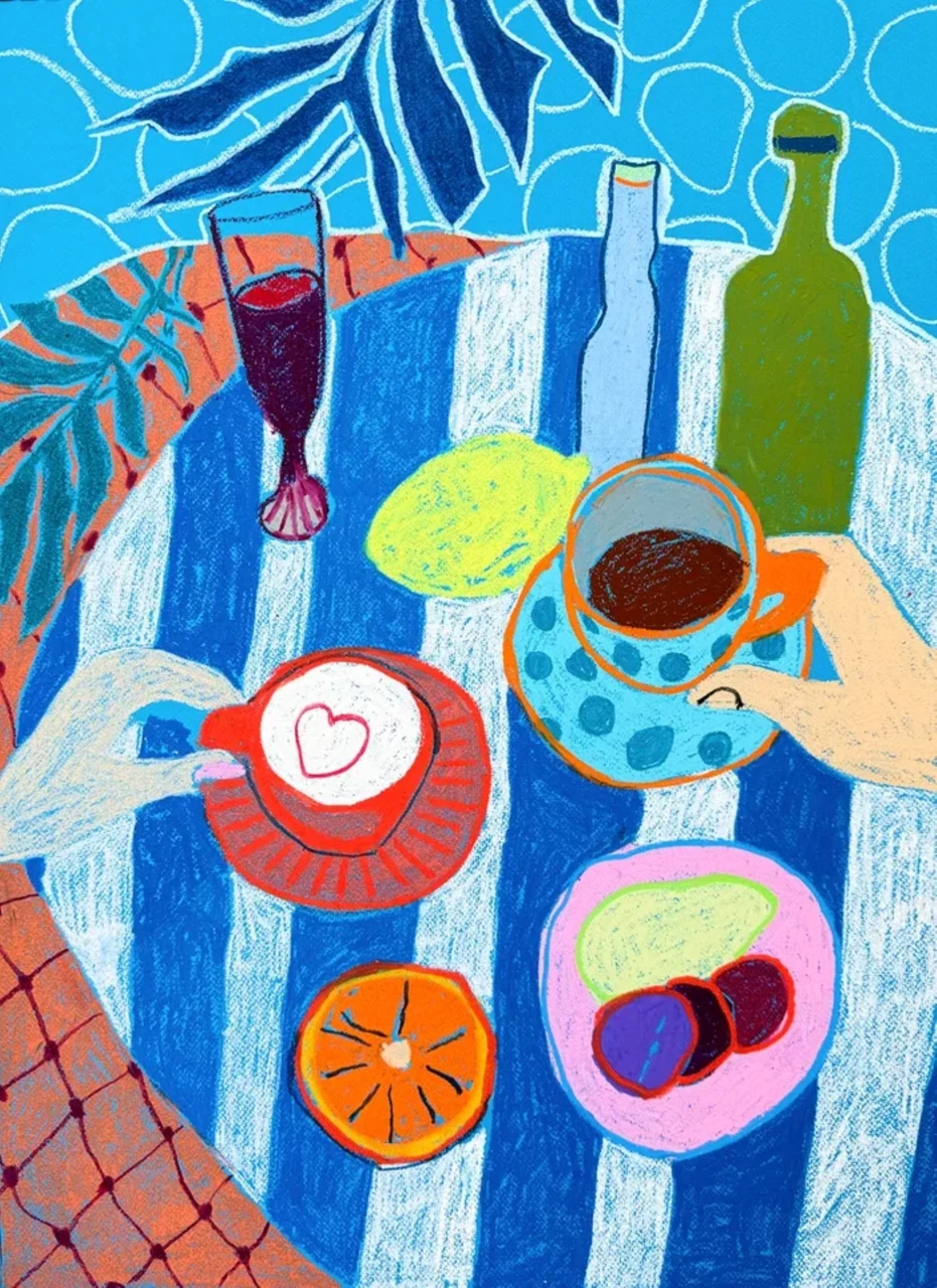 Созданный в выразительном стиле, напоминающем Рауля Дюфи, этот пастельный рисунок передает цвет, движение и расслабленную прибрежную элегантность. Вид сверху крупным планом показывает руки, держащие бокалы красного и белого вина, рядом с тарелками в форме сердца с дольками апельсина и темно-зеленой бутылкой оливкового масла, создавая ощущение солнечного летнего дня.