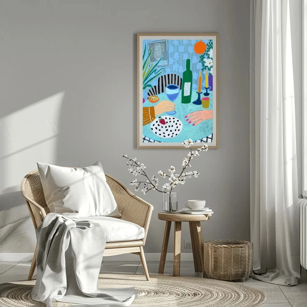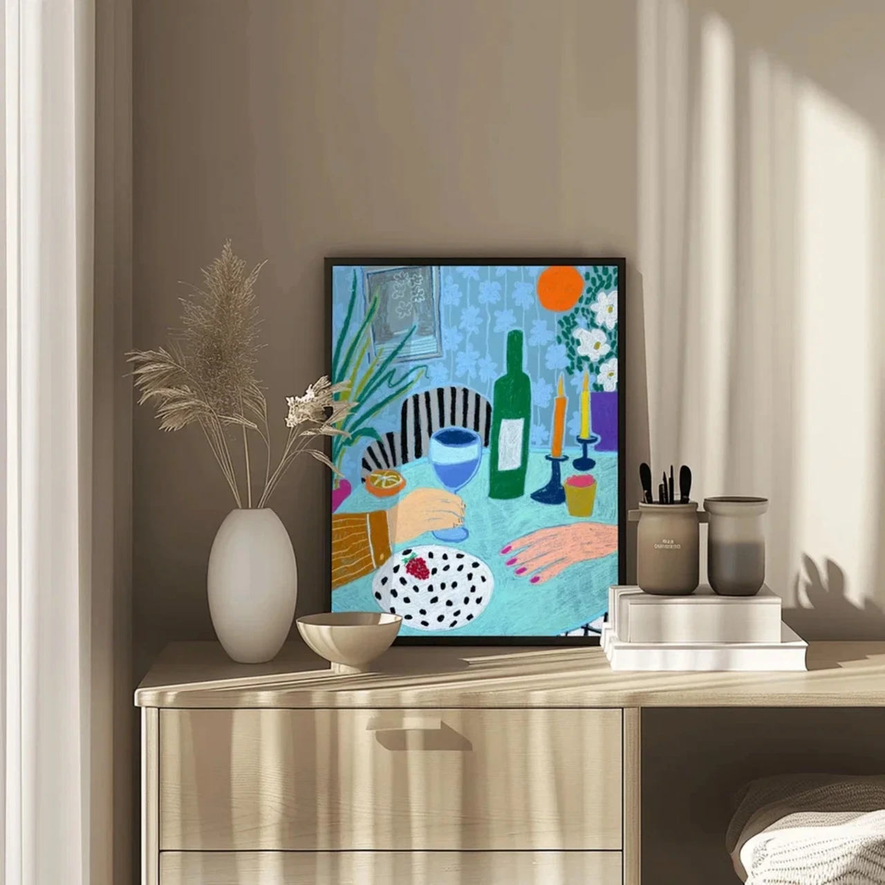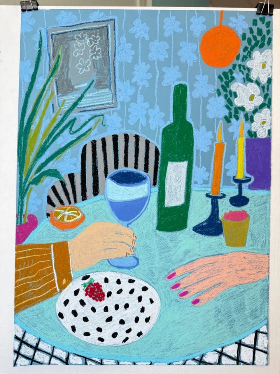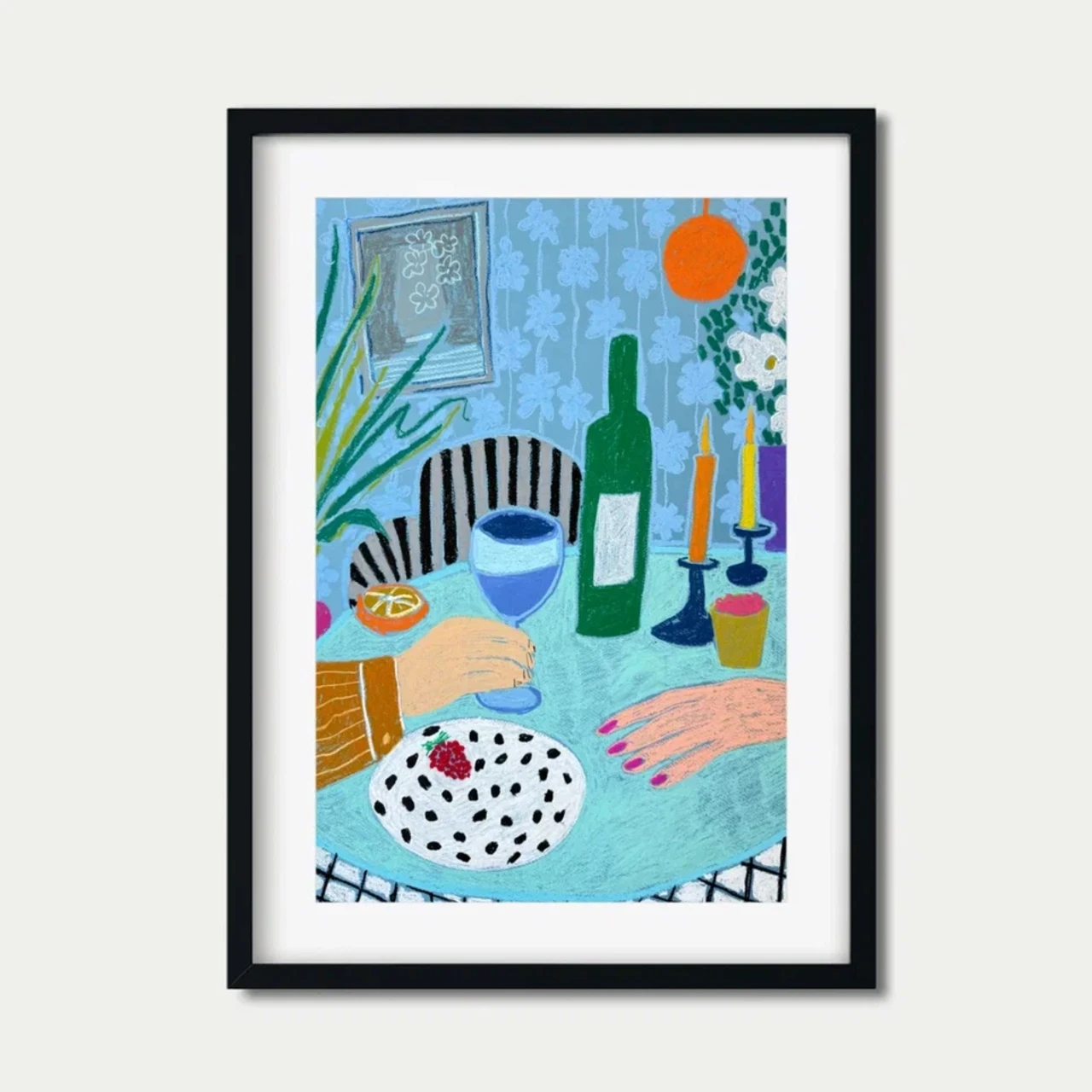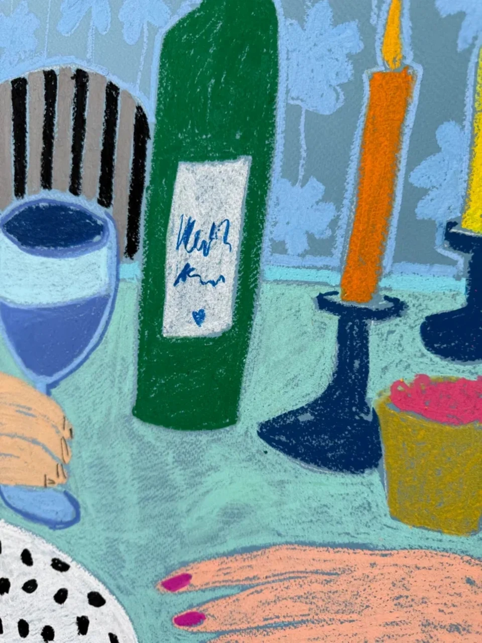 Композиция включает тщательно продуманную сцену за столом с бутылкой вина, полосатой скатертью, стулом с чёрными полосками, белыми цветами в вазе, тарелкой с клубничным десертом и свечами — всё это расположено на фоне голубых обоев с розовыми ногтями. Сбалансированные формы, насыщенные цвета и выразительные линии перекликаются с традициями современного натюрморта, оставаясь свежими и актуальными.