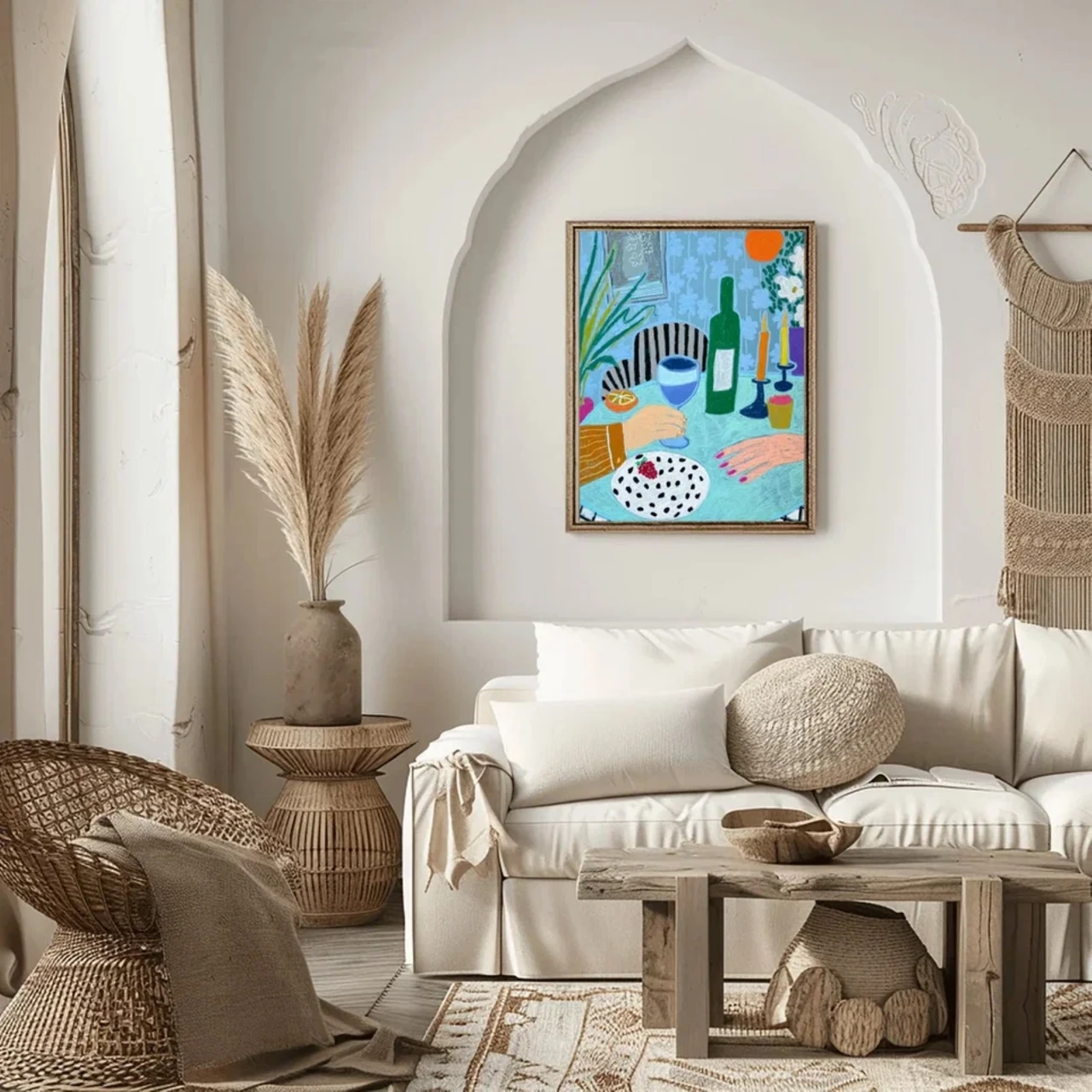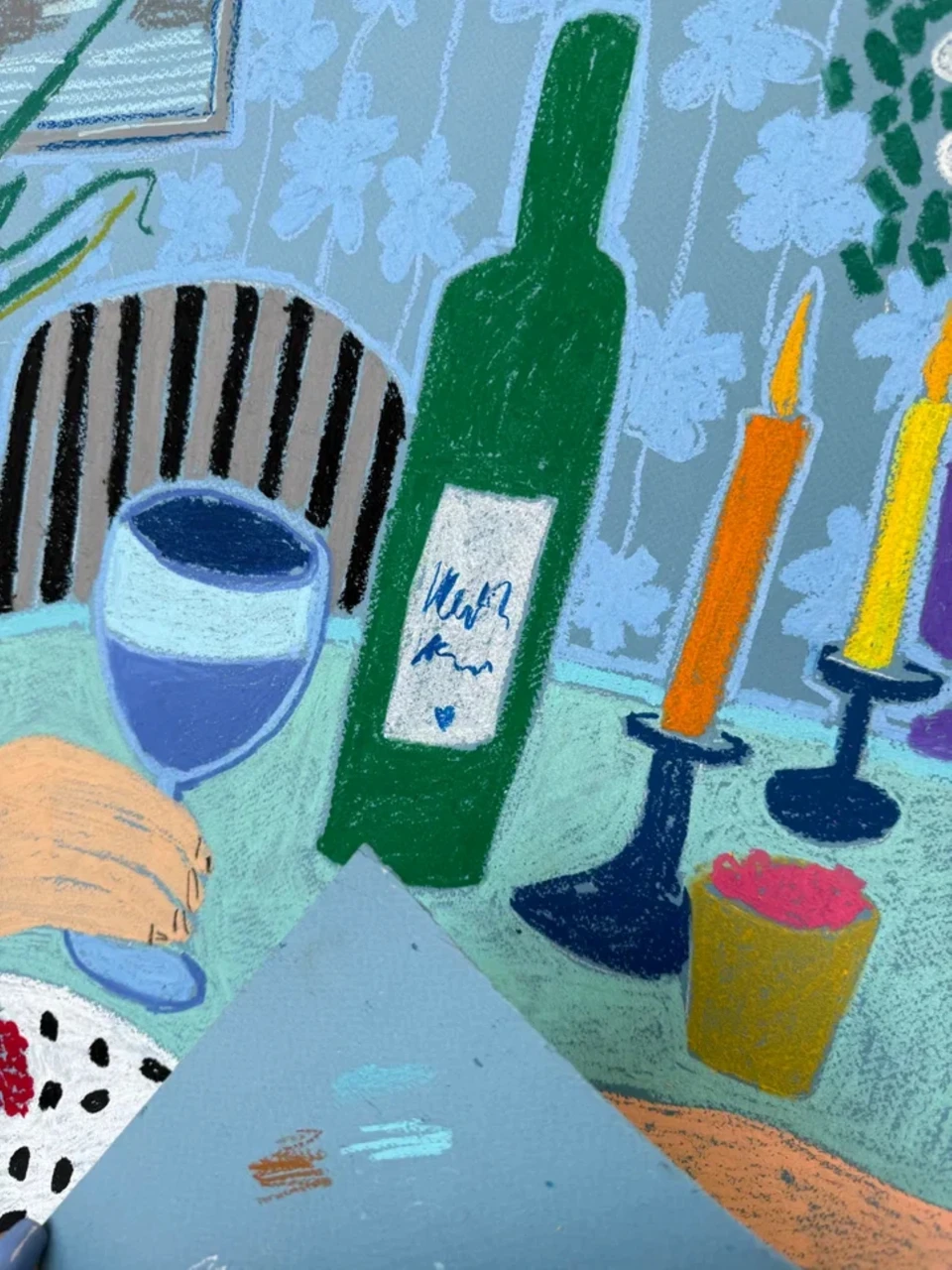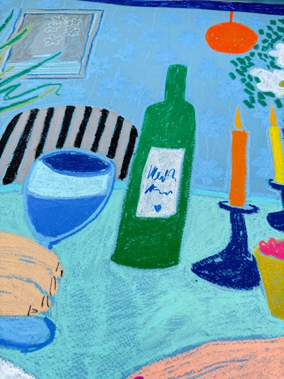 Добавьте яркую атмосферу современной элегантности в ваше пространство с этим натюрмортом масляной пастелью в стиле Матисса, изображающим две руки, держащие бокалы вина в уютной интерьерной сцене. Эта современная работа масляной пастелью сочетает голубые и зелёные оттенки с мягкими пастельными цветами, создавая тёплую и приглашающую атмосферу, вдохновлённую современными европейскими интерьерами.