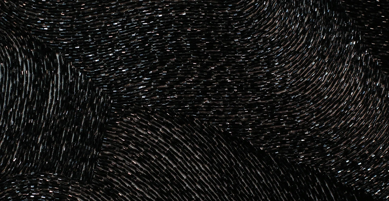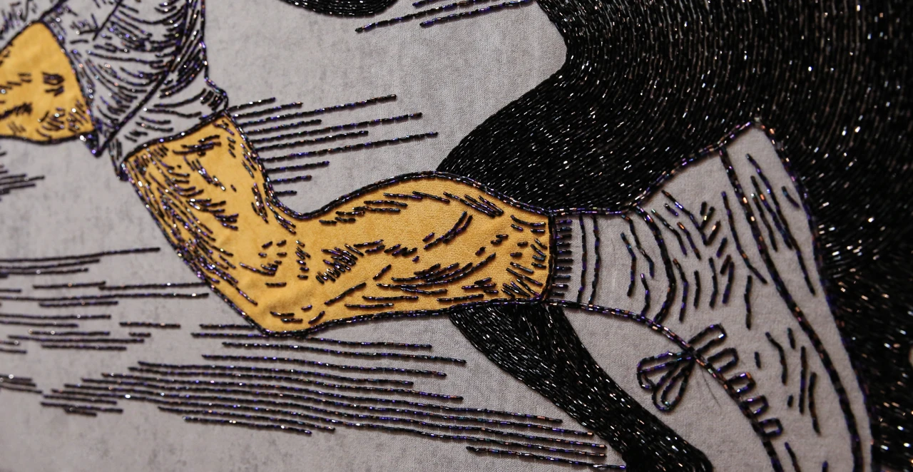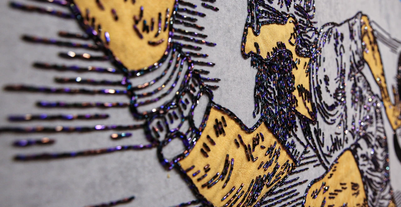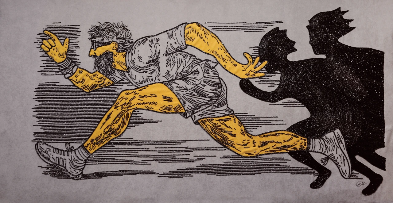 Вышивка, как выбранный медиум, добавляет слой смыслов: медленный, почти медитативный процесс ручного труда вступает в диалог со скоростью бега, с ускорением времени, с ритмом истории, который кажется бесконечной петлей.