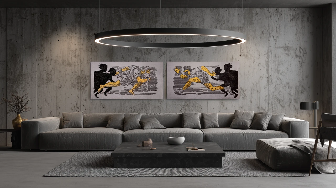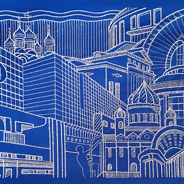 Вышивка, как выбранный медиум, добавляет слой смыслов: медленный, почти медитативный процесс ручного труда вступает в диалог со скоростью бега, с ускорением времени, с ритмом истории, который кажется бесконечной петлей.