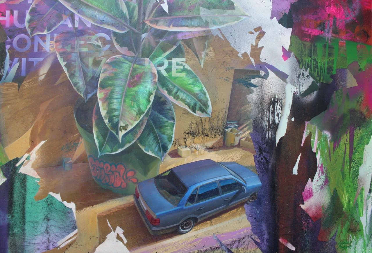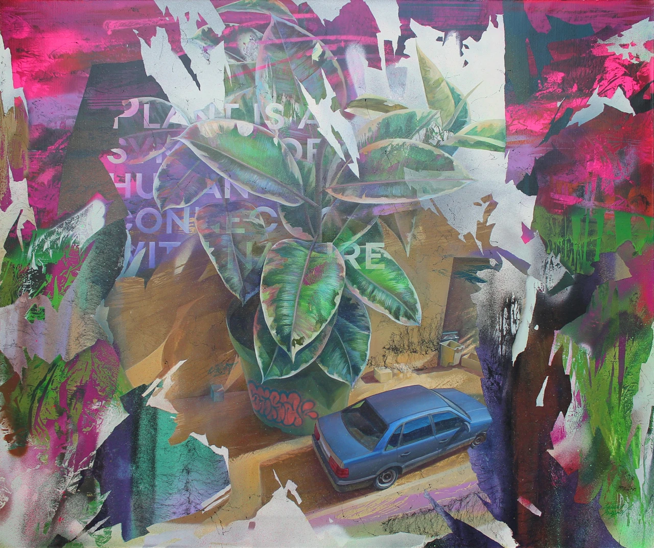 Работа относится к серии «City size» — это эксперимент, выходящий за рамки традиционного пейзажа и устремляющийся в сюрреалистичные пространства, где переплетаются урбанистическая реальность и сила природы. В основе этого цикла лежит идея оторванности человека от естественного мира, его существования в «каменных джунглях» и стремления вновь обрести утраченную связь. Главным действующим лицом здесь становится комнатное растение как символ этой связи, гиперболизированное до масштабов города. Это своеобразный манифест, призывающий к диалогу между человеком и природой, между искусственным и естественным.