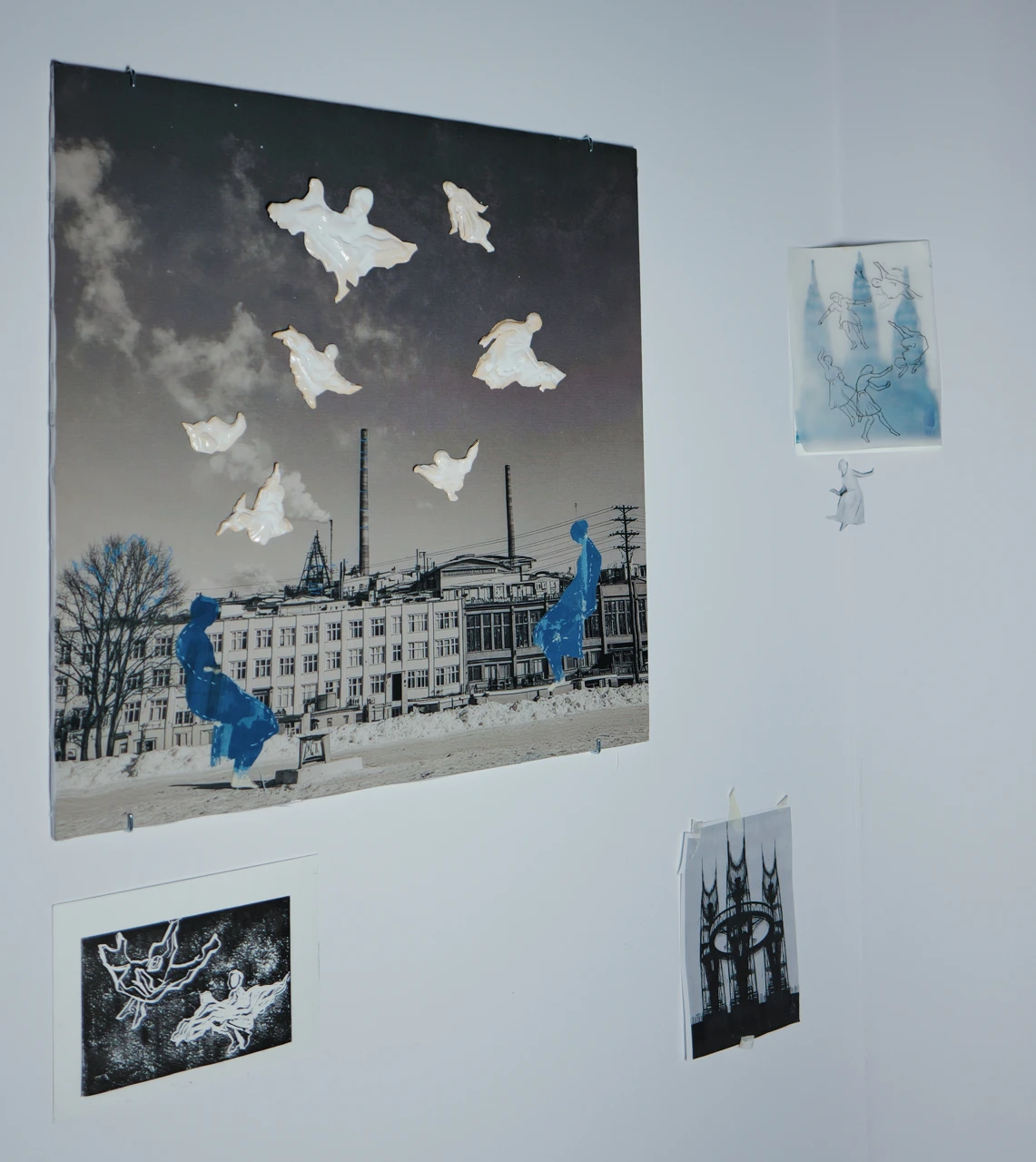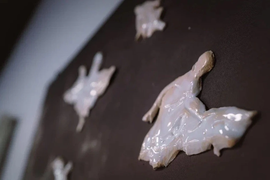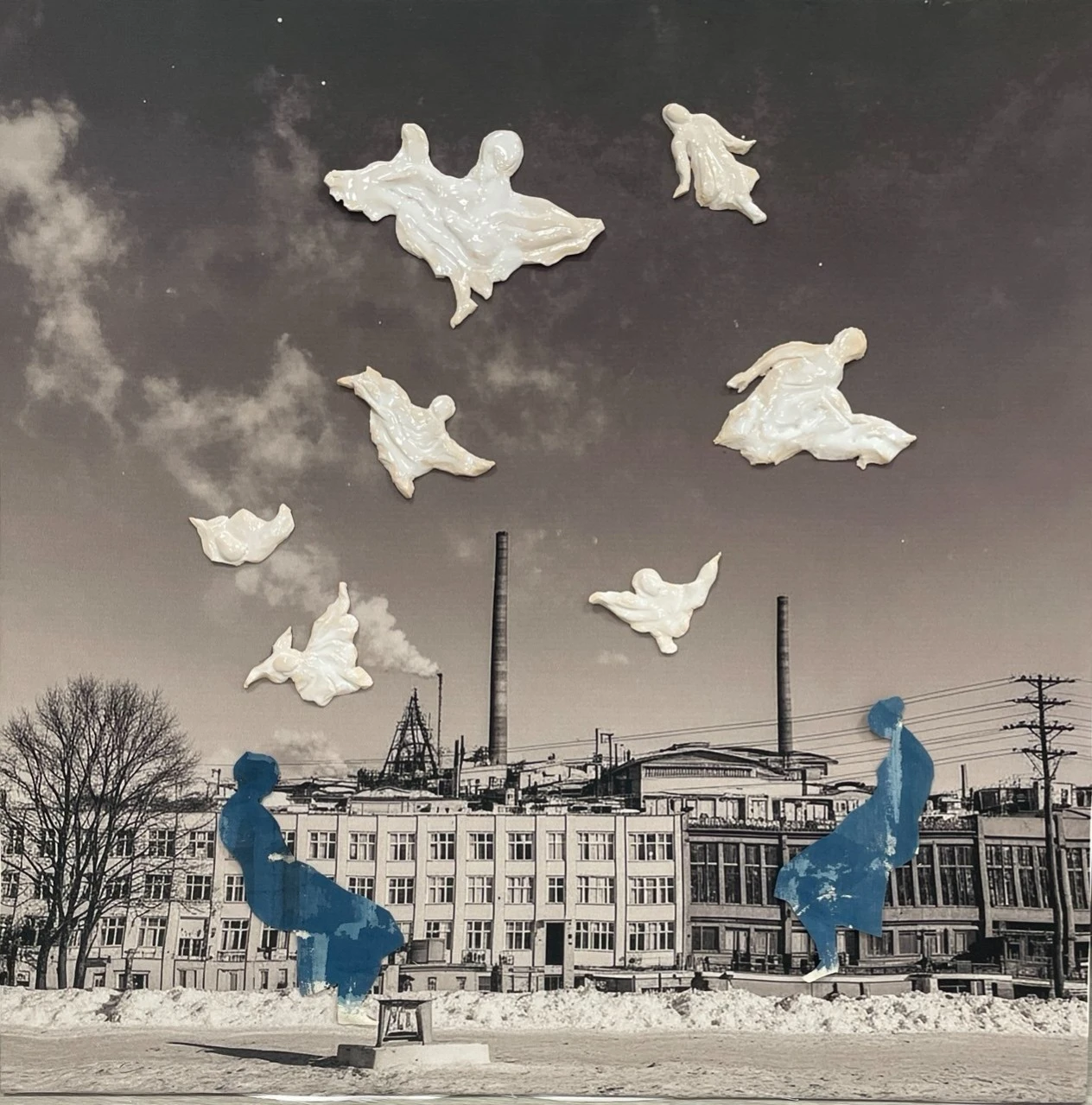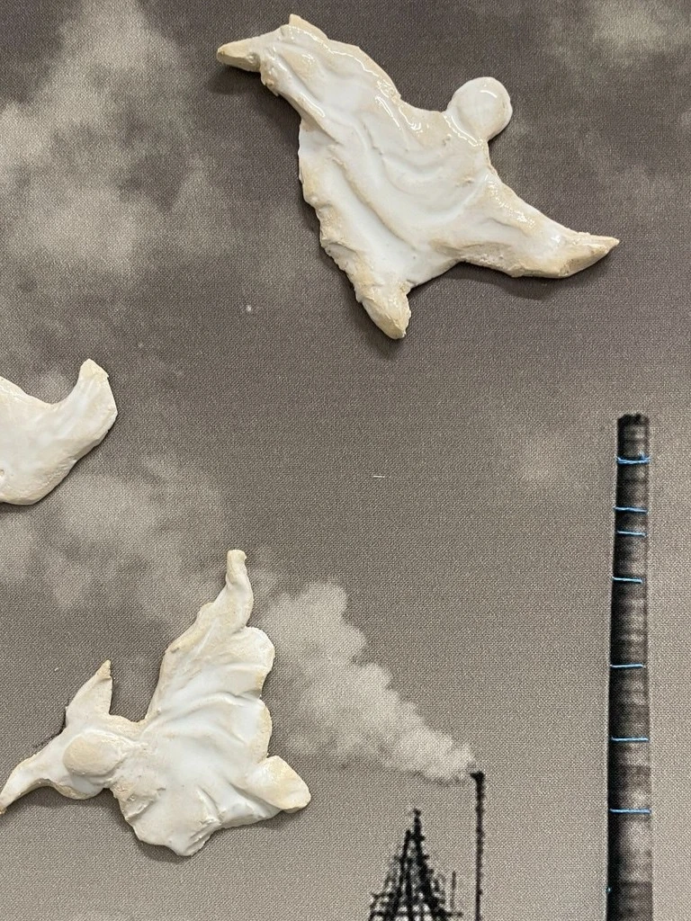 Панно из серии «Сеть сигналов» выполнено в смешанной технике: это сочетание изображения, созданного в соавторстве с генеративной моделью искусственного интеллекта, текстильных аппликаций, сделанных на основе реальных фотографий, вышивки и хрупких керамических женских образов.