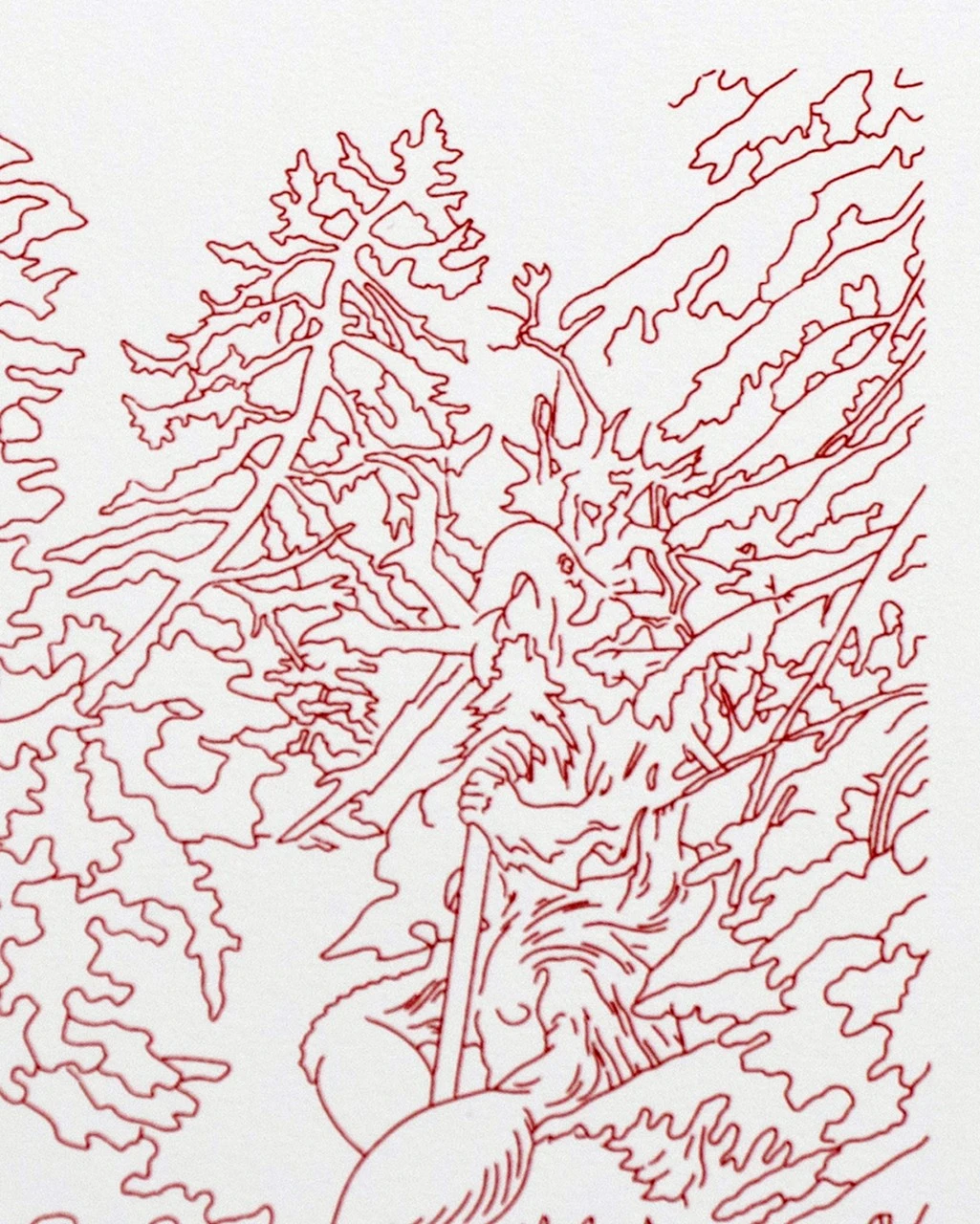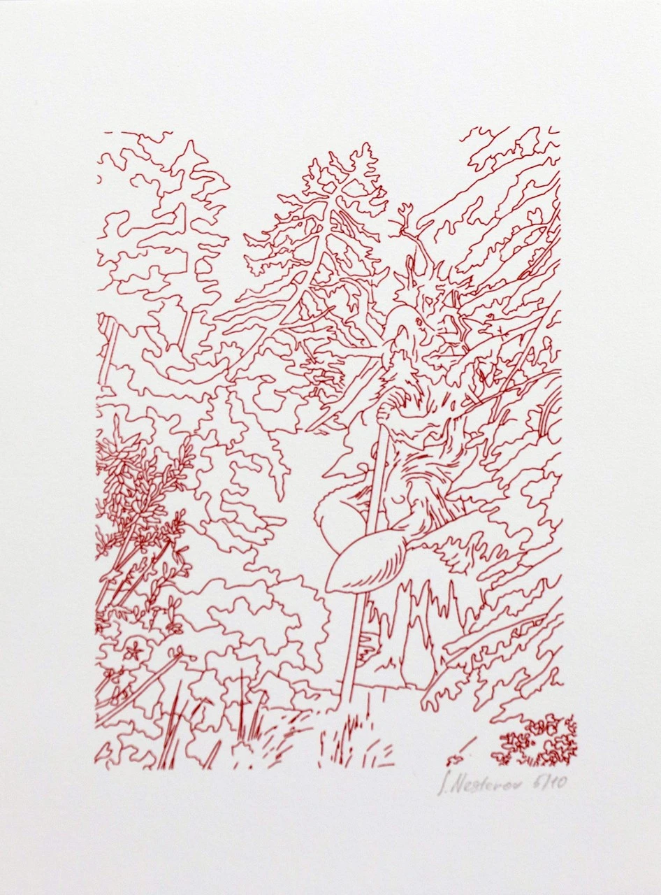 Мир Нестерова может существовать только постоянно разрастаясь, включая все новые и новые образы. Цифровые элементы дня сегодняшнего входят в сопряжения с архаичными техниками. Перед нами разрастается лес из символов и знаков, переплетенных между собой звериными тропами.