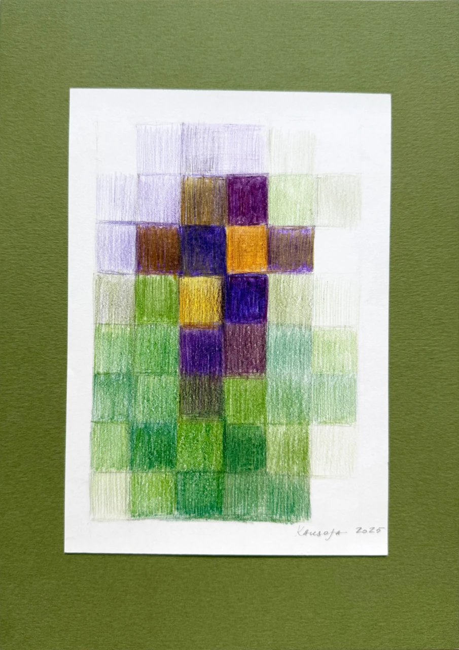 Через сочетание фигуративного сюжета и его «пиксельного» аналога я исследую напряжение между природным и искусственным, личным и общественным. В своих работах я акцентирую человеческое осязаемое проявление в мире, где все больше диджитального, цифрового и искусственного. Композиция следует порядку и правильной сетке, но штрих создает вибрацию цвета и фактуру, которая вносит тактильность и «неправильность», отражая человеческое присутствие.