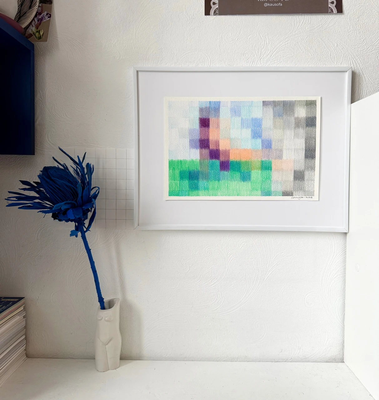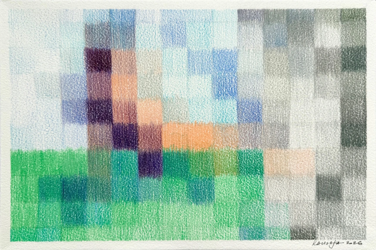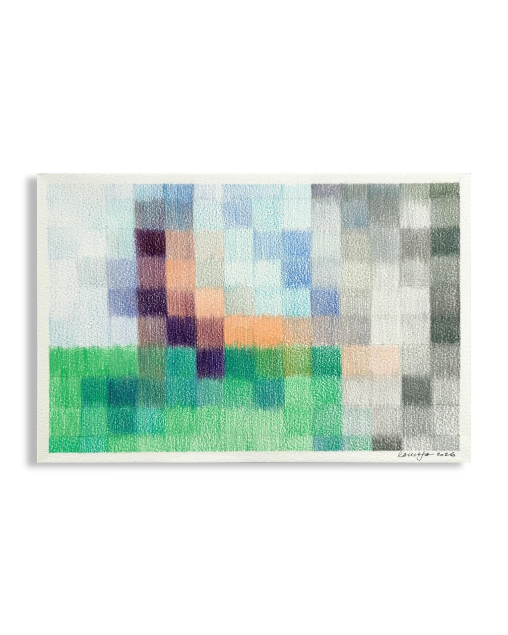 В своих работах я акцентирую человеческое осязаемое проявление в мире, где все больше диджитального, цифрового и искусственного. Композиция следует порядку и правильной сетке, но штрих создает вибрацию цвета и фактуру, которая вносит тактильность и «неправильность», отражая человеческое присутствие.