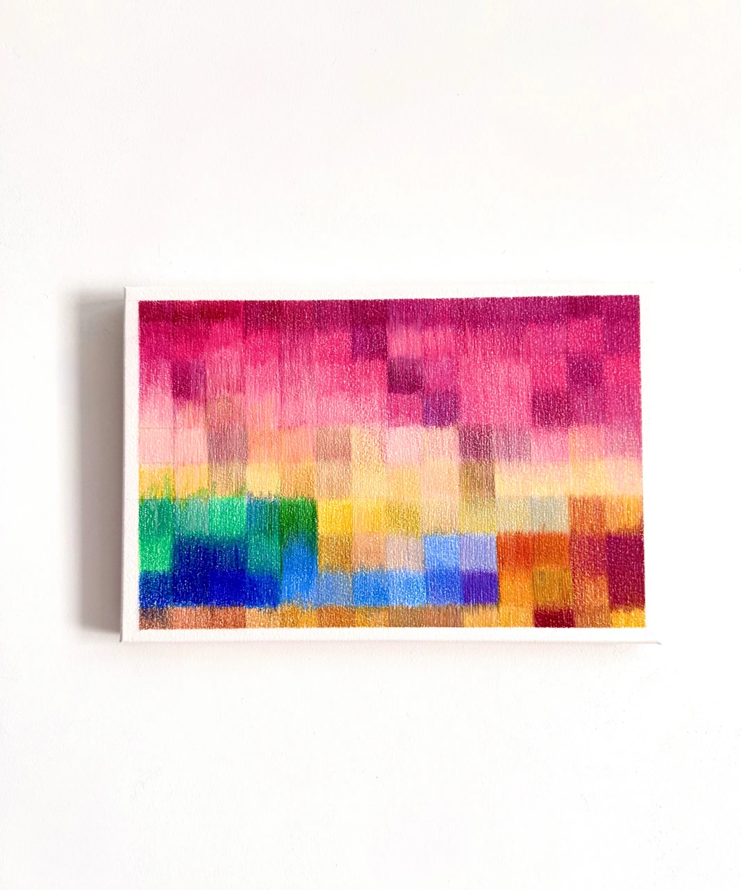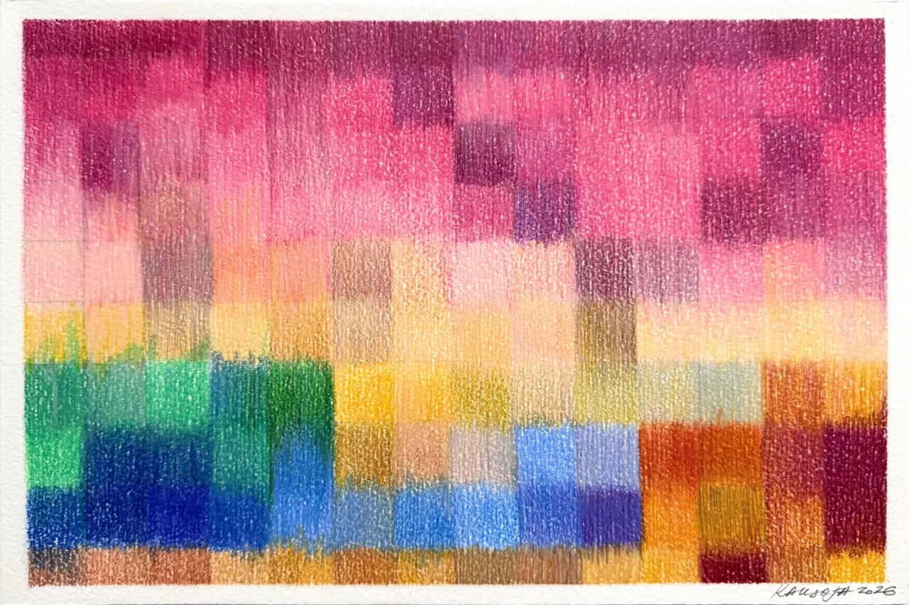 В своих работах я акцентирую человеческое осязаемое проявление в мире, где все больше диджитального, цифрового и искусственного. Композиция следует порядку и правильной сетке, но штрих создает вибрацию цвета и фактуру, которая вносит тактильность и «неправильность», отражая человеческое присутствие.