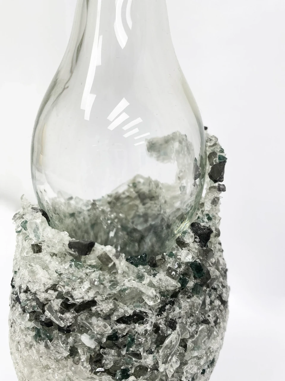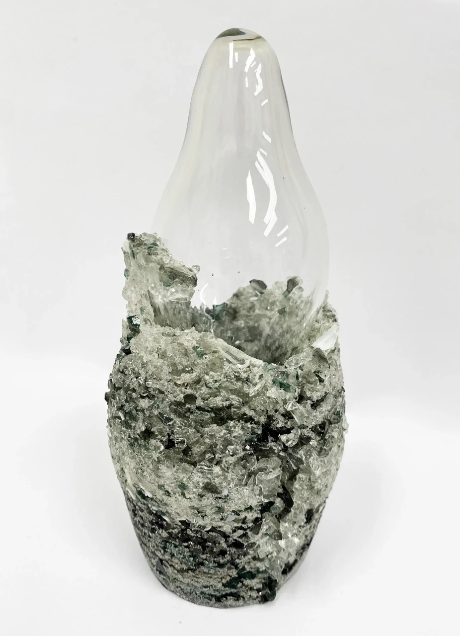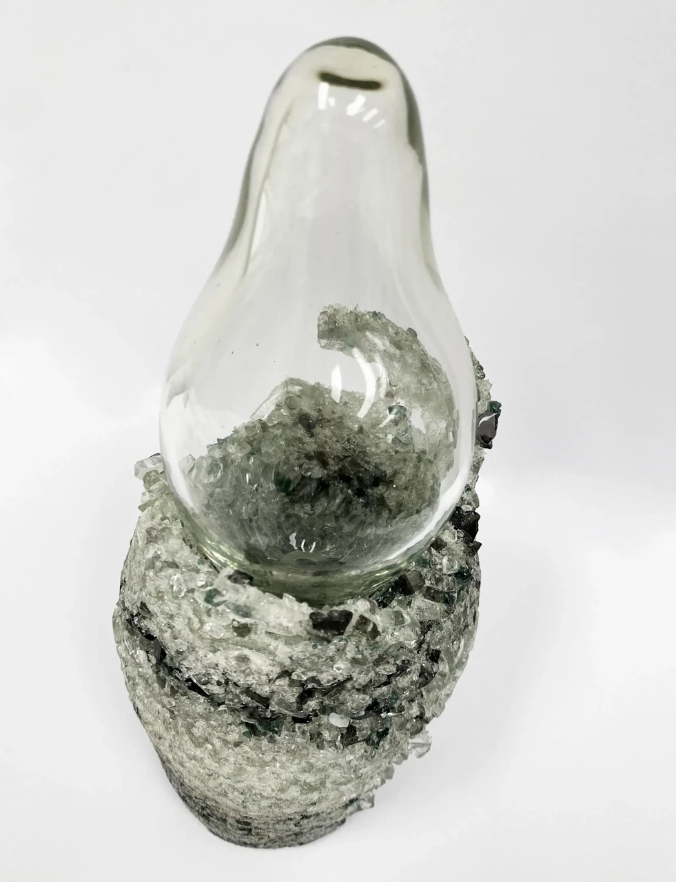 Серия арт-объектов «Обновление природы» вдохновлена пробуждением природы и отражает мысль о невероятной силе жизни. Художница подчеркивает контраст между зарождающимся и уходящим, посредством разности фактур и техник. Гутное бесцветное стекло, благодаря своей прозрачности и плавности, помогает отобразить быстротечное переходное состояние хрупкого и чистого начала. Фантазийные образы ростков основаны на интуитивном ощущении природных форм. Они сделаны во французской технике пат-де-вер, которая дает цветовые акценты, градиенты и сочетания.