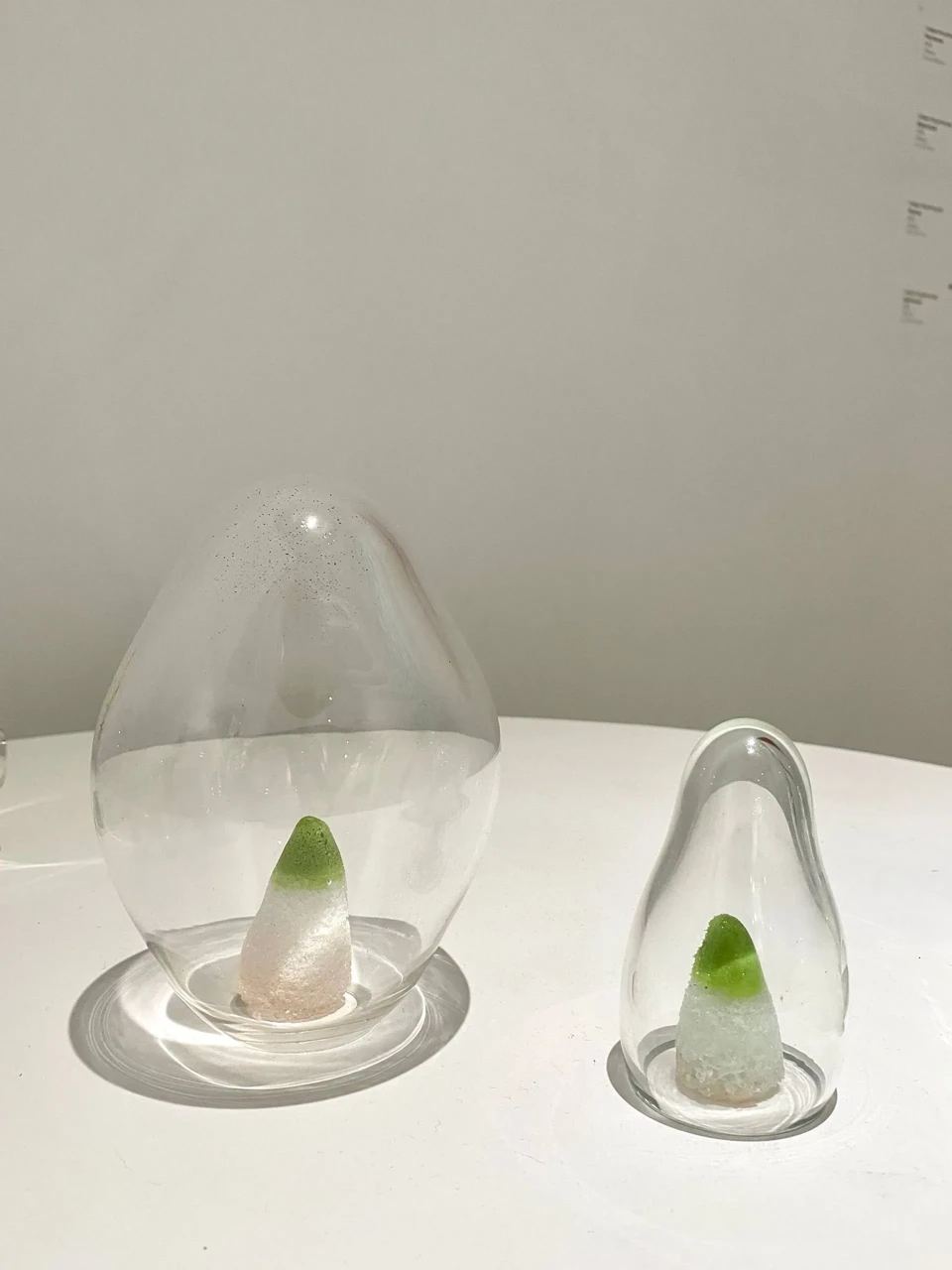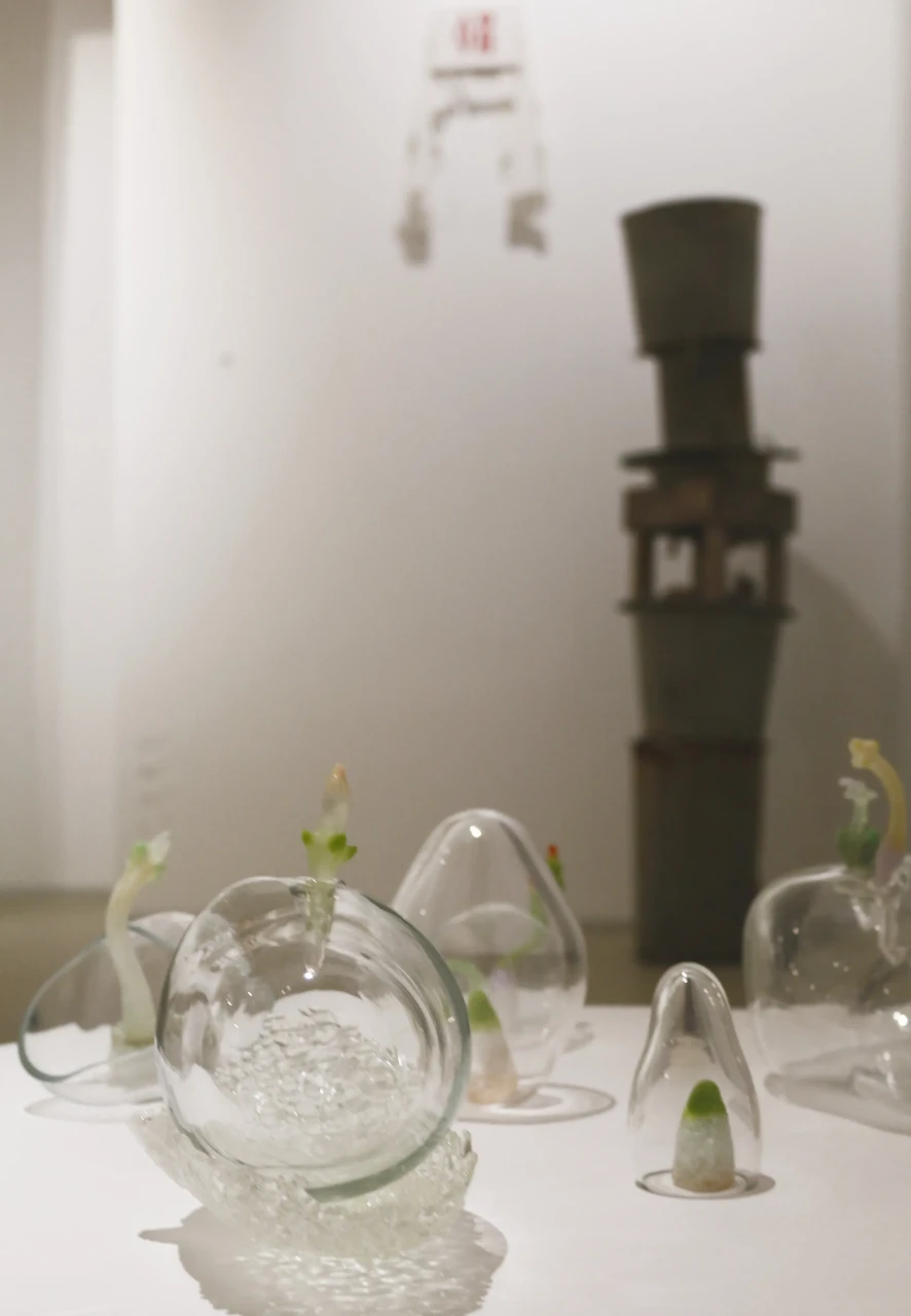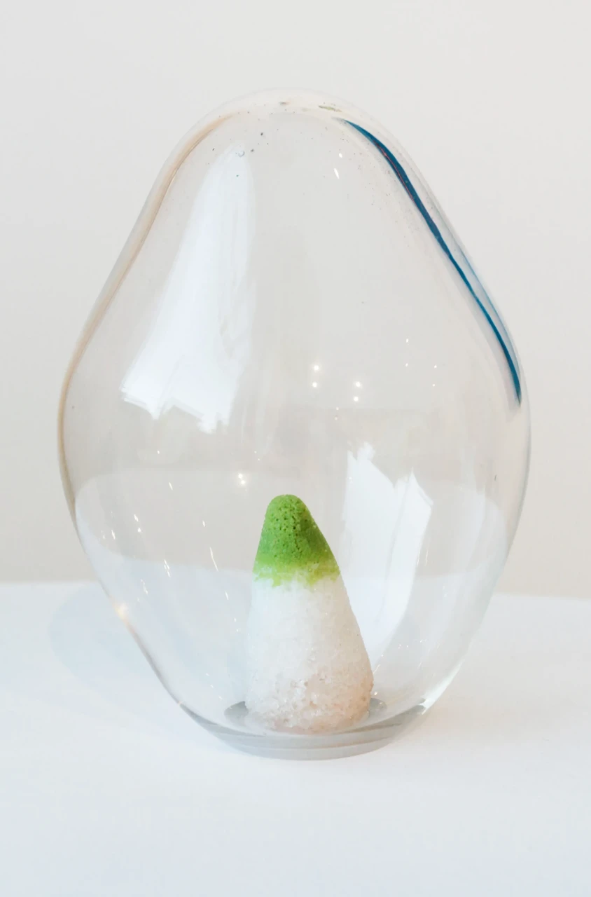 Серия арт-объектов «Обновление природы» вдохновлена пробуждением природы и отражает мысль о невероятной силе жизни. Художница подчеркивает контраст между зарождающимся и уходящим, посредством разности фактур и техник. Гутное бесцветное стекло, благодаря своей прозрачности и плавности, помогает отобразить быстротечное переходное состояние хрупкого и чистого начала. Фантазийные образы ростков основаны на интуитивном ощущении природных форм. Они сделаны во французской технике пат-де-вер, которая дает цветовые акценты, градиенты и сочетания.