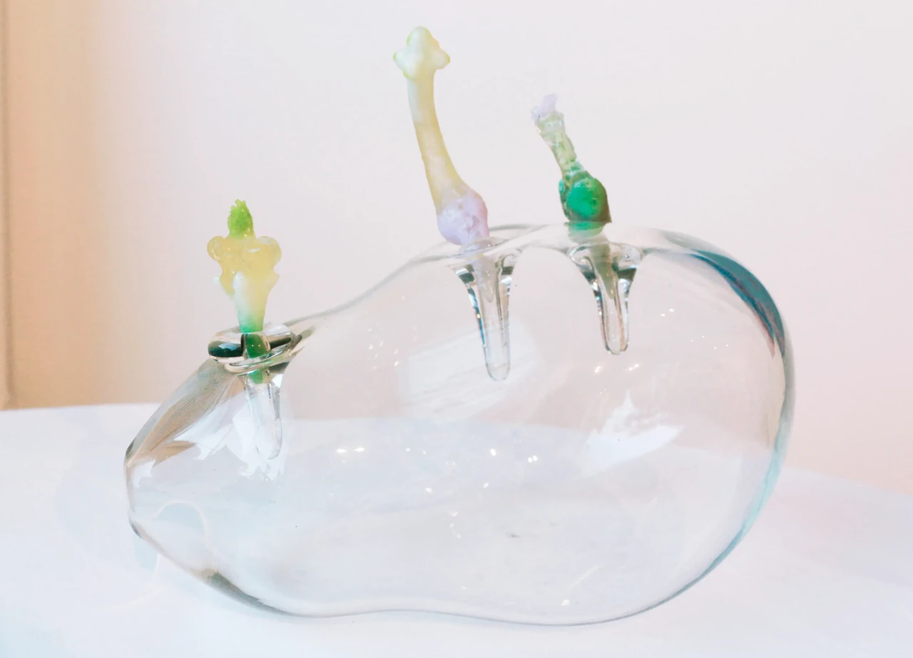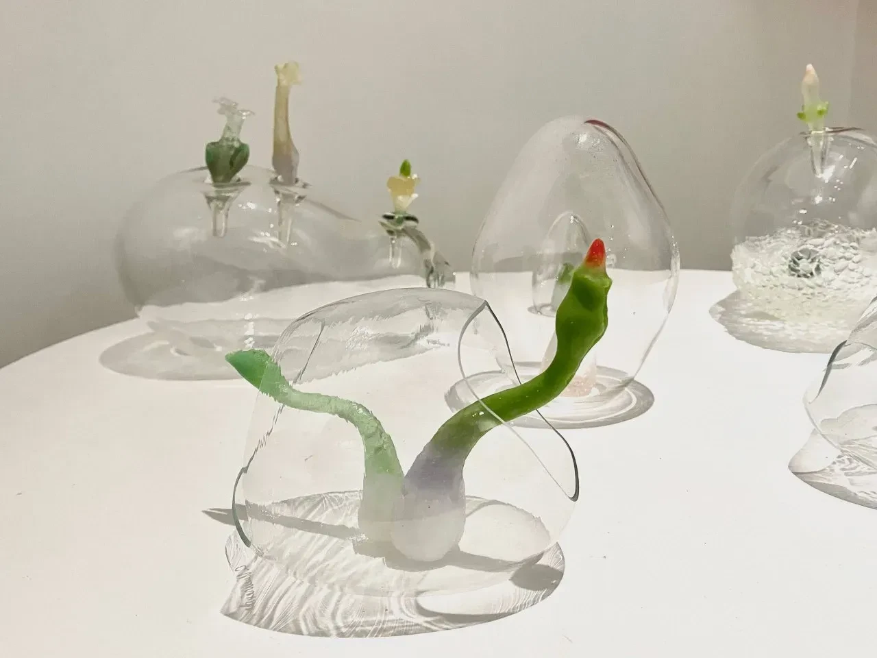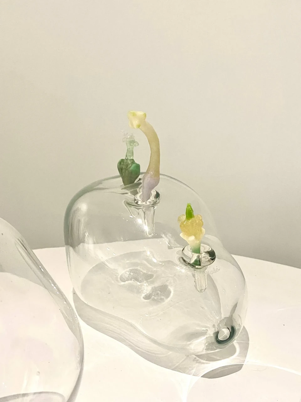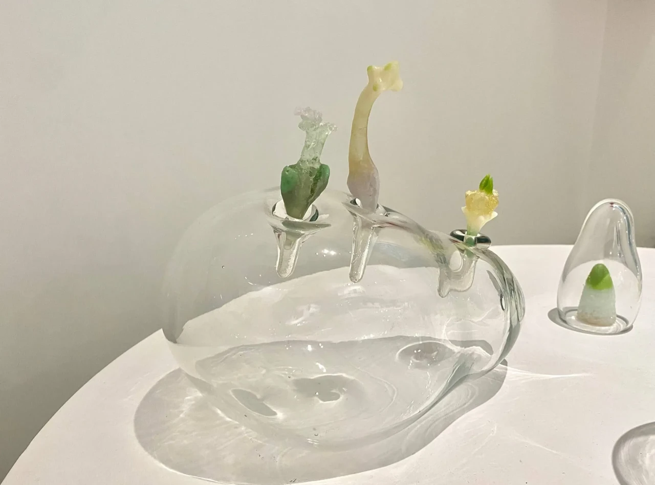 Серия арт-объектов «Обновление природы» вдохновлена пробуждением природы и отражает мысль о невероятной силе жизни. Художница подчеркивает контраст между зарождающимся и уходящим, посредством разности фактур и техник. Гутное бесцветное стекло, благодаря своей прозрачности и плавности, помогает отобразить быстротечное переходное состояние хрупкого и чистого начала. Фантазийные образы ростков основаны на интуитивном ощущении природных форм. Они сделаны во французской технике пат-де-вер, которая дает цветовые акценты, градиенты и сочетания.