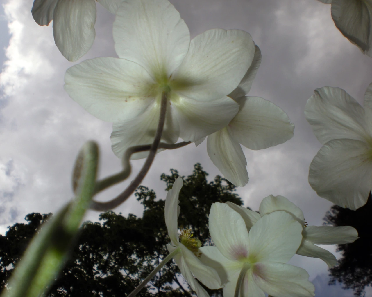 Работа «Небеса I» — это авторская фотография, запечатлевшая крупным планом белые цветы на фоне пасмурного неба. Композиция построена с нижней точки, что создает ощущение взгляда вверх, словно сквозь лепестки цветов. Мягкие, полупрозрачные лепестки контрастируют с темными силуэтами деревьев на заднем плане. Нежные оттенки розового и сиреневого едва уловимы в центре некоторых цветков, добавляя тонкую цветовую нюансировку.