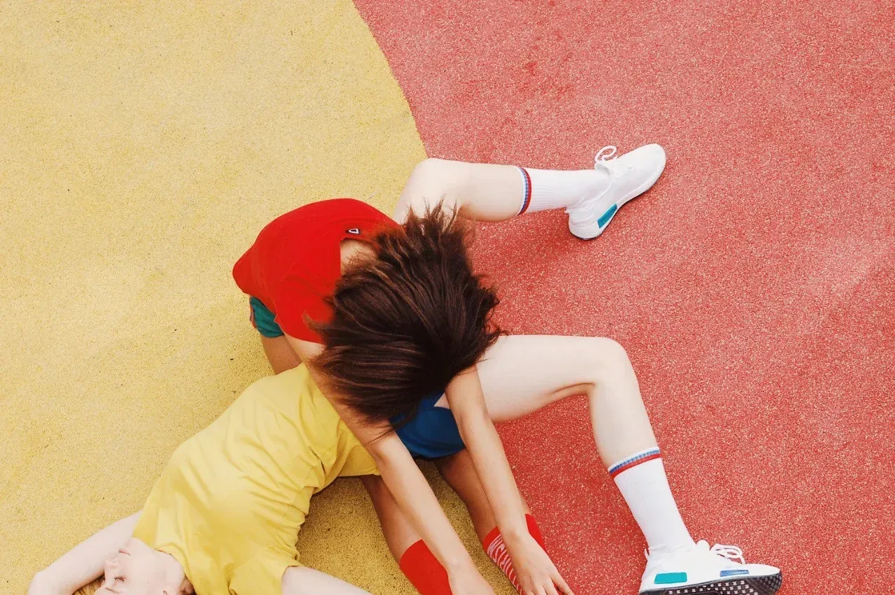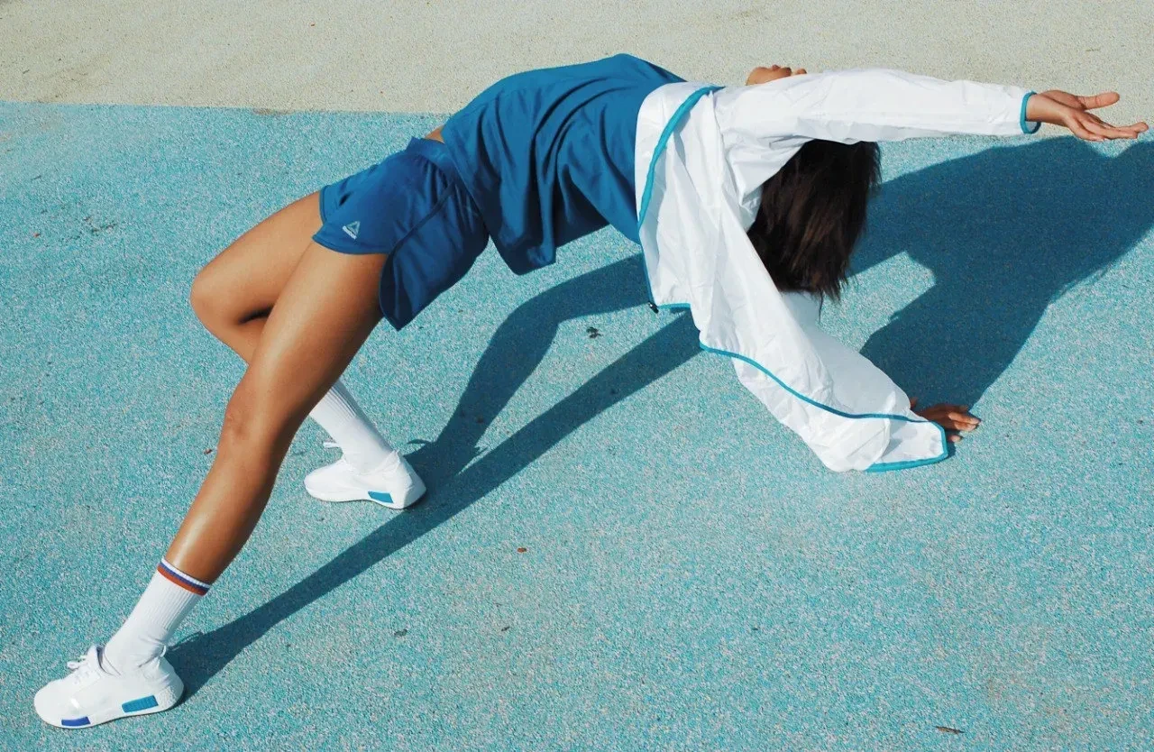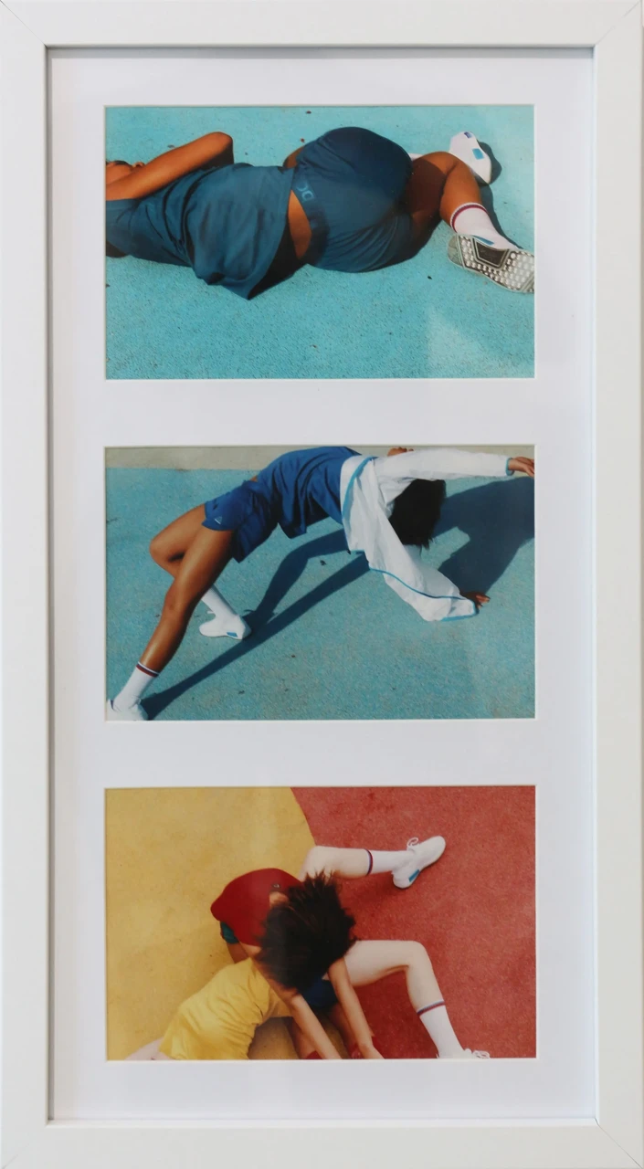 Работа «Спорт I» представляет собой серию из трех фотографий, запечатлевших человеческие фигуры в динамичных позах на фоне ярких, текстурных поверхностей.