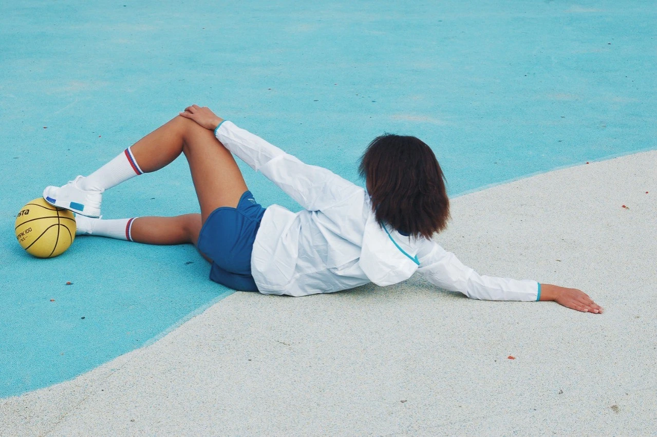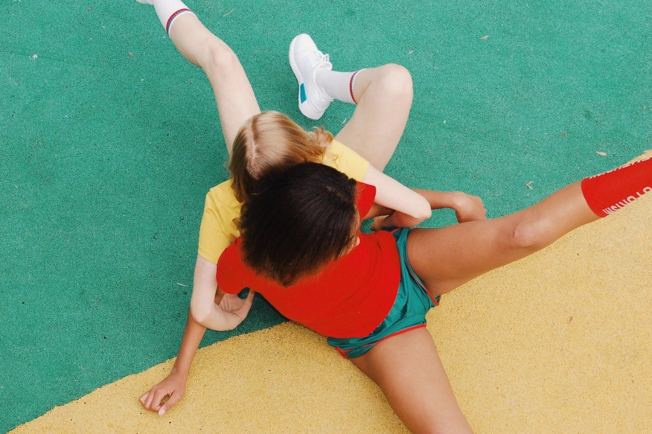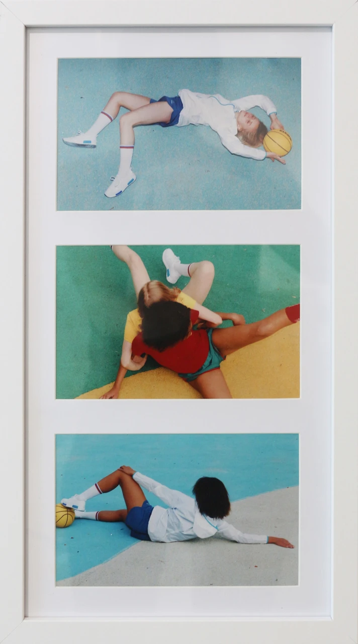 Работа «Спорт II» представляет собой триптих, выполненный в технике цифровой печати на фотобумаге. Каждый снимок запечатлен с верхней точки, что создает ощущение наблюдения за игрой или тренировкой. Цветовая палитра работы насыщена яркими, контрастными цветами: голубой, зеленый, желтый, красный. Взаимодействие тел и спортивный реквизит подчеркивают динамику и энергию, присущие спорту.