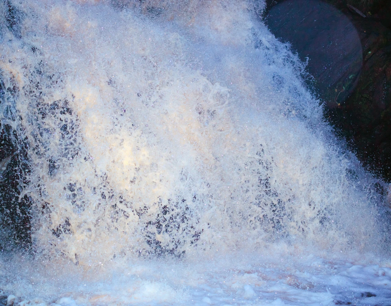 Работа «Водопад» — это фотография, запечатлевшая динамику падающей воды. Композиция построена на игре света и тени, подчеркивающей текстуру брызг и пены. Холодные оттенки синего и белого контрастируют с теплыми золотистыми бликами, создавая ощущение движения и свежести. Многослойность капель и их хаотичное расположение формируют завораживающий визуальный ритм.