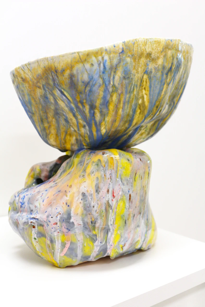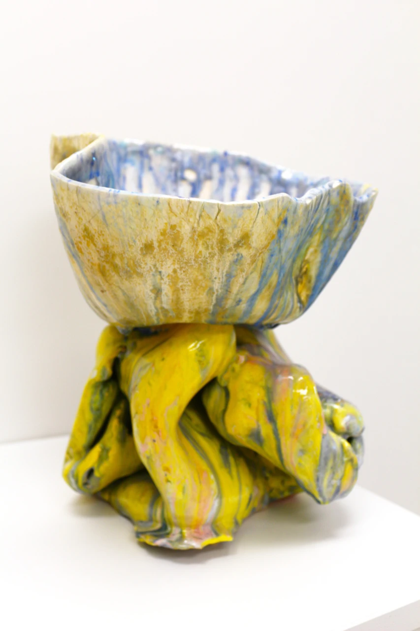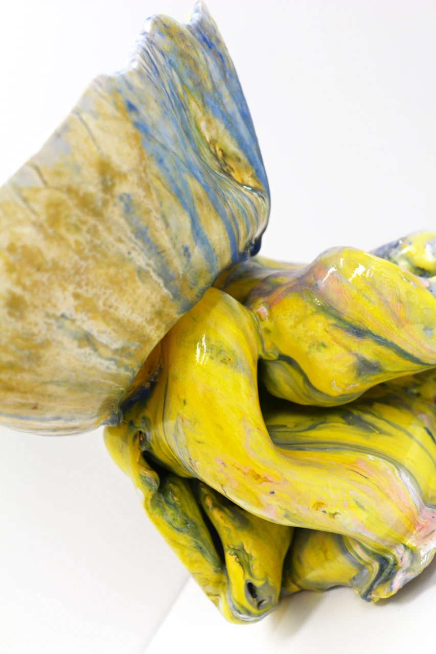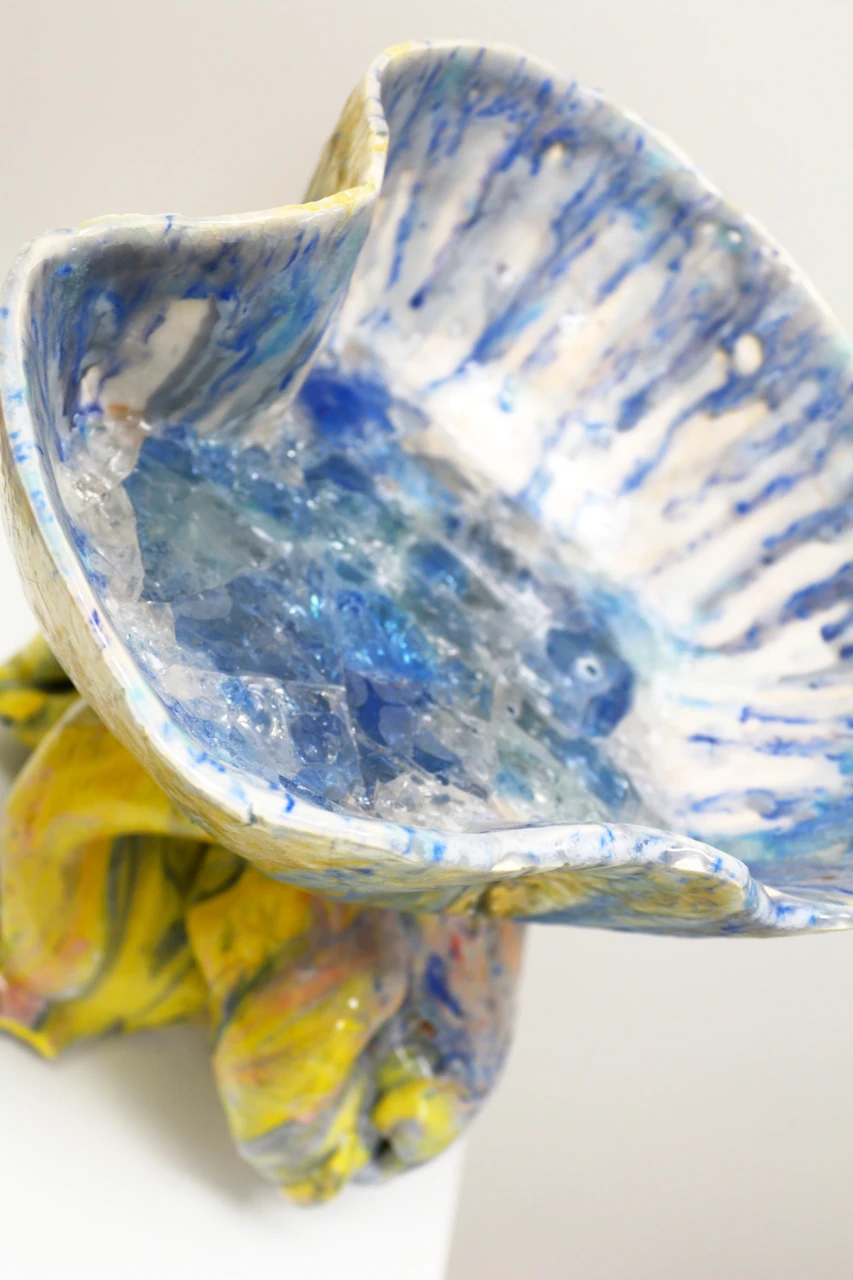 Работа «Чаша Нимфея» — это авторская скульптура из керамики, отличающаяся выразительной формой и богатой текстурой. Композиция состоит из двух частей: верхней, напоминающей чашу с неровными краями, и нижней, представляющей собой динамичную, скульптурную основу. Обе части покрыты глазурью, создающей эффект многослойности и игры света. Визуальная составляющая работы завораживает сочетанием ярких цветов. Преобладают оттенки желтого, переходящие в охристые и золотистые тона, которые контрастируют с синими и голубыми разводами. Эти цветовые переходы создают ощущение движения и глубины.