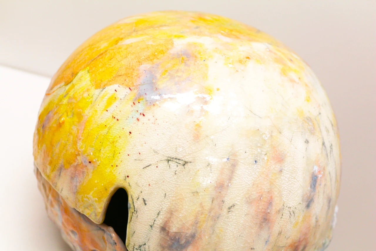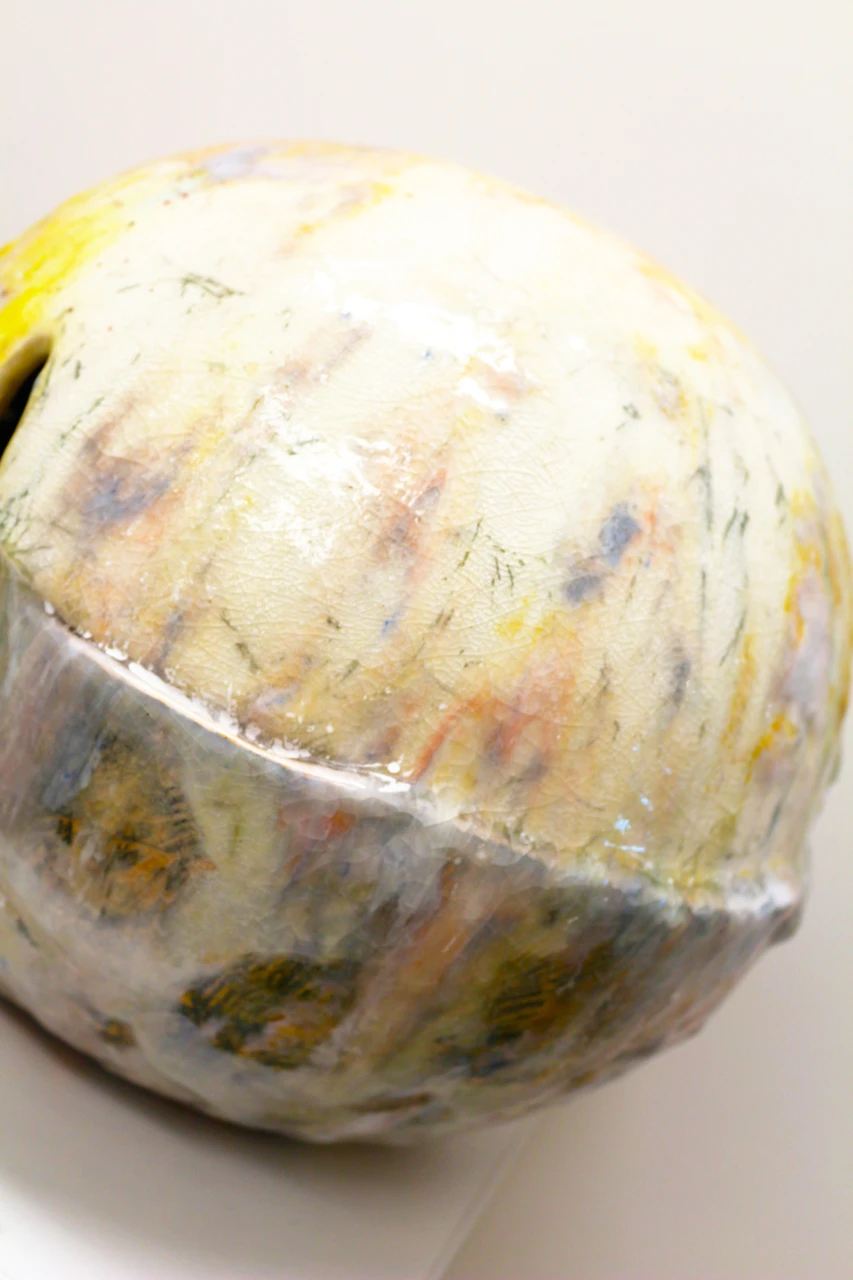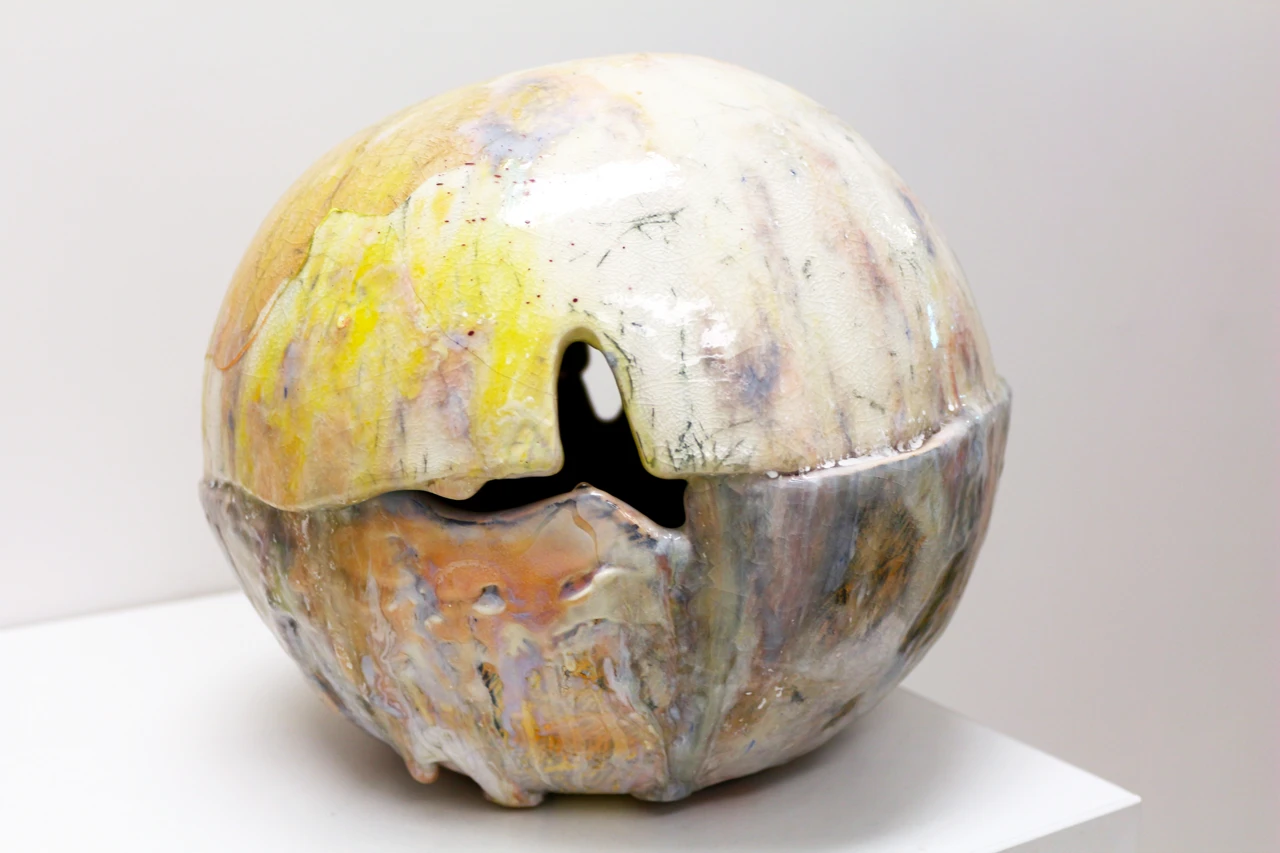 Работа «Венера» — это авторская скульптура из керамики. Общая форма объекта напоминает шар, разделенный горизонтальной линией. Верхняя часть скульптуры окрашена в светлые тона с вкраплениями желтого, белого и нежно-розового, создавая ощущение мягкости и света. Нижняя часть, напротив, более темная, с преобладанием серых, коричневых и оранжевых оттенков, что придает ей глубину и текстурность. Взаимодействие глазури и керамики создает уникальные цветовые переходы и фактурные эффекты.