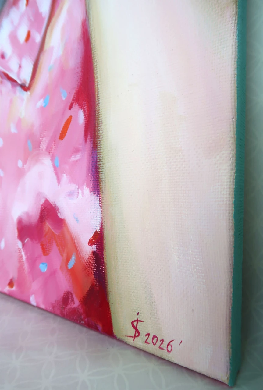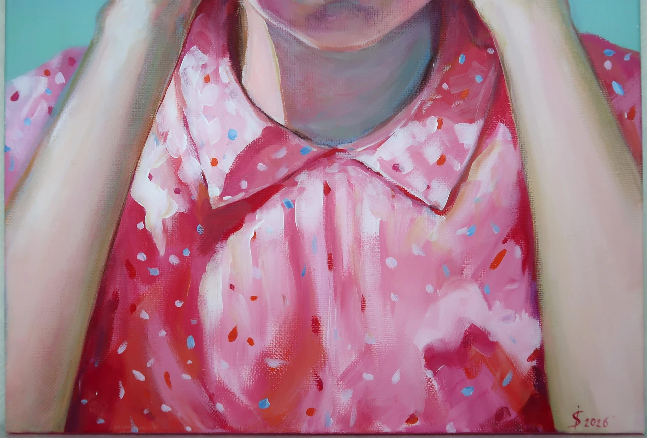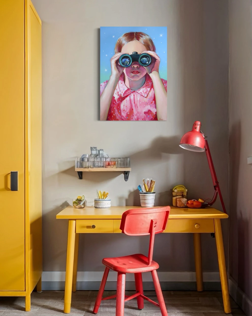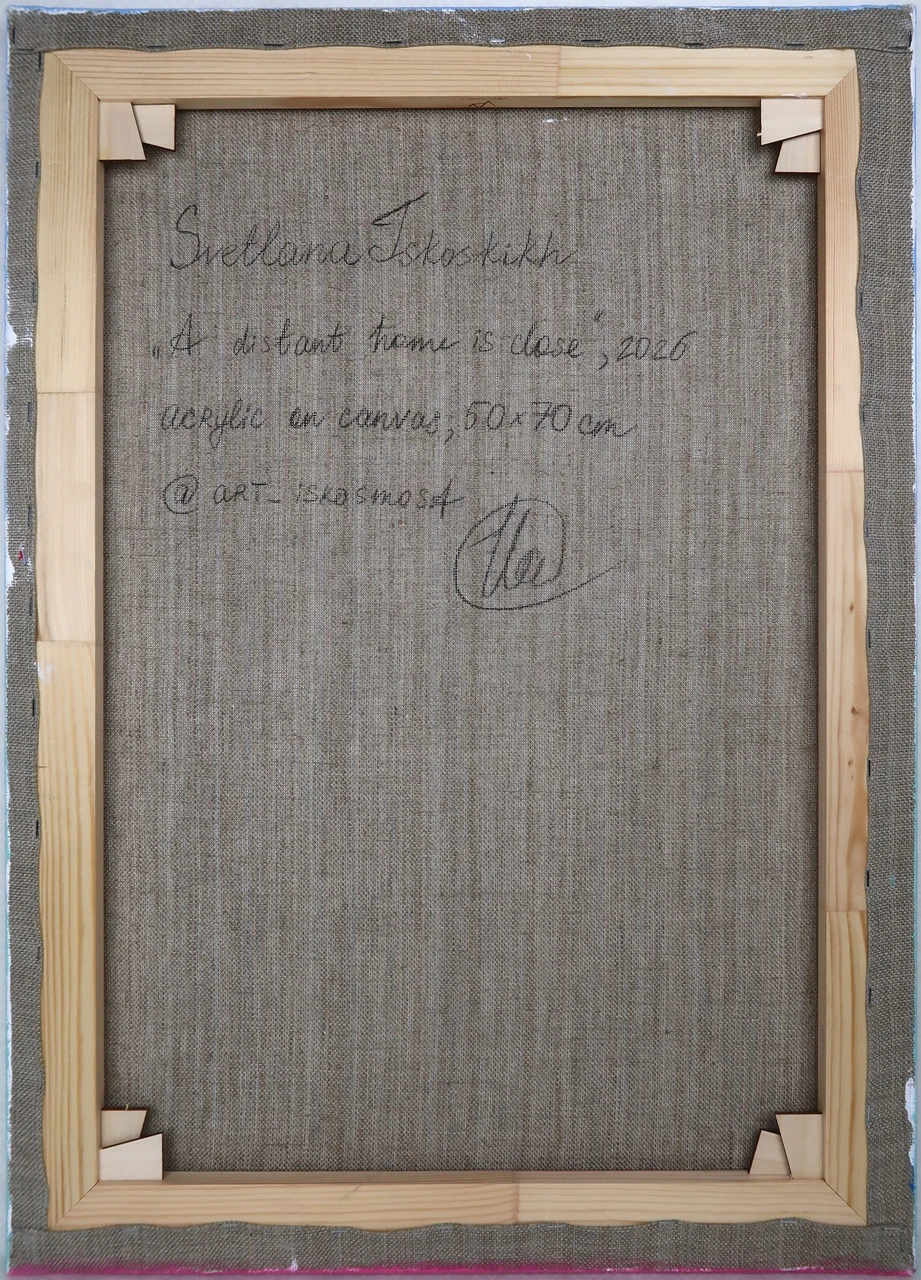 Картина «Далекий дом близко» художницы Светланы Искоских предстает перед зрителем как тонко выстроенный визуальный диалог, в котором переплетаются личное и космическое, близкое и далекое. Центральная фигура — девочка в ярко-розовом платье в горошек — становится не просто персонажем, но символическим медиатором между земным и бесконечным. Её взгляд, устремленный через бинокль, не просто фиксирует образ планеты, а трансформирует восприятие зрителя, приглашая нас увидеть Землю через призму детской непосредственности и одновременно глубокой рефлексии.