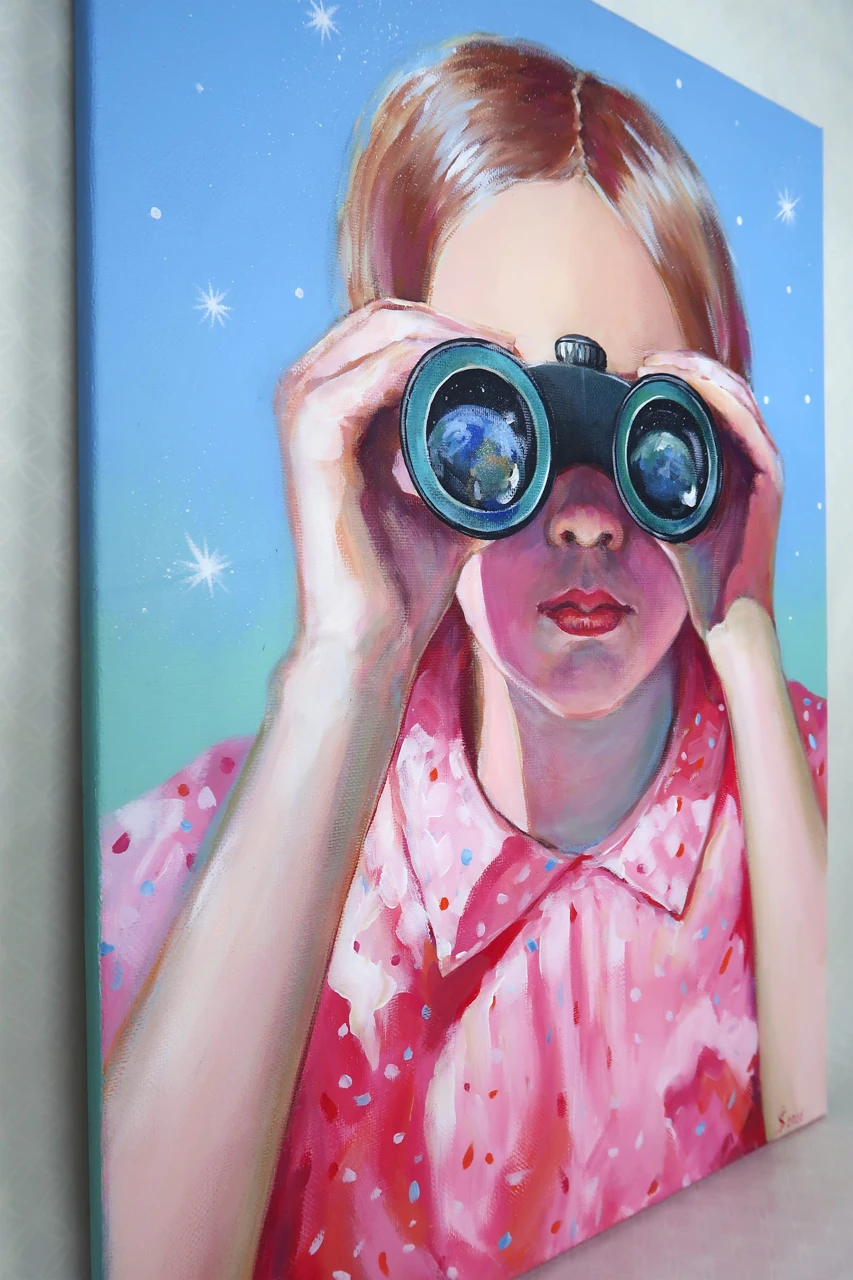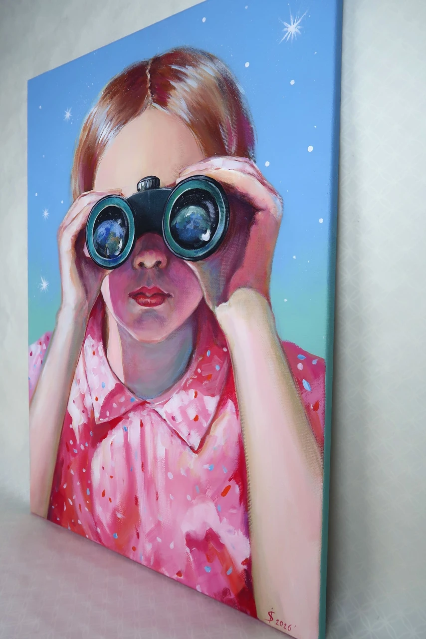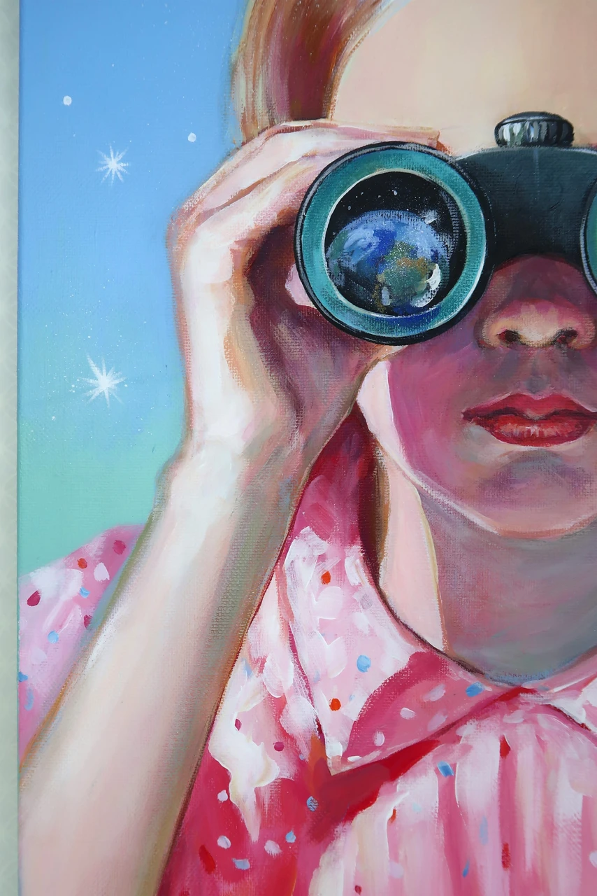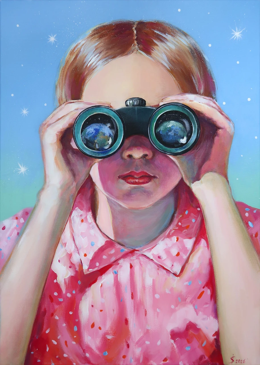 Бинокль выступает здесь как метафорический портал, соединяющий внутренний мир девочки с безграничной вселенной, а отражение планеты в увеличительном стекле приобретает сакральный статус — она предстает в своем величии и уязвимости, одновременно недосягаемая и близкая. Палитра фона — плавный градиент от нежно-голубого к бирюзовому — создает атмосферу умиротворенного созерцания, где небесные и водные мотивы символизируют хрупкость природы и необходимость её бережного отношения.