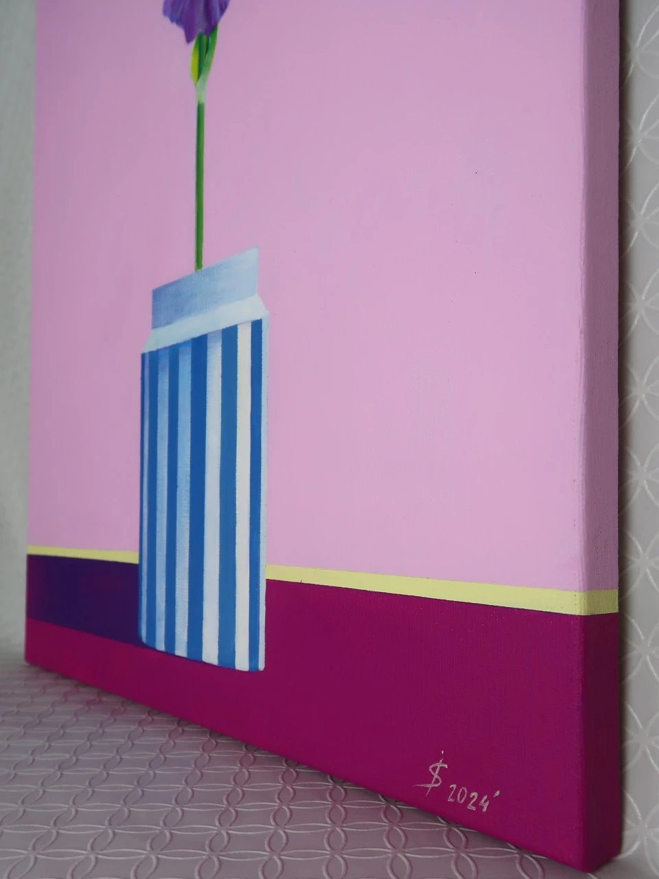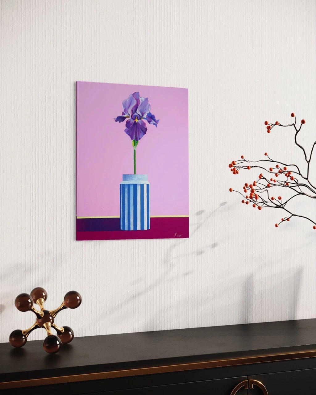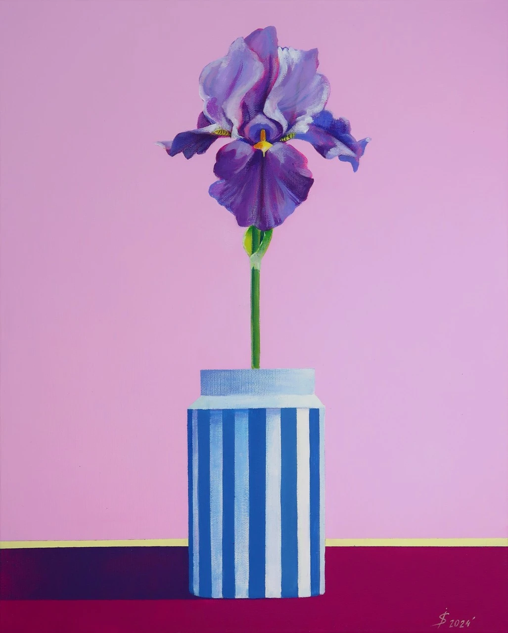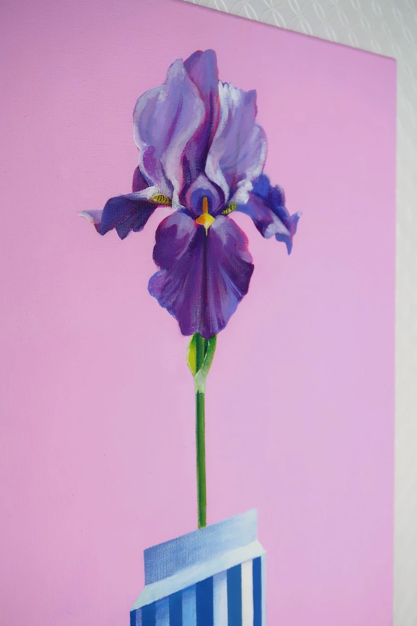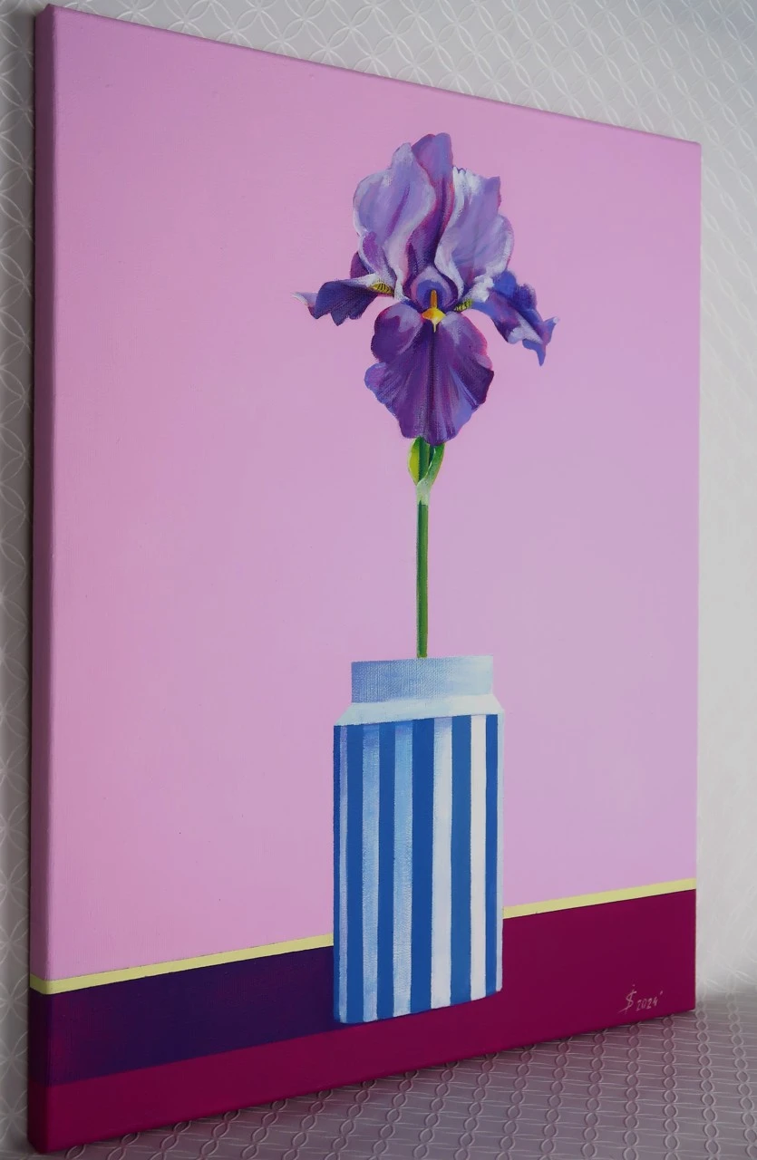 «Мудрость», современный натюрморт с цветком в полосатой вазе — популярный выбор для современных интерьеров. Фиолетовый цветок ириса символизирует мудрость, духовность и острый ум. Картина выполнена в фирменном стиле художницы Искоских Светланы: однотонный розовый фон символизирует нежность и чувственность, желтая полоса добавляет яркости и радости, а контраст между цветами вазы и цветка ириса создает эффект гармонии и целостности. Позвольте этой картине войти в ваш дом и наполнить его яркими эмоциями и красотой ириса.