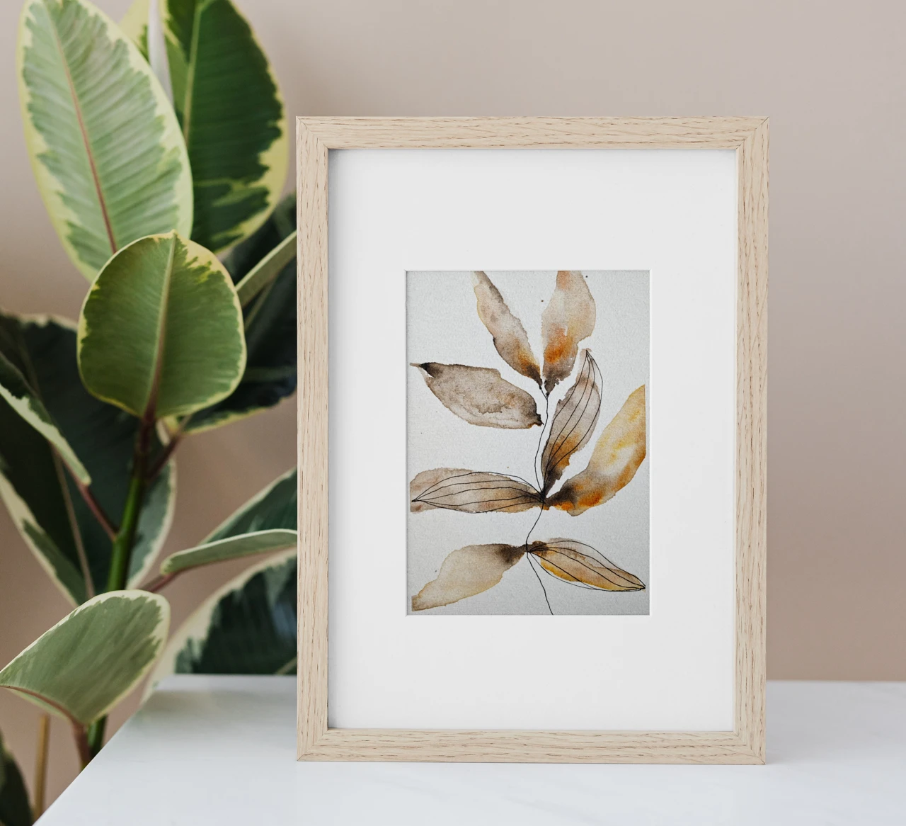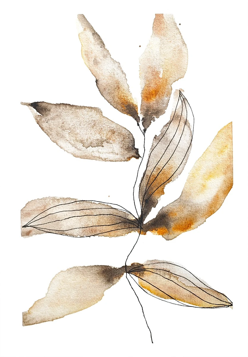 Картина «Осенняя Бронза» — это утончённая ботаническая абстракция в стиле минималюкс, где природа обретает графическую чистоту. На тонкой ветке расположились листья, написанные плавным градиентом от глубокого коричневого к тёплому оранжевому. Деликатные бронзовые акценты и прорисовка деталей чёрной капиллярной ручкой создают выразительный контраст между текучестью акварельных заливок и чёткостью линии. Композиция дышит равновесием и современной эстетикой, рождённой из органических форм.