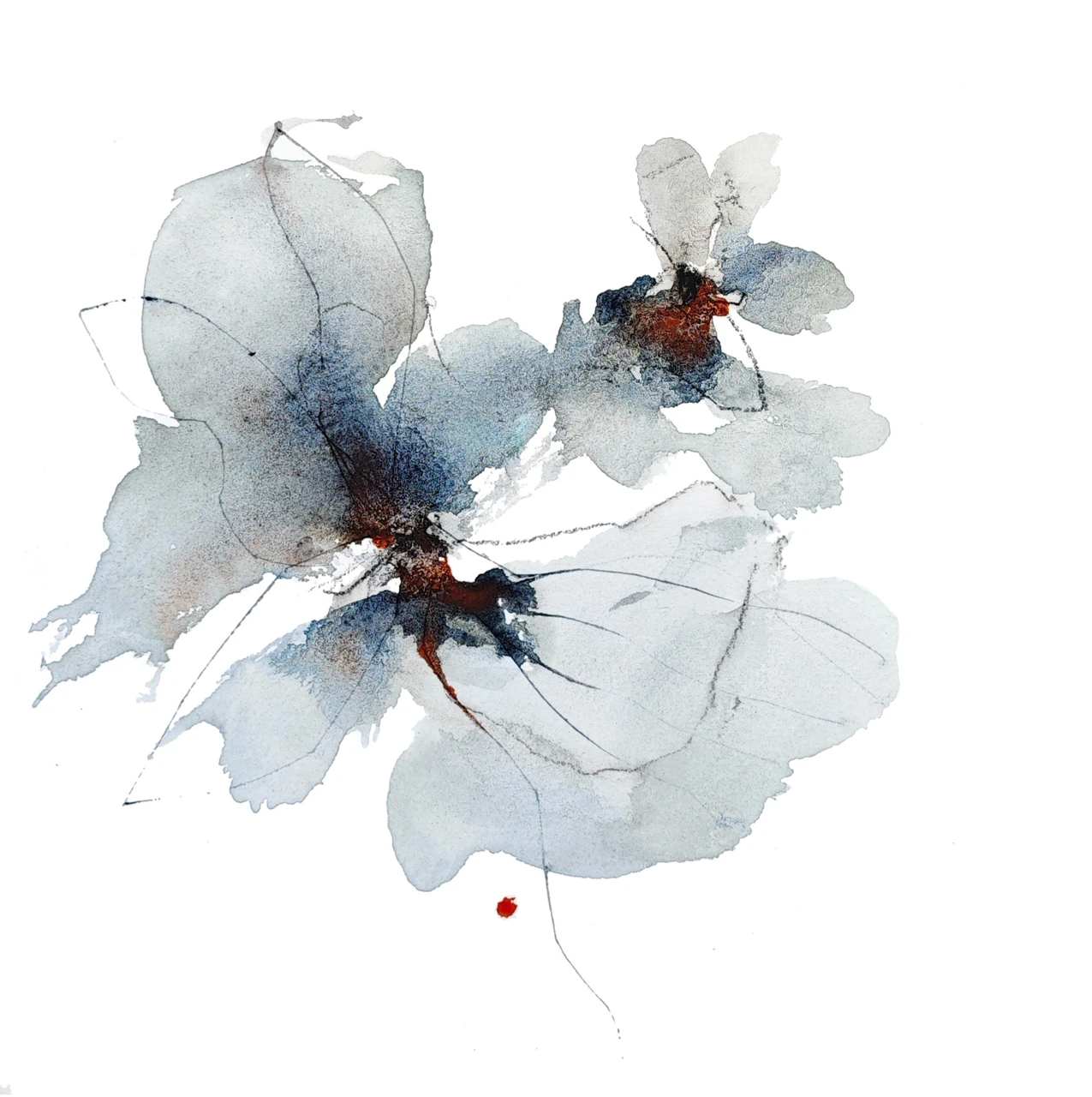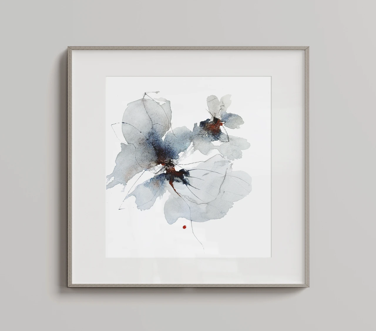 Картина «Точка возврата» воплощает нежную гармонию абстрактных цветов, написанных в сдержанной серо-голубой гамме с тонкими акцентами красного. Минималистичная композиция использует свободное пространство, где мягкие размытые формы и легкие графичные линии создают ощущение воздушности и умиротворения. Элегантное сочетание оттенков и лаконичность исполнения передают настроение тихой созерцательности.