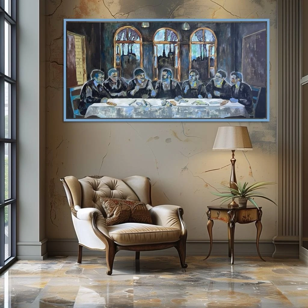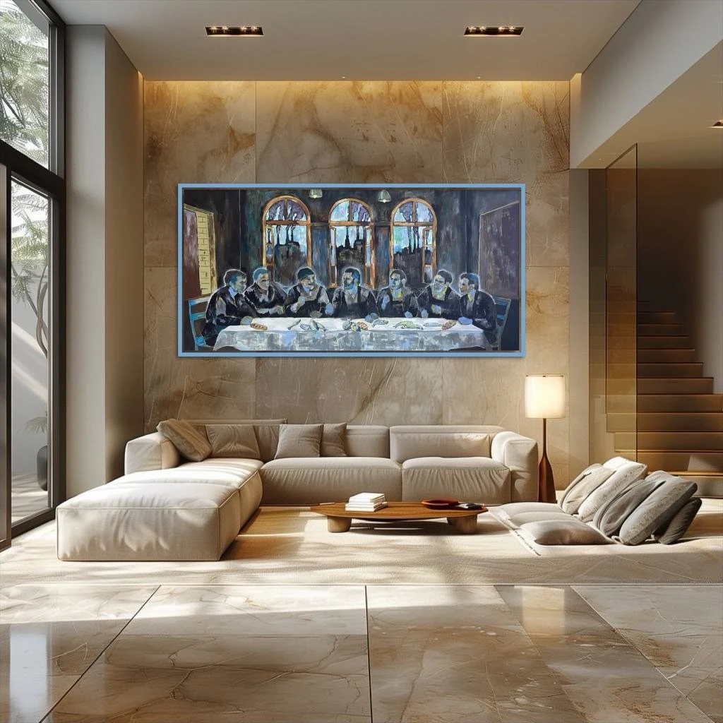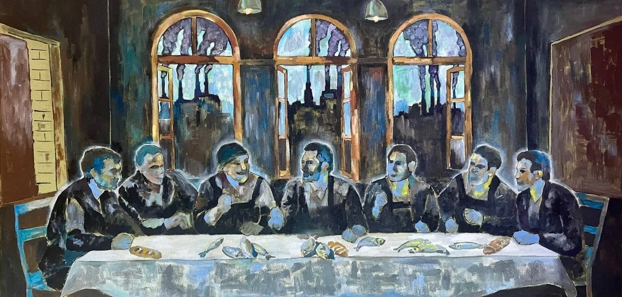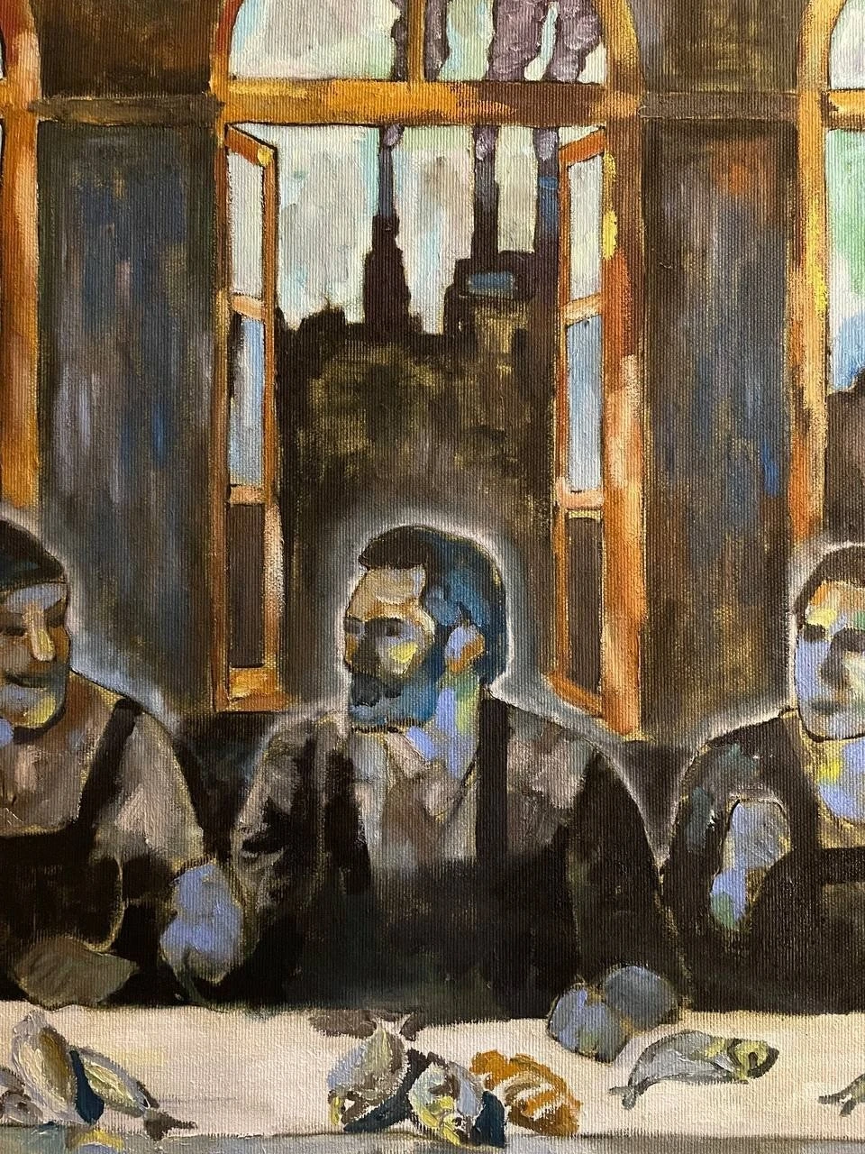 Это моя интерпретация классической композиции, переосмысленная через призму темы «рабочий человек». Семь фигур, одетых в простую рабочую одежду, сидят за столом, покрытым грубой скатертью, с минималистичным угощением — хлебом и рыбой. Их лица, отмеченные усталостью и суровостью, передают тяжесть труда и солидарность. За окнами виднеются дымящие заводские трубы, подчеркивающие индустриальный контекст и борьбу рабочего класса за выживание. Тёмная палитра и экспрессивные мазки усиливают ощущение напряжения и единства, делая произведение глубоким размышлением о коллективной судьбе трудящихся.