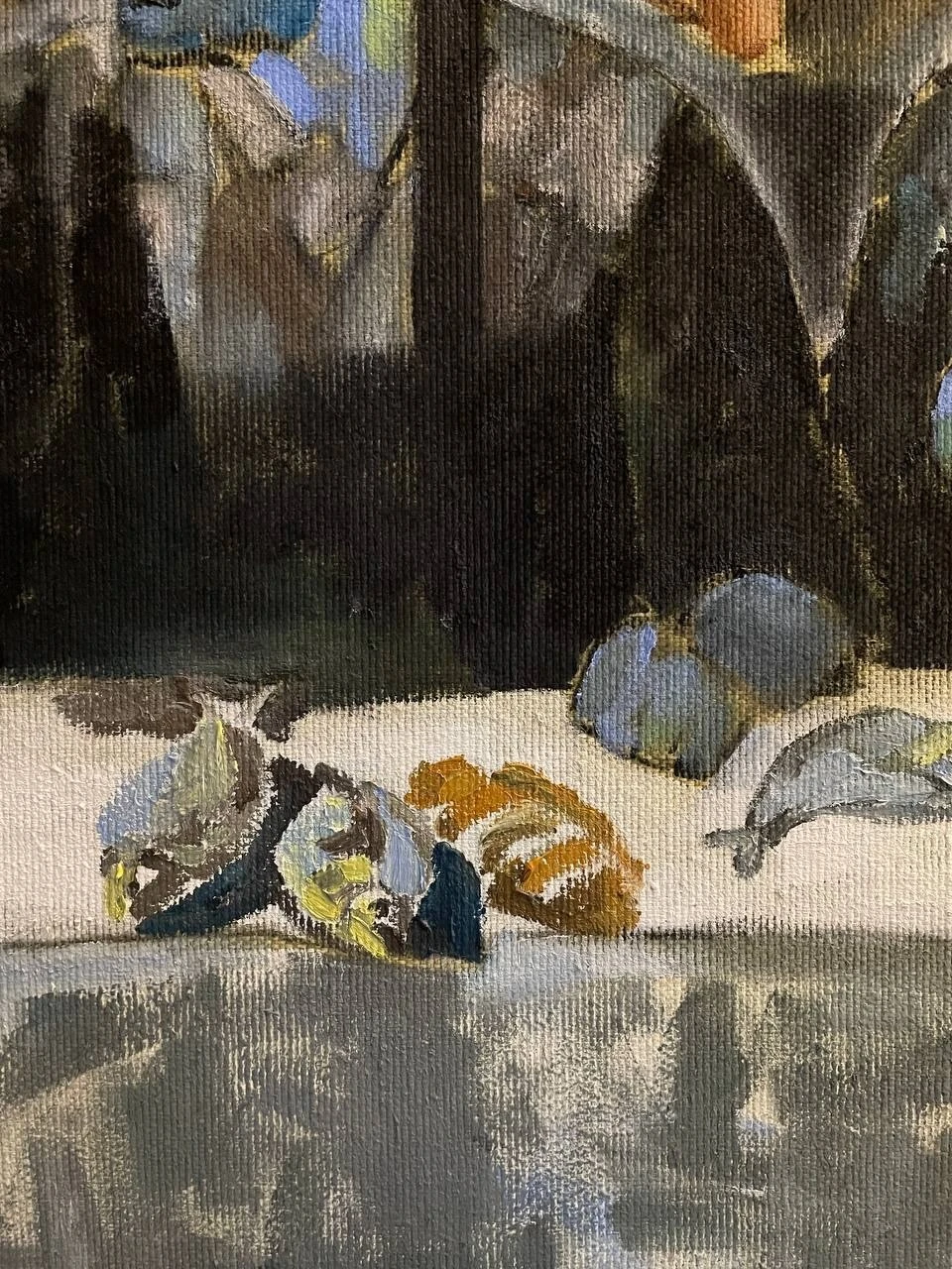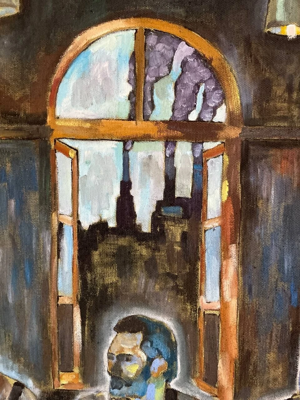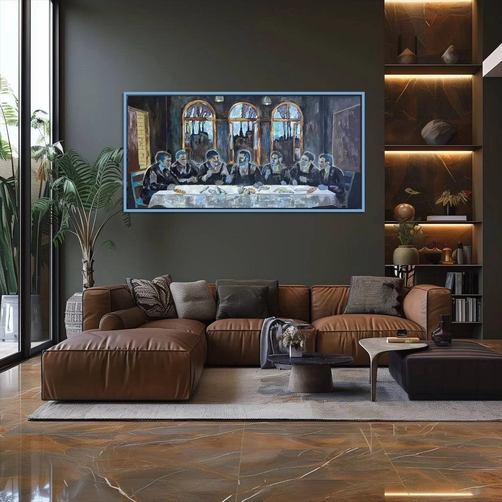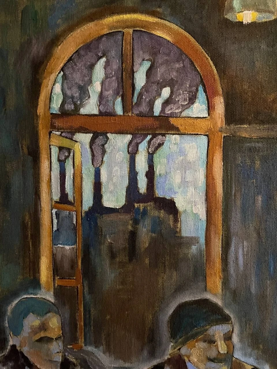 Это моя интерпретация классической композиции, переосмысленная через призму темы «рабочий человек». Семь фигур, одетых в простую рабочую одежду, сидят за столом, покрытым грубой скатертью, с минималистичным угощением — хлебом и рыбой. Их лица, отмеченные усталостью и суровостью, передают тяжесть труда и солидарность. За окнами виднеются дымящие заводские трубы, подчеркивающие индустриальный контекст и борьбу рабочего класса за выживание. Тёмная палитра и экспрессивные мазки усиливают ощущение напряжения и единства, делая произведение глубоким размышлением о коллективной судьбе трудящихся.