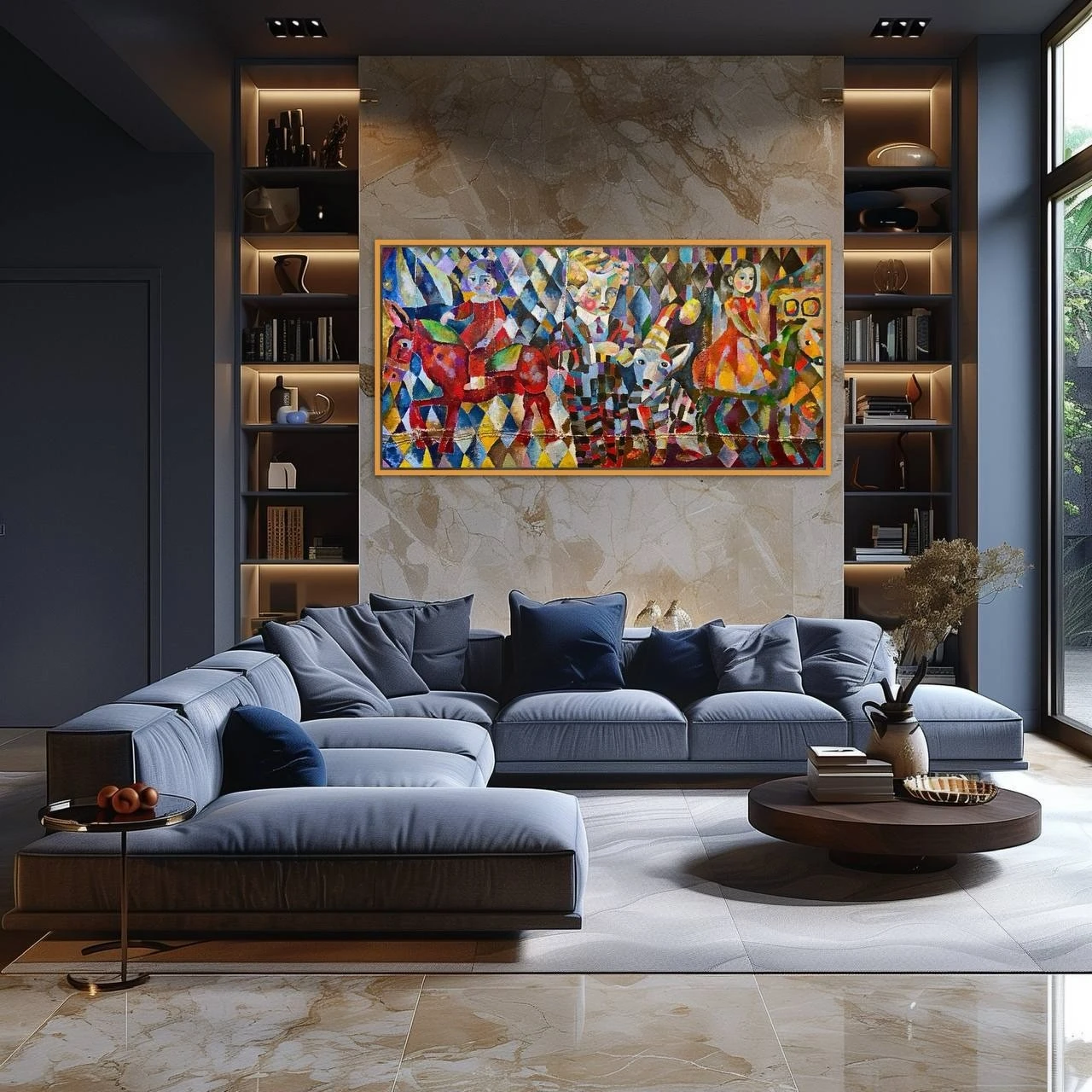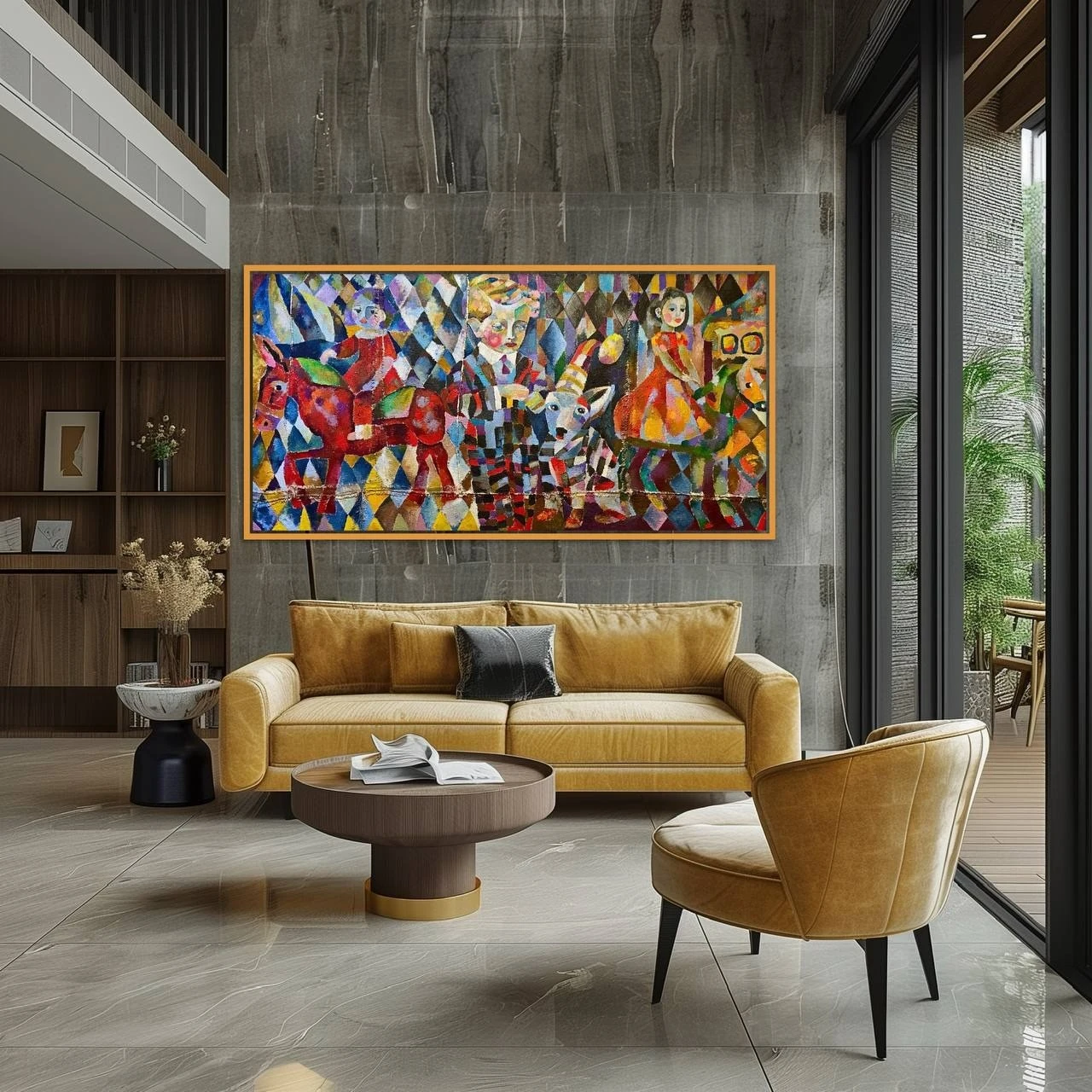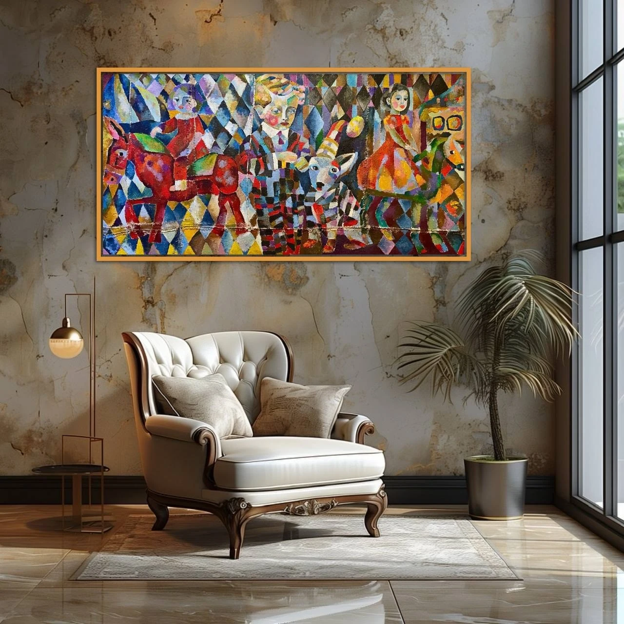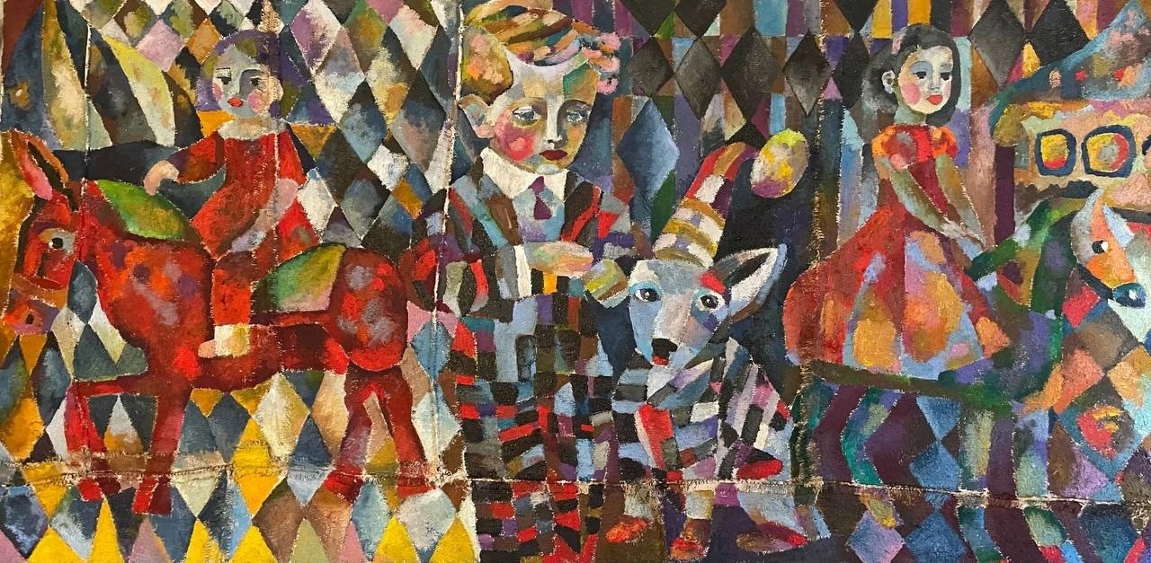 Эта картина выполнена на сшитых кофейных пакетах. Мне очень нравится использовать старые кофейные пакеты вместо традиционного холста в серии «ЦИРК». Это дает уникальную фактуру и глубину.