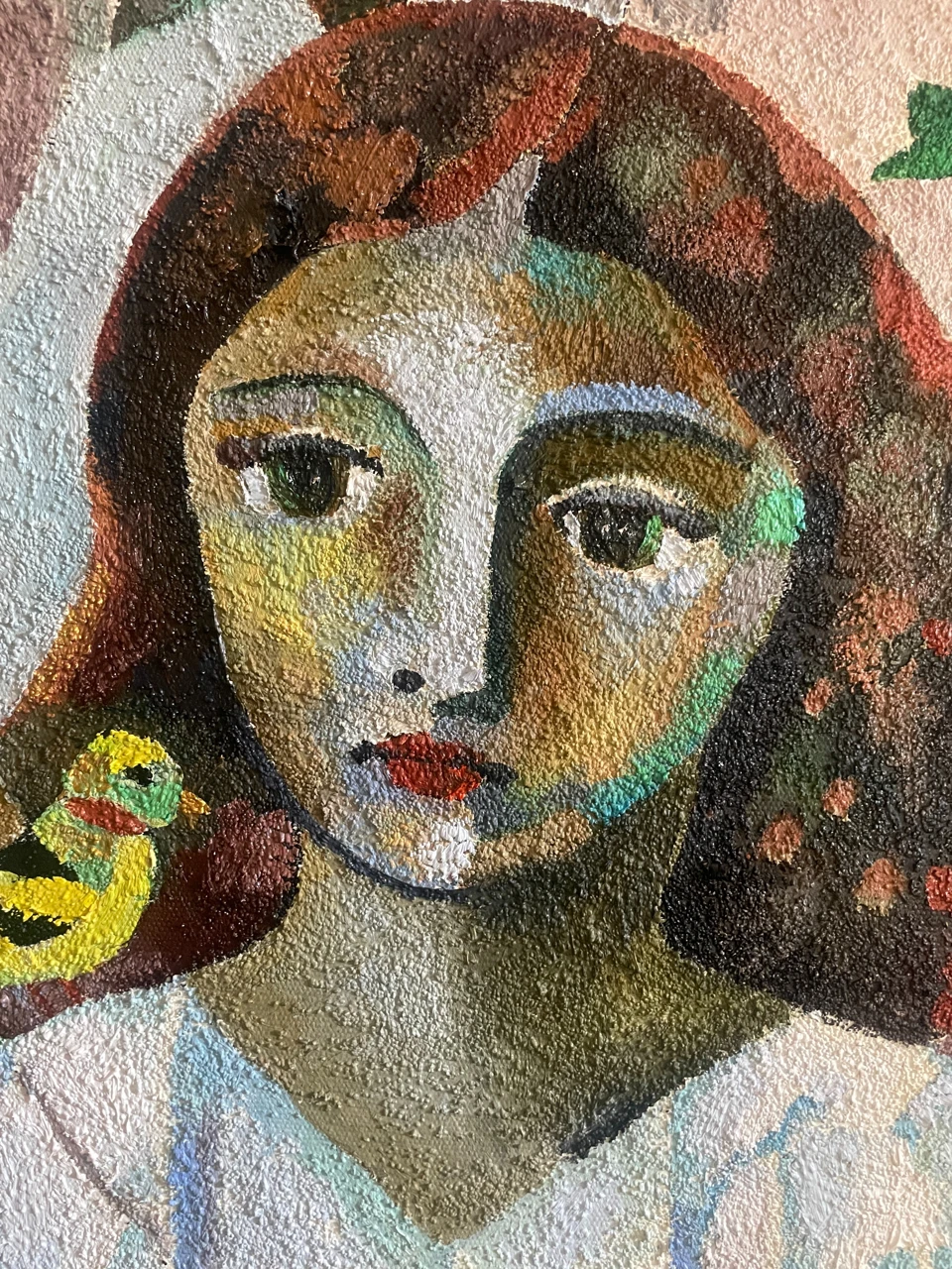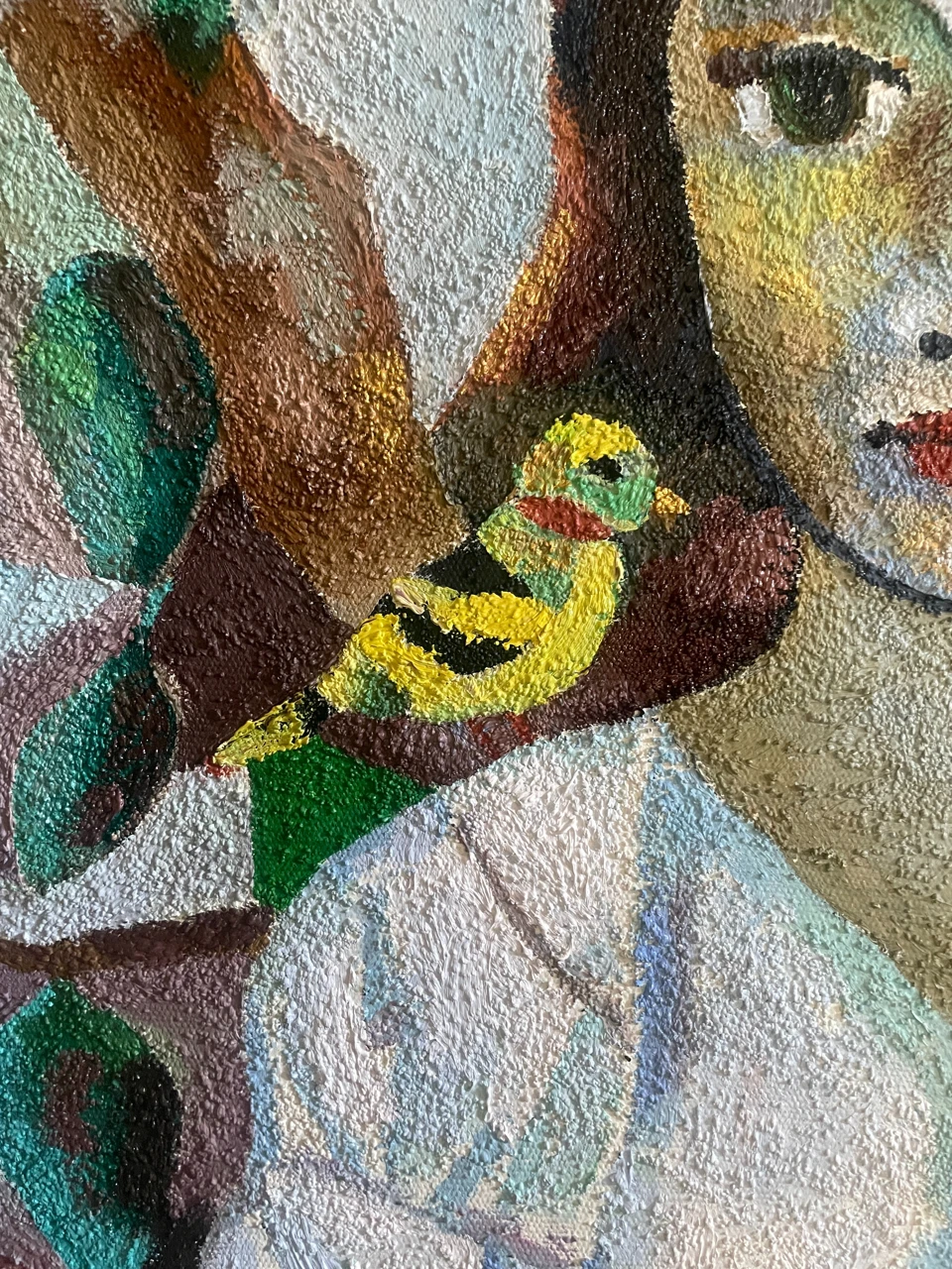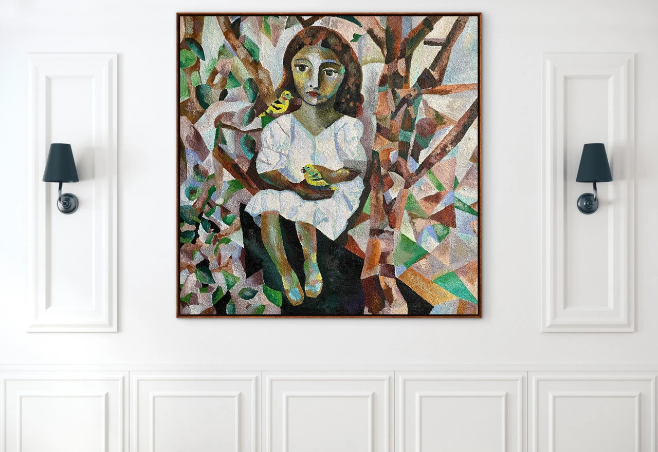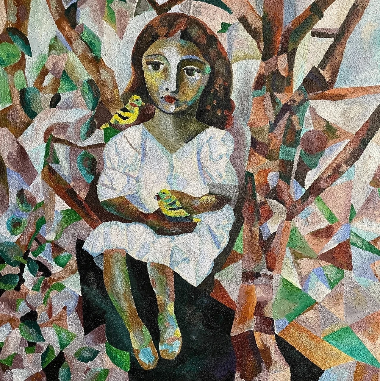 Работа «ПТИЧКИ МОИ» — это авторская живописная композиция, выполненная на брезенте с использованием масла и песка. На полотне изображена девочка в белом платье, сидящая среди деревьев. Ее взгляд направлен на зрителя, а в руках она держит маленьких желтых птичек. Одна птичка сидит у нее на плече, другая — на ладони. Композиция построена на контрасте между реалистичным изображением фигуры девочки и стилизованным, геометризированным фоном, имитирующим листву и ветви деревьев. Цветовая палитра работы гармонична, с преобладанием зеленых, коричневых и охристых оттенков, дополненных яркими вкраплениями желтого. Фактура, созданная с помощью песка, придает изображению дополнительный объем и тактильность.