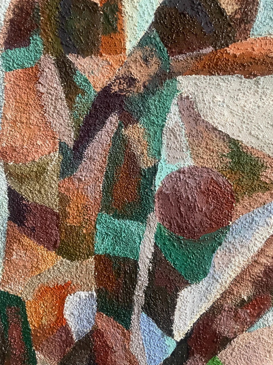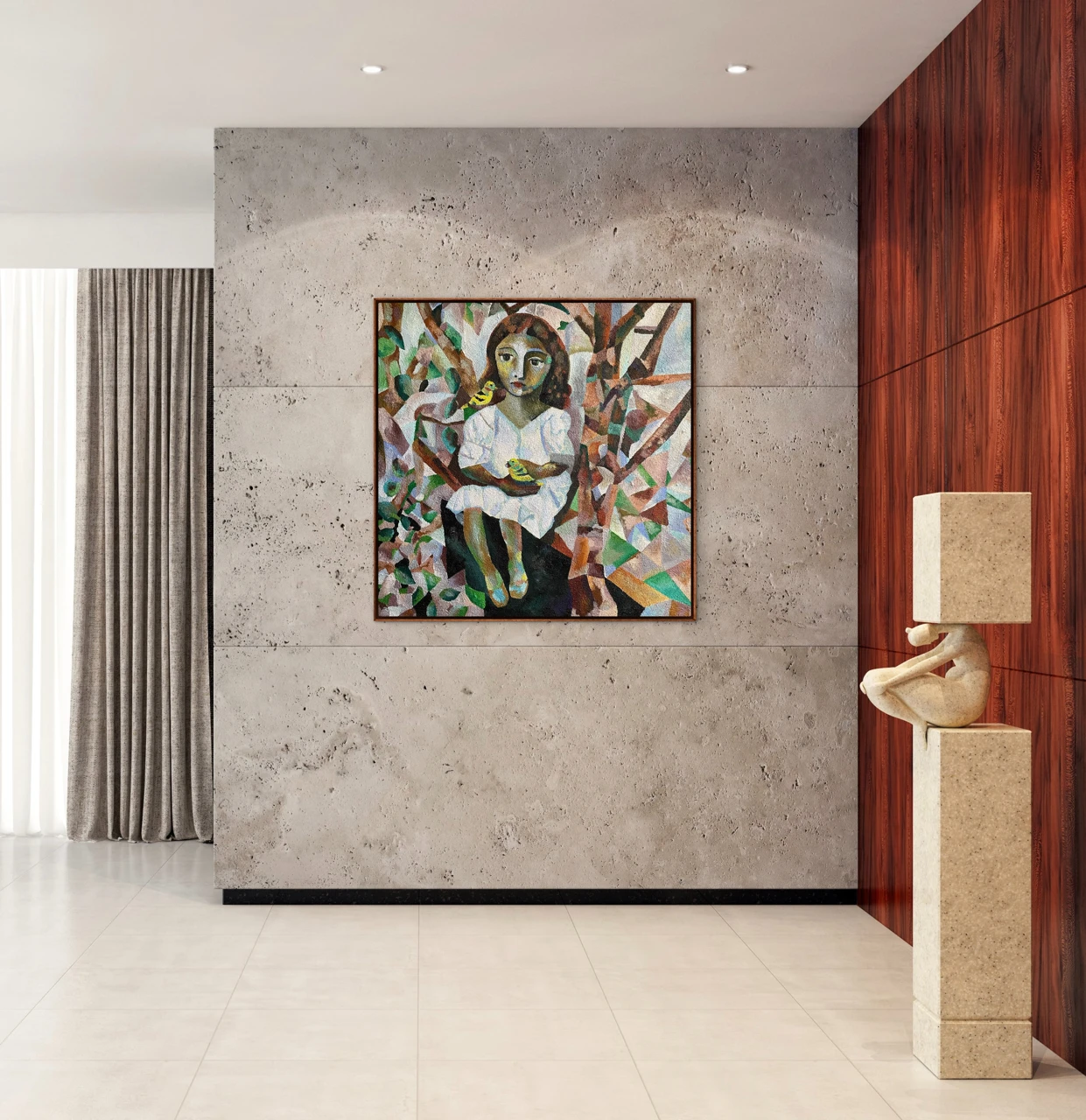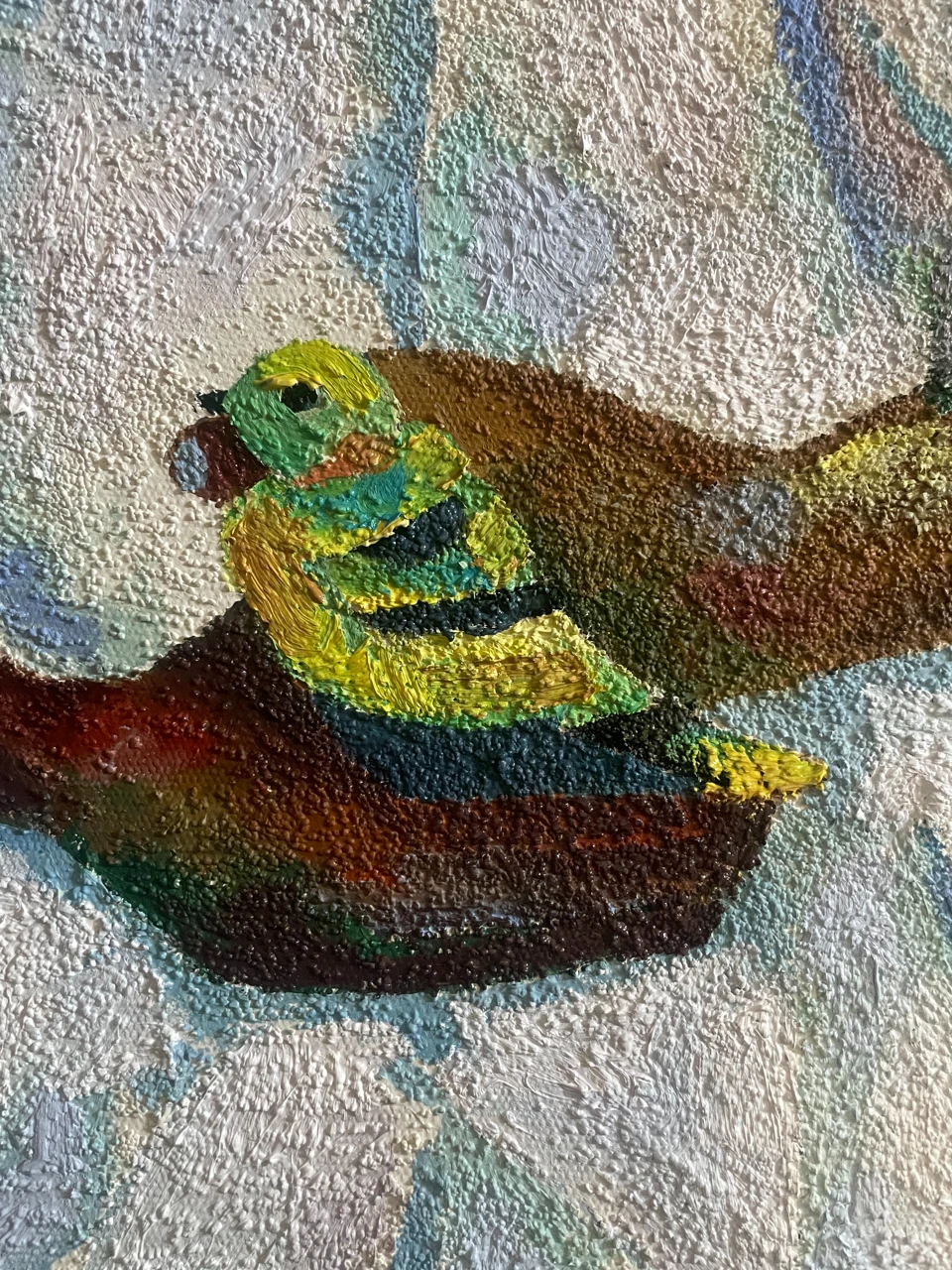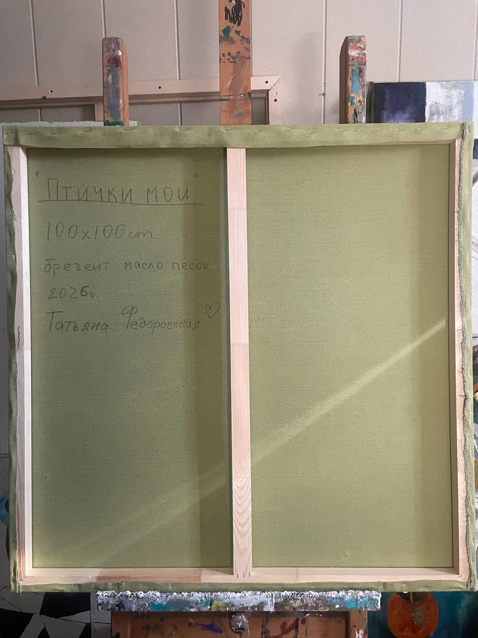 Работа «ПТИЧКИ МОИ» — это авторская живописная композиция, выполненная на брезенте с использованием масла и песка. На полотне изображена девочка в белом платье, сидящая среди деревьев. Ее взгляд направлен на зрителя, а в руках она держит маленьких желтых птичек. Одна птичка сидит у нее на плече, другая — на ладони. Композиция построена на контрасте между реалистичным изображением фигуры девочки и стилизованным, геометризированным фоном, имитирующим листву и ветви деревьев. Цветовая палитра работы гармонична, с преобладанием зеленых, коричневых и охристых оттенков, дополненных яркими вкраплениями желтого. Фактура, созданная с помощью песка, придает изображению дополнительный объем и тактильность.